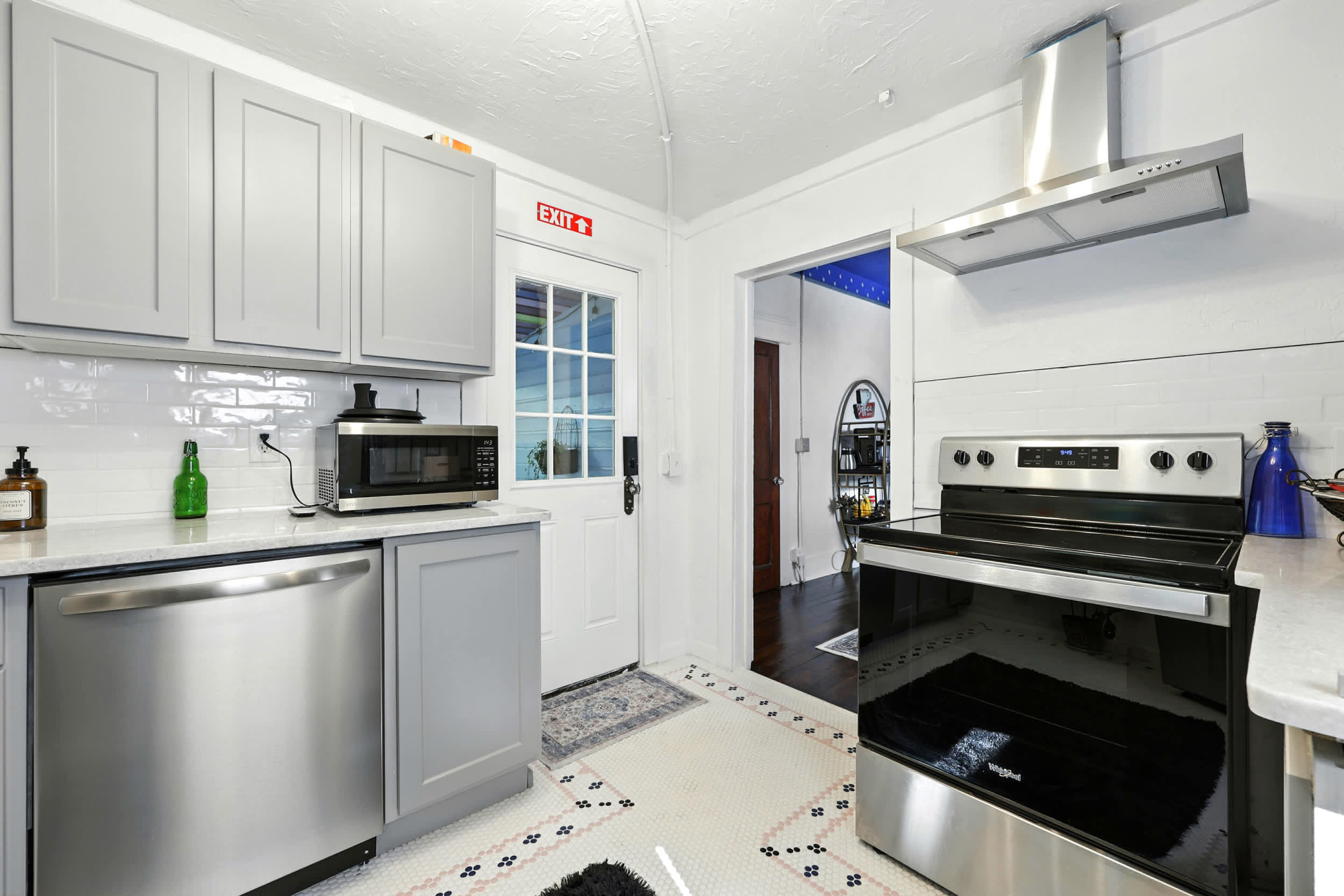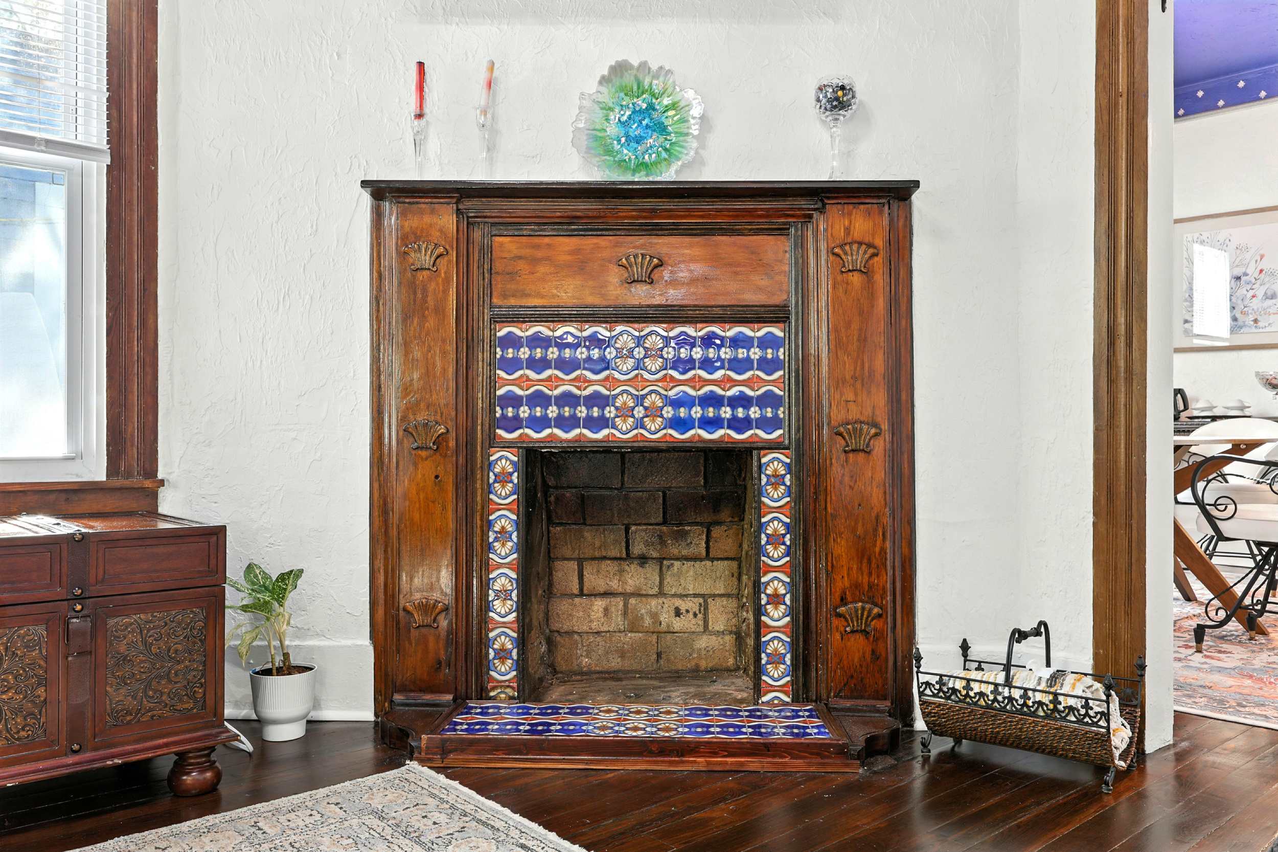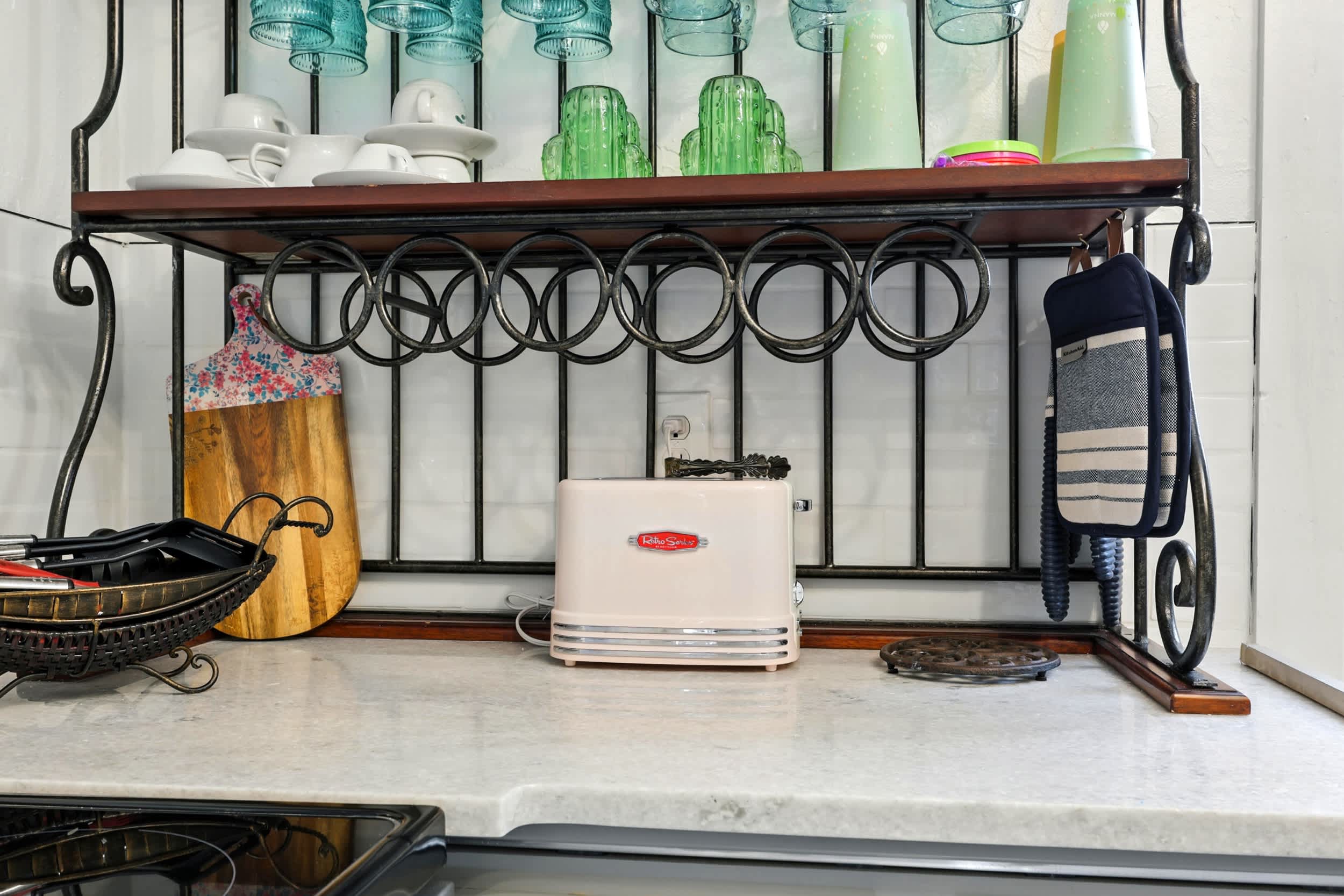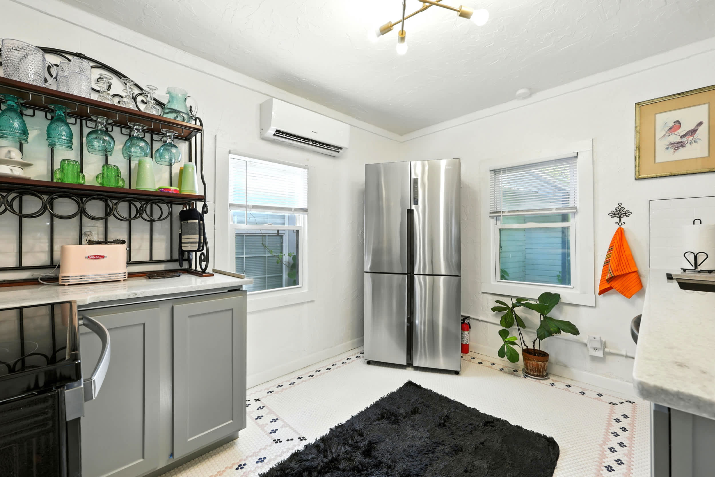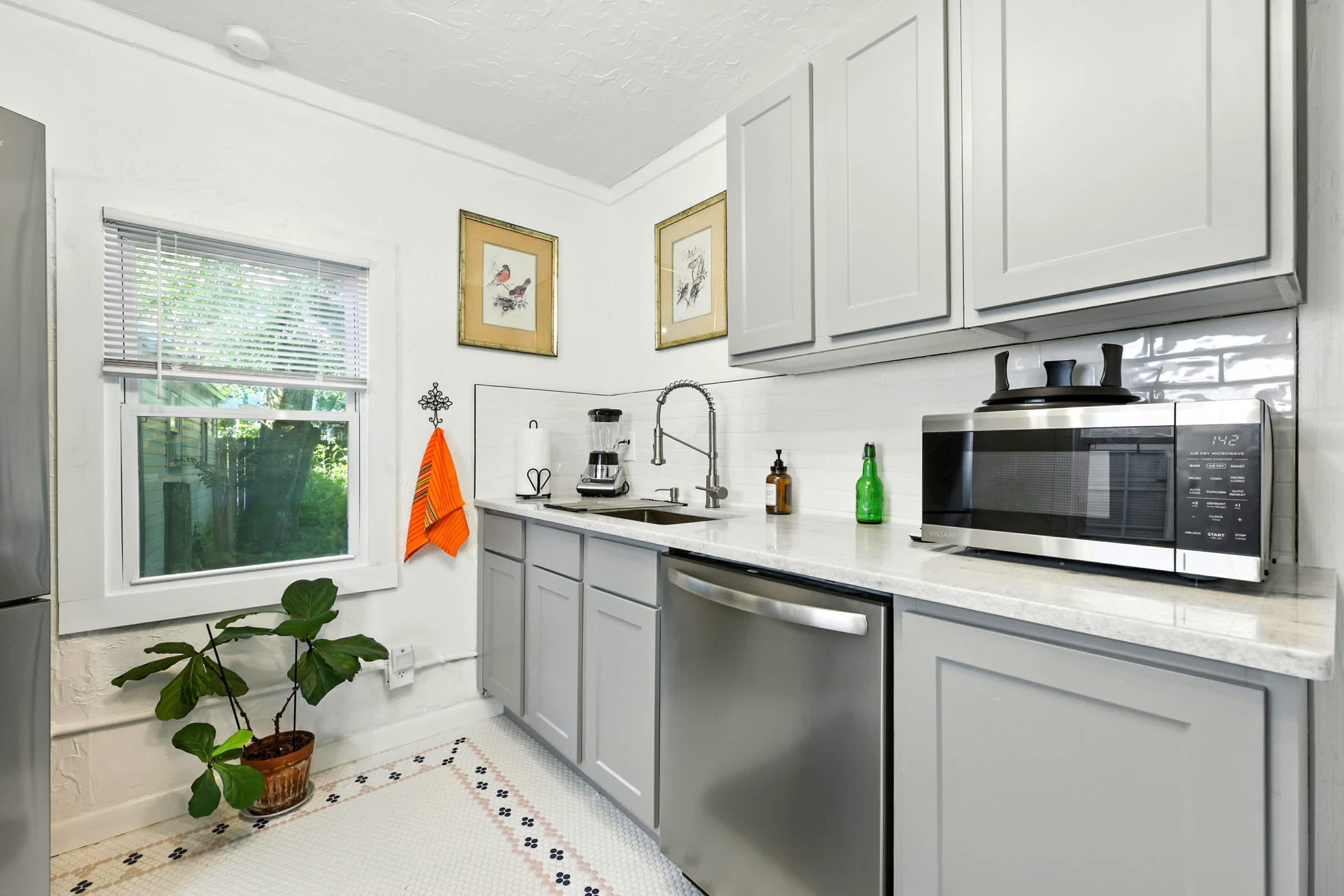 Inside, Periwinkle Perch blends timeless charm with modern comforts. Step into the formal living room, where a cozy couch, inviting accent chair, and smart TV surround a decorative fireplace that pays tribute to the home’s past. The kitchen is a unique blend of old and new, featuring antique dining chairs reupholstered in fresh fabric, stainless steel appliances, and a thoughtfully curated coffee bar with a Nespresso, Keurig, and drip coffee maker to suit every caffeine craving. Share meals at the dining table for six, or start your day with coffee on the front porch, enjoying the quiet energy of the neighborhood.