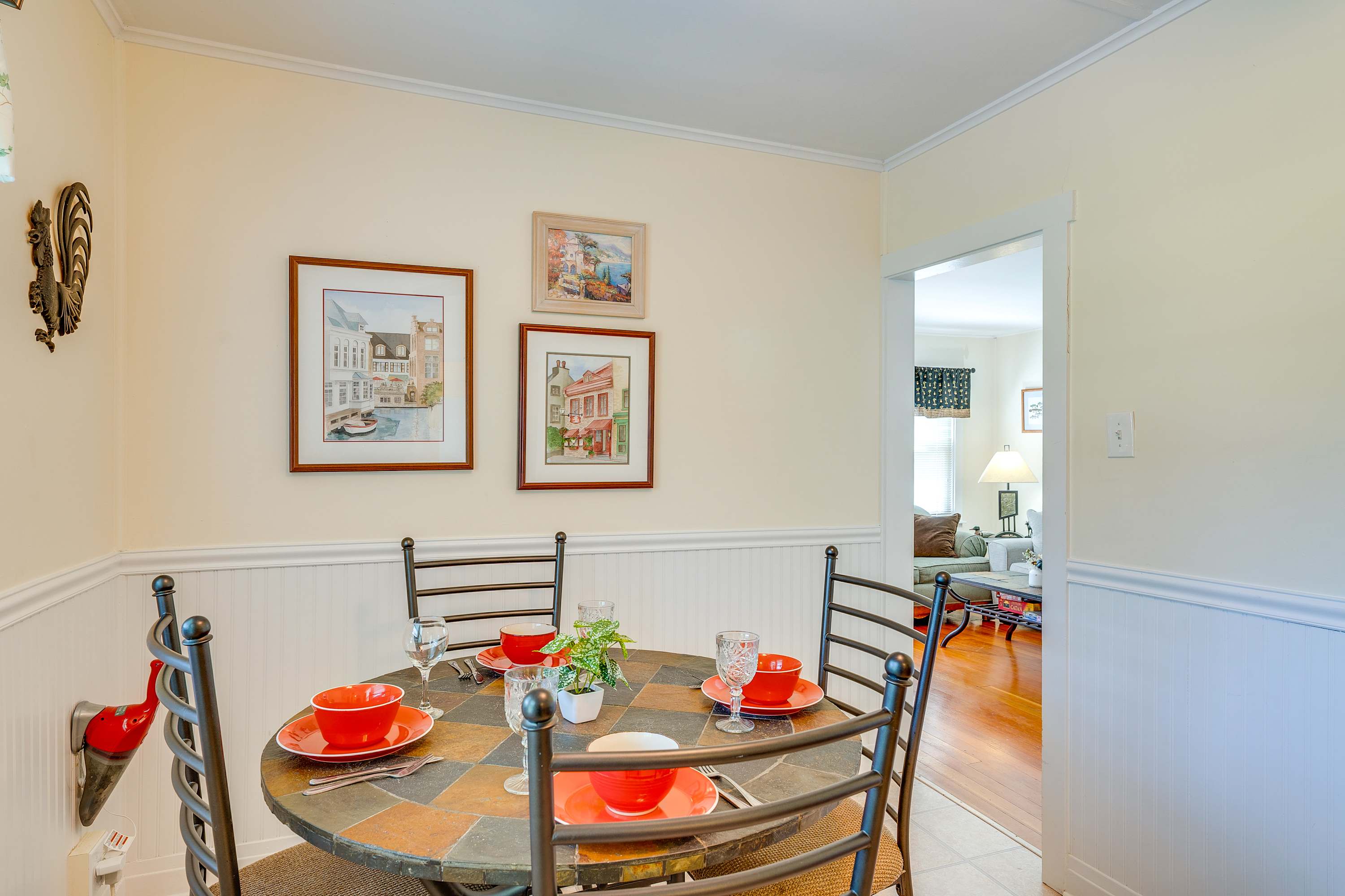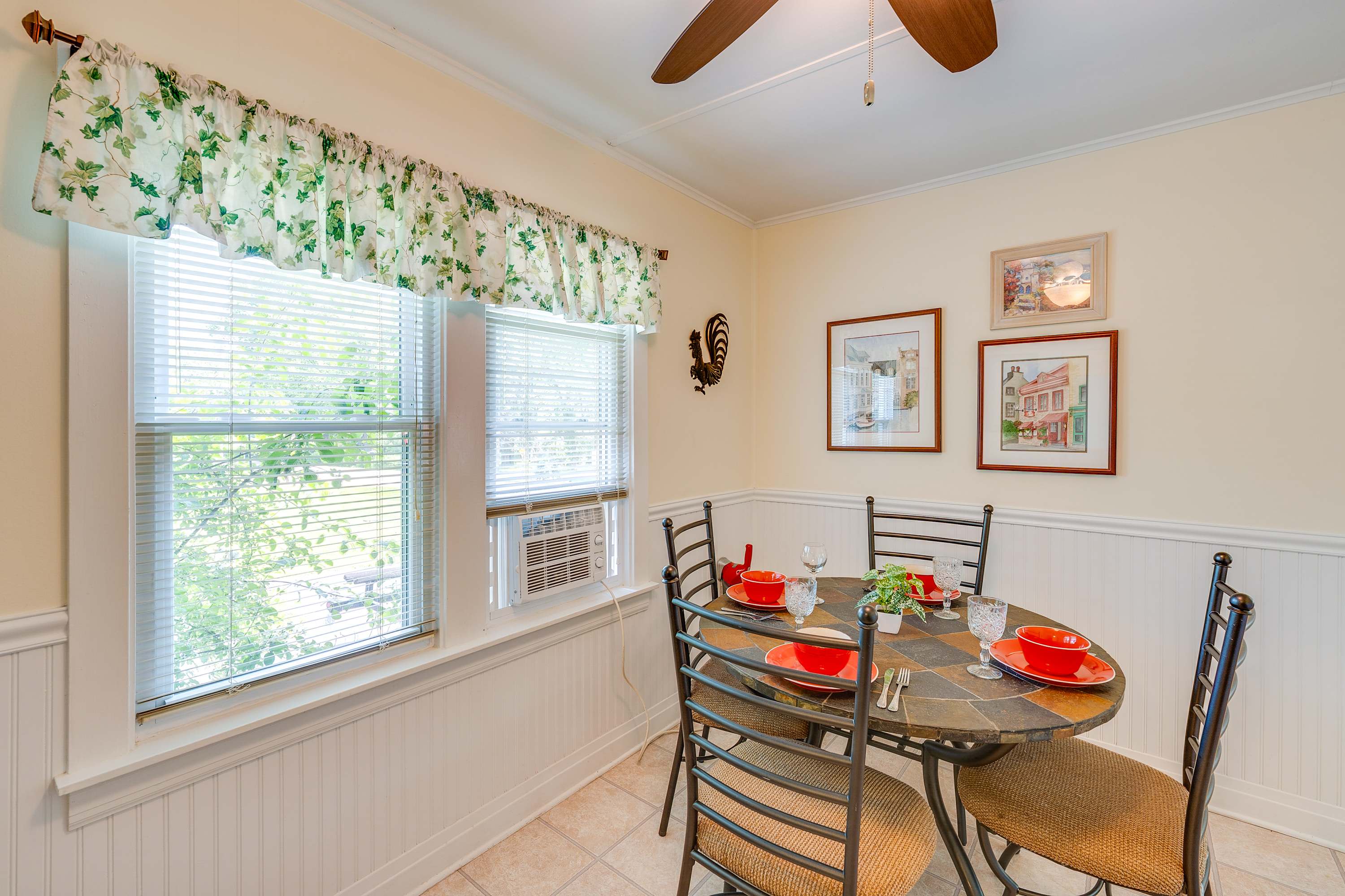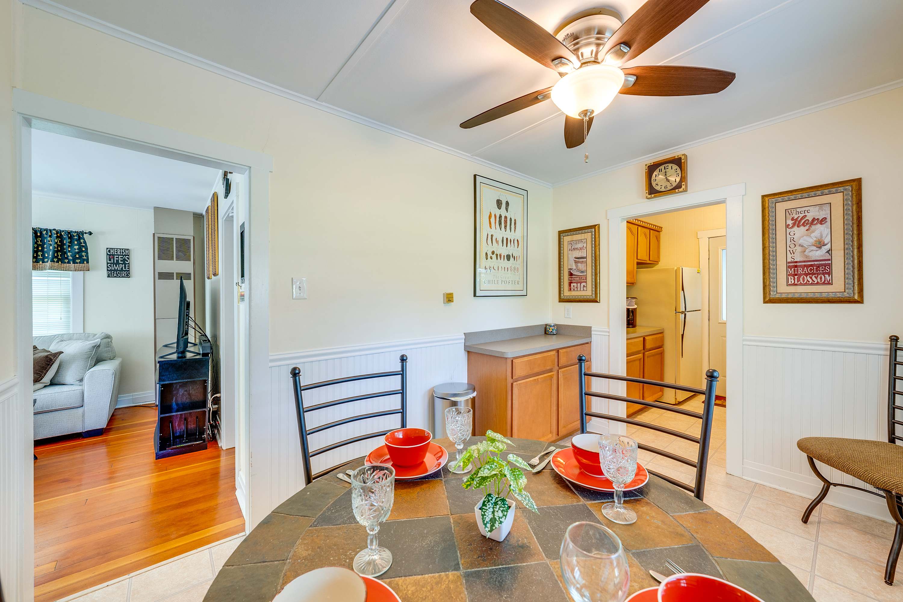Start your mornings on the front patio, sipping coffee as the neighborhood slowly comes to life. Inside, the living room welcomes you with a warm, inviting vibe—featuring a comfy couch, a love seat, an accent chair, and a fireplace that adds a touch of cozy charm. A smart TV is ready for movie nights or catching up on your favorite shows. The kitchen, while compact, is thoughtfully equipped with everything you need to prepare home-cooked meals, and the adjacent dining table seats four for shared meals or game nights. Out back, the private patio is perfect for evenings under the stars—gather around the firepit, grill dinner, and enjoy al fresco dining at the table for six. With lake access nearby and all the comforts of home, this Lake Geneva retreat is your perfect getaway.