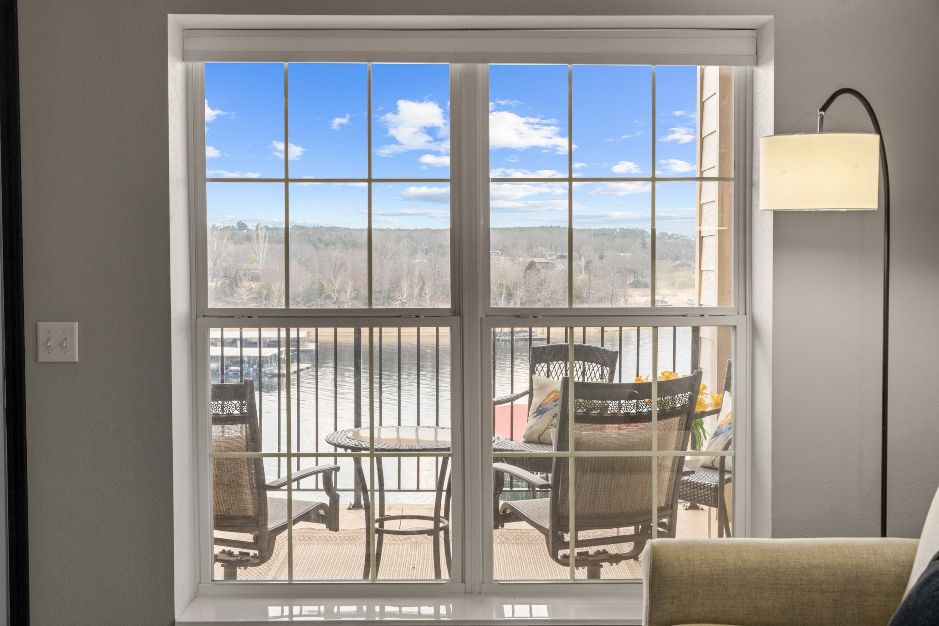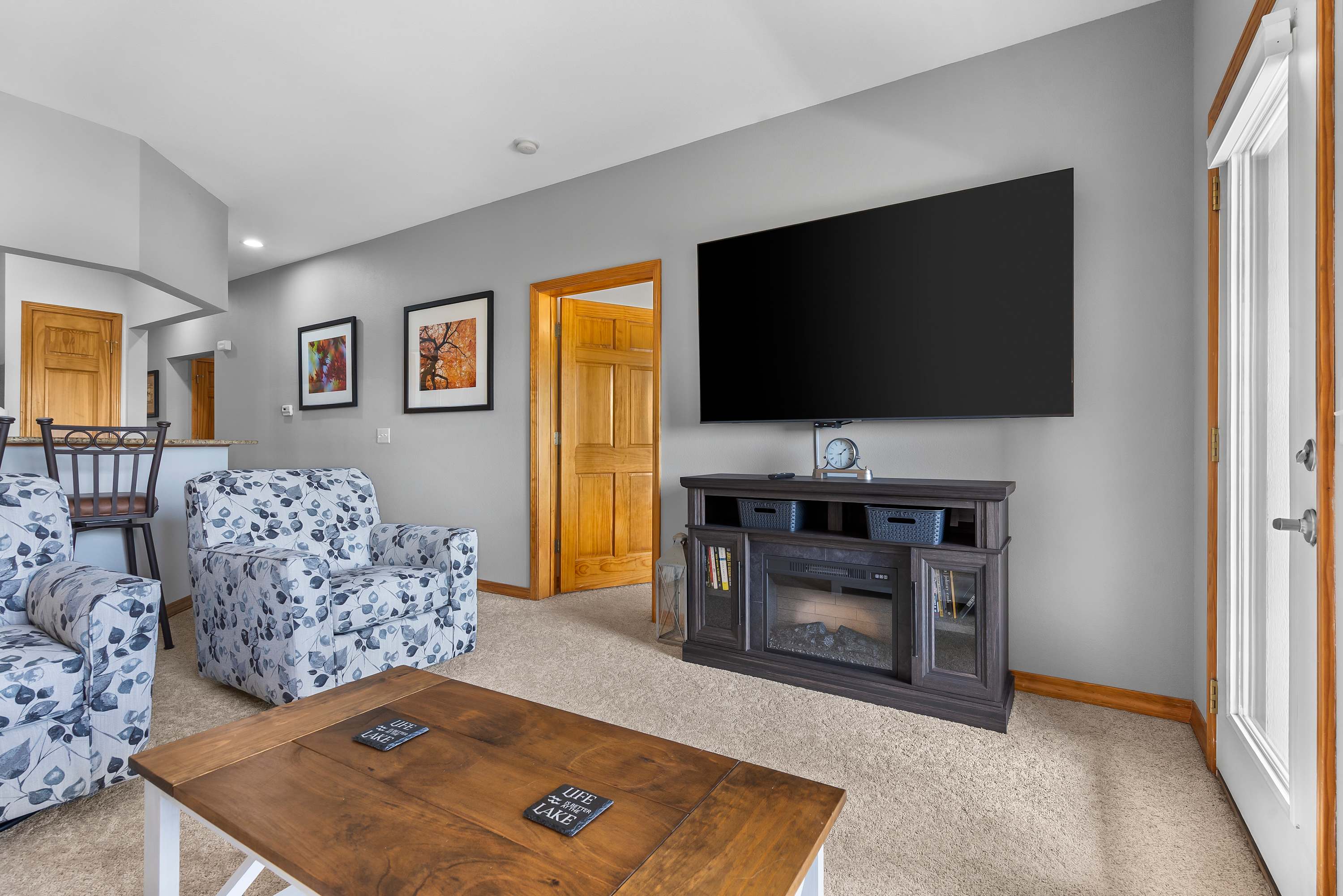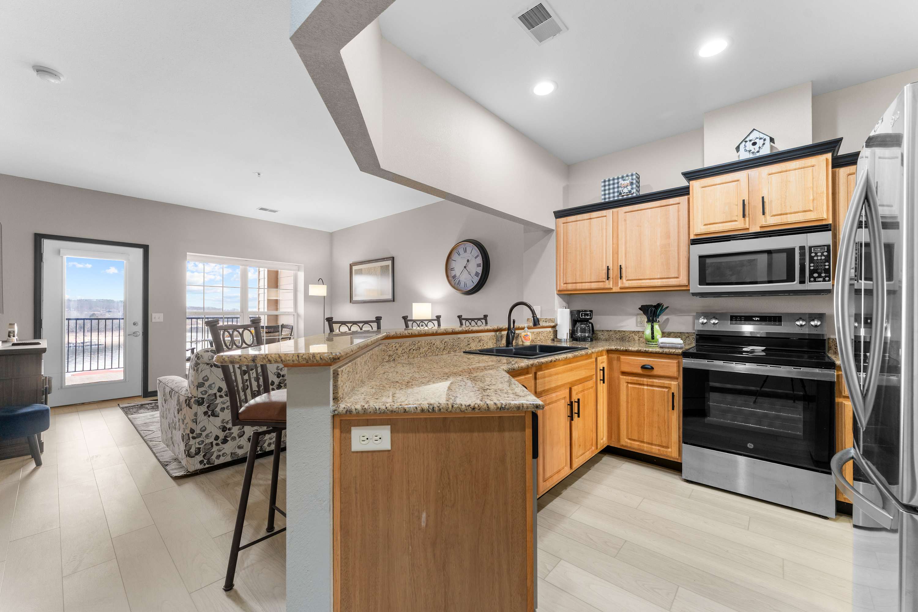 Step inside to find a bright, open concept living space designed for comfort and connection. The living room features a plush couch and two armchairs positioned around a wall-mounted TV, while large windows frame stunning lake views and fill the room with natural light. The kitchen is a chef’s dream, with sleek stone countertops, stainless steel appliances, and comfortable counter seating—perfect for morning coffee or evening appetizers. A dining table for six offers space for shared meals or game nights. Open the door to your private deck and take in sweeping lakefront views while dining outdoors at the table for six, firing up the grill, or unwinding in one of the additional lounge chairs.