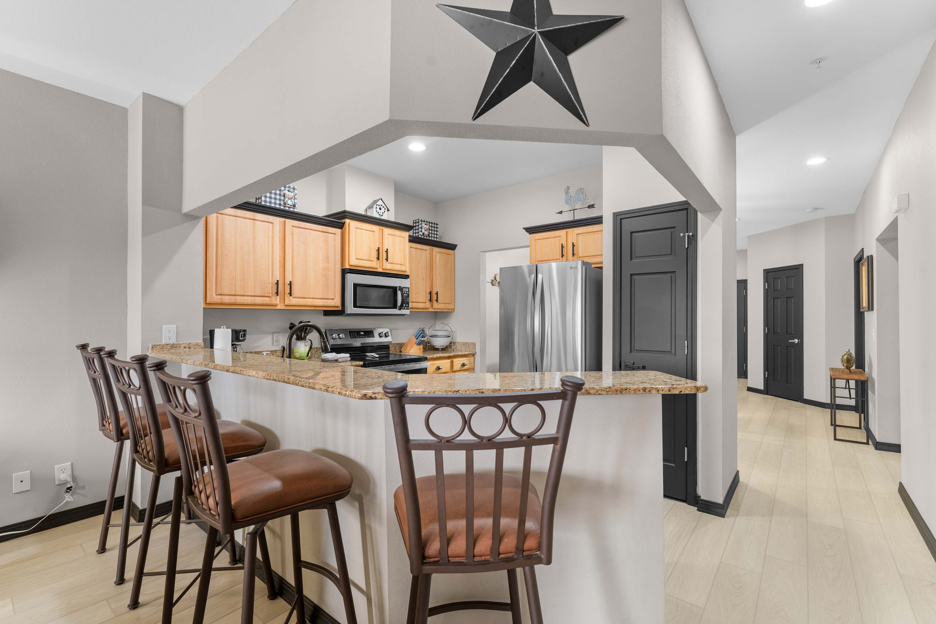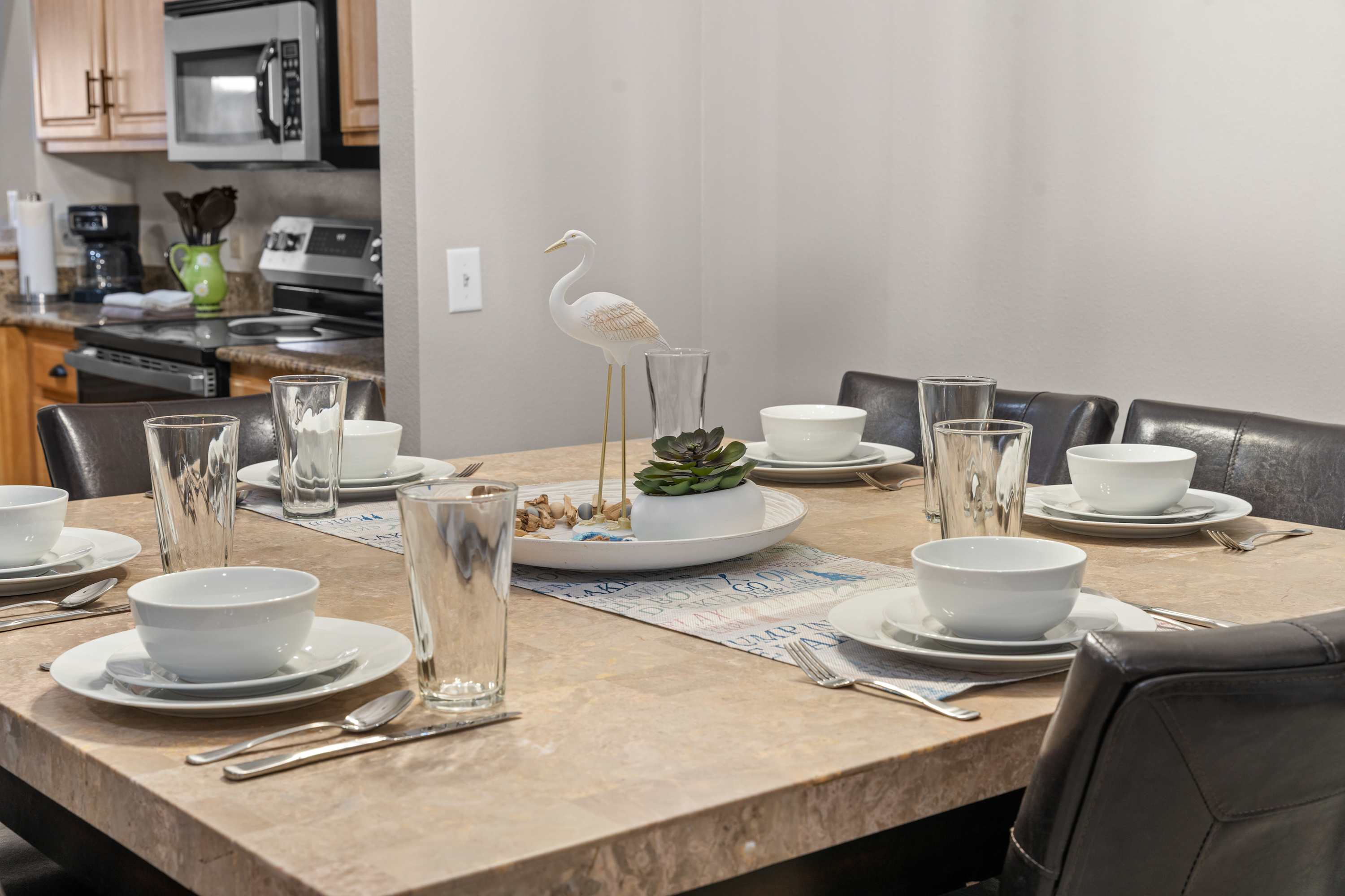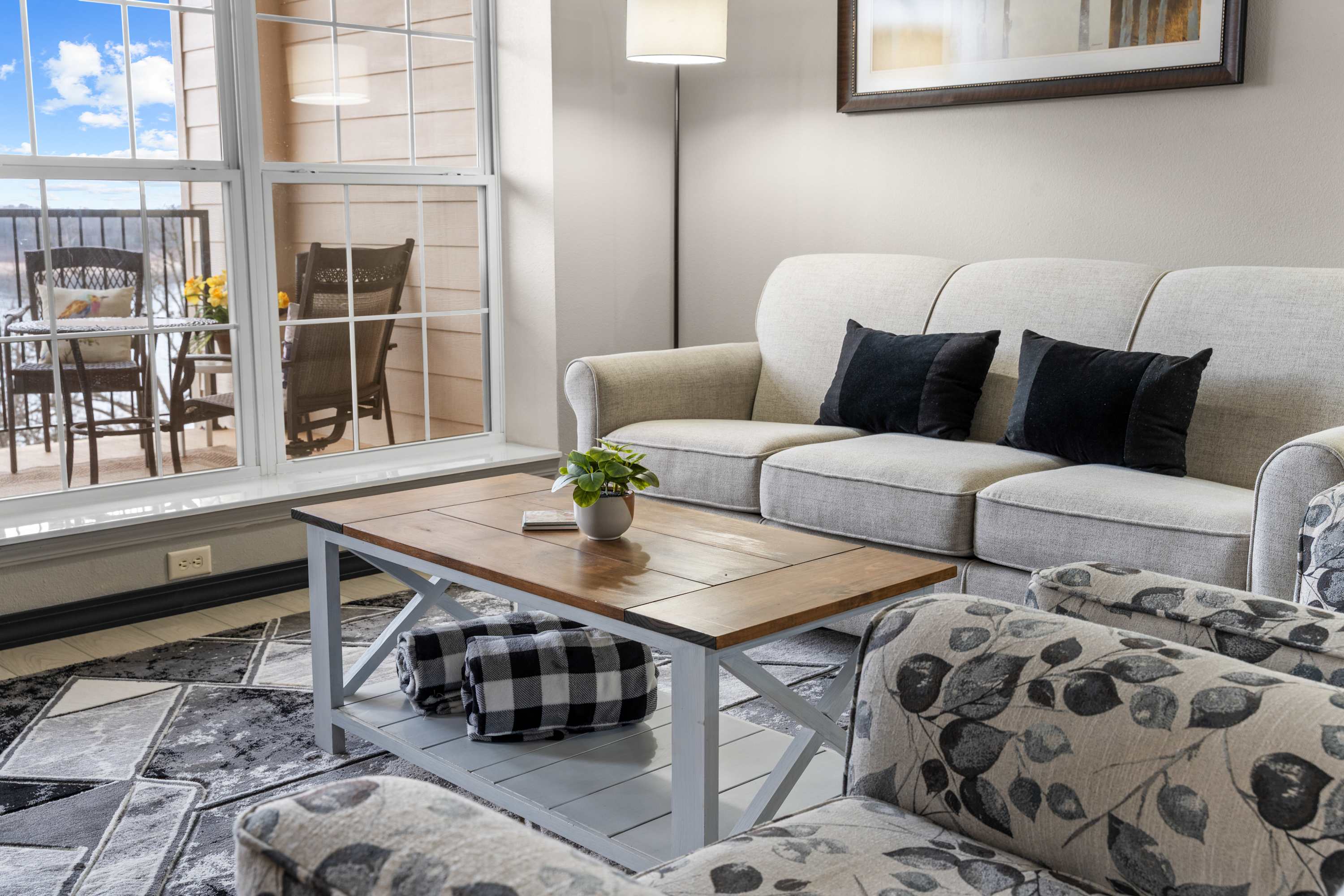 Step inside to find a bright, open concept living space designed for comfort and connection. The living room features a plush couch and two armchairs positioned around a wall-mounted TV, while large windows frame stunning lake views and fill the room with natural light. The kitchen is a chef’s dream, with sleek stone countertops, stainless steel appliances, and comfortable counter seating—perfect for morning coffee or evening appetizers. A dining table for six offers space for shared meals or game nights. Open the door to your private deck and take in sweeping lakefront views while dining outdoors at the table for six, firing up the grill, or unwinding in one of the additional lounge chairs.