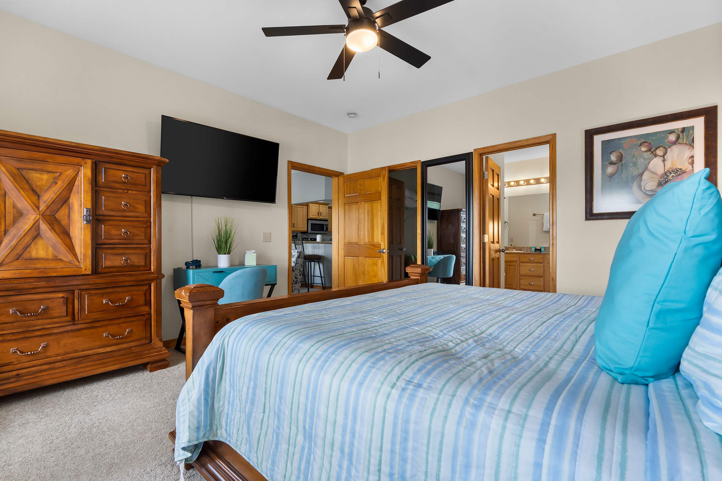 Bedroom #1 includes a king-size bed, a smart TV, and an ensuite bathroom with a single vanity and a shower/tub combo.