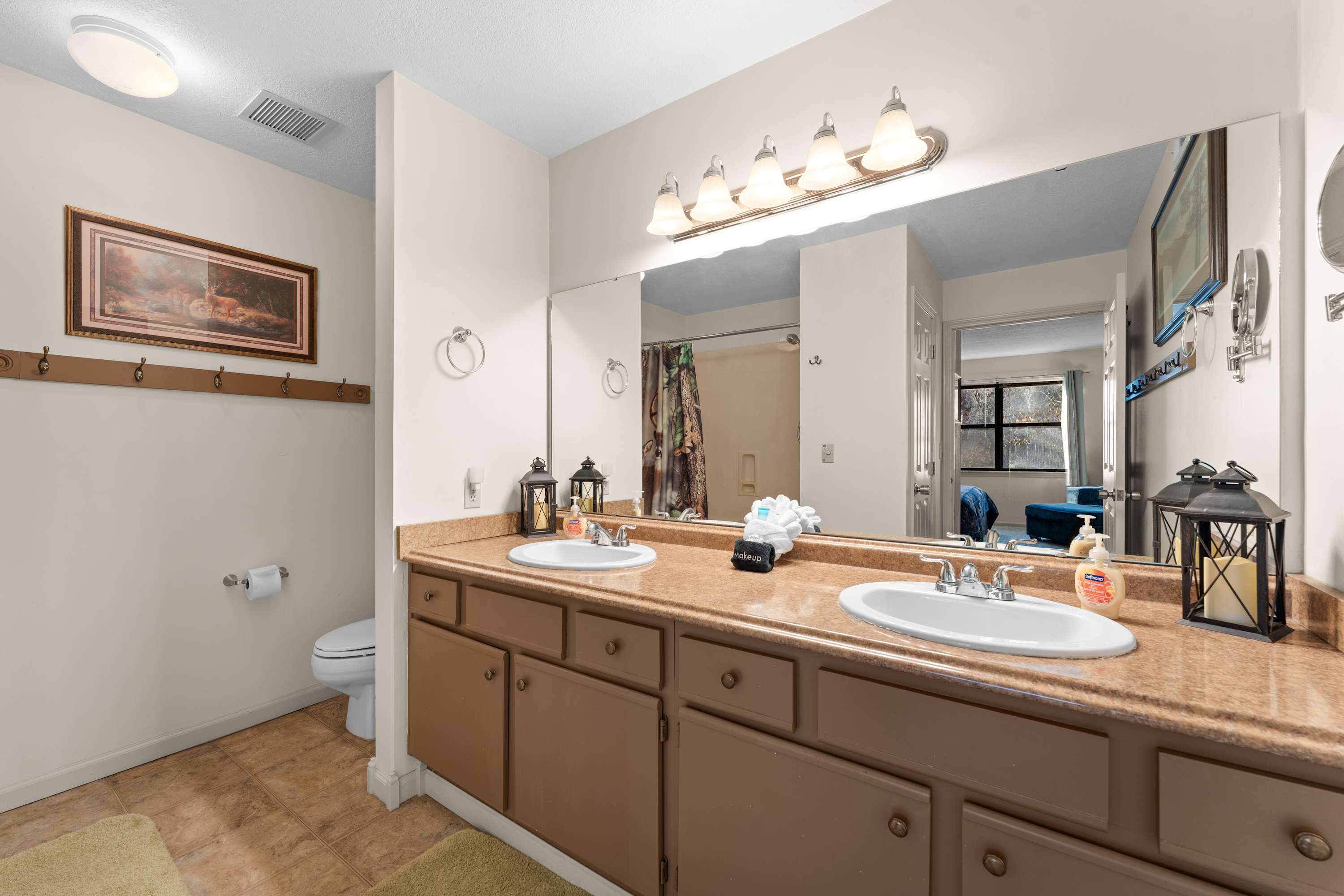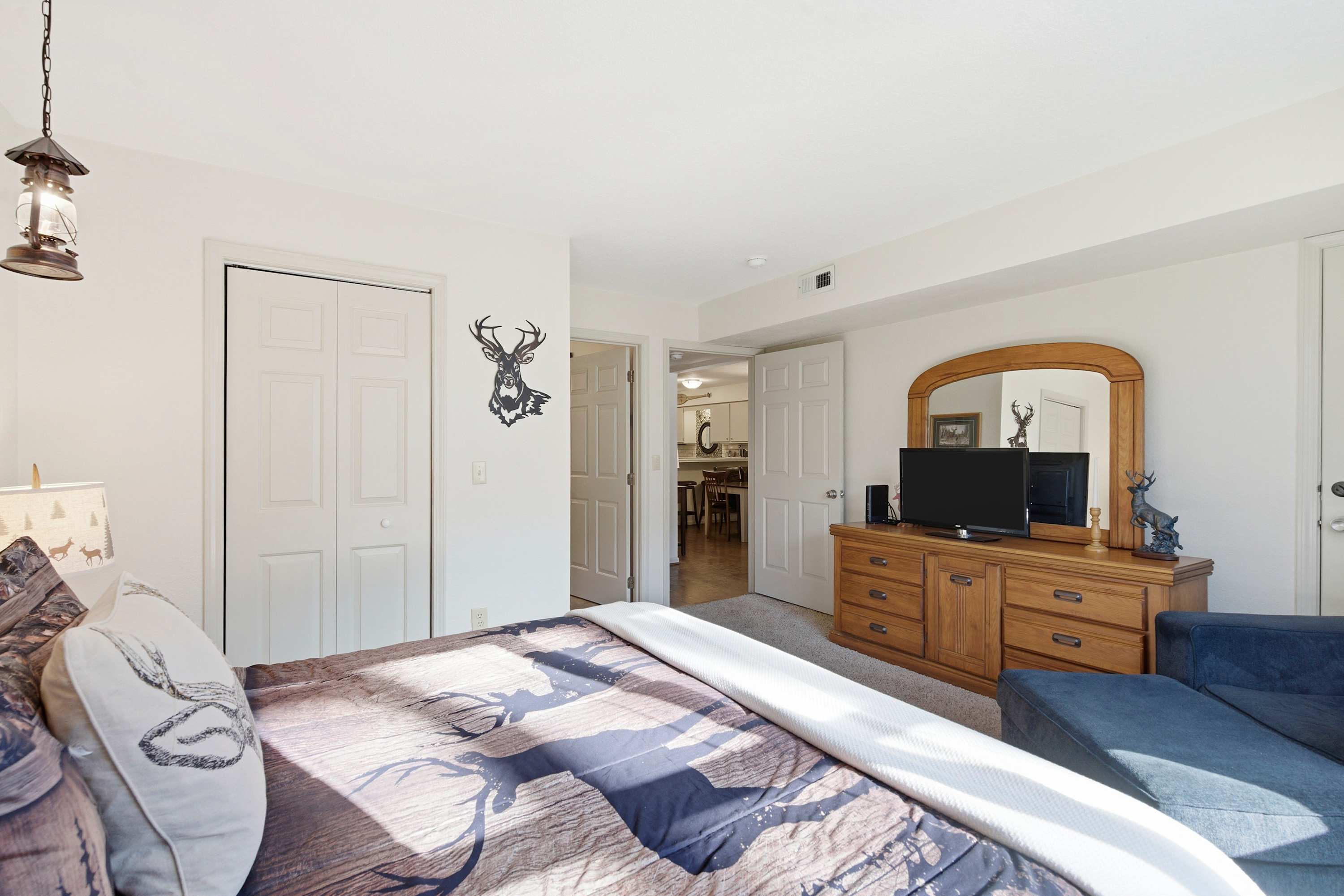 Bedroom #2 includes a king size bed, a TV, deck access, and an ensuite bathroom with a dual vanity and a shower/tub combo.