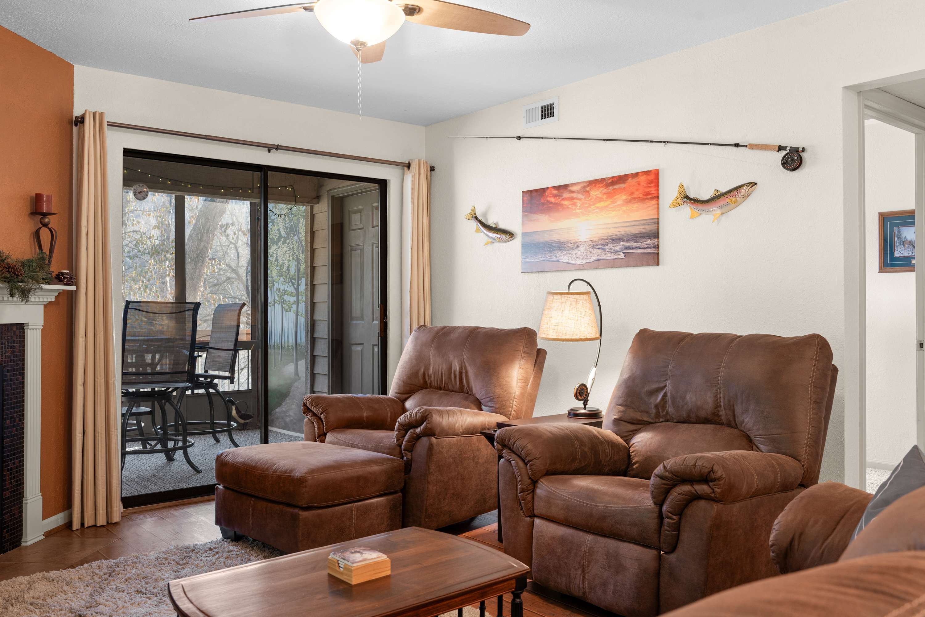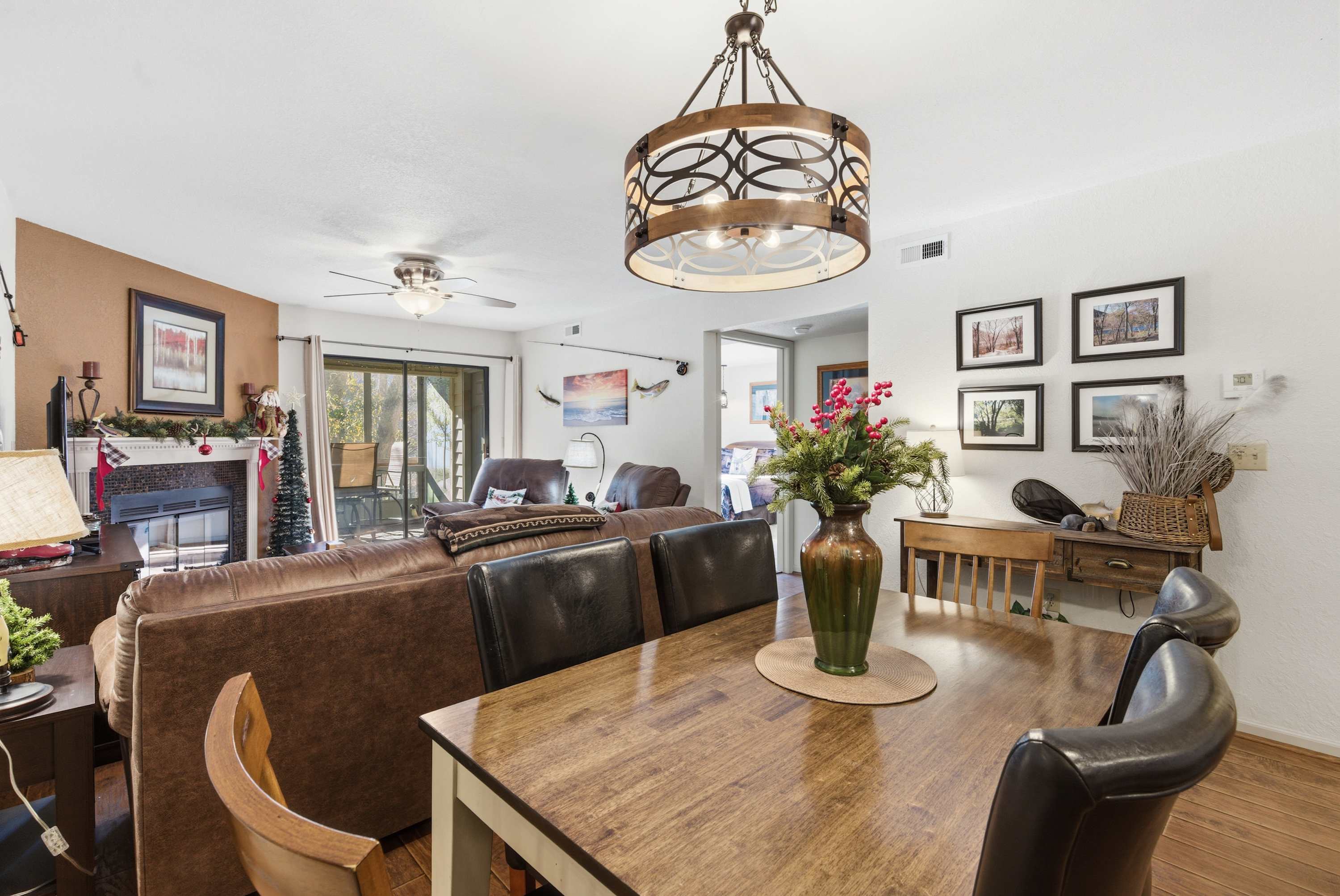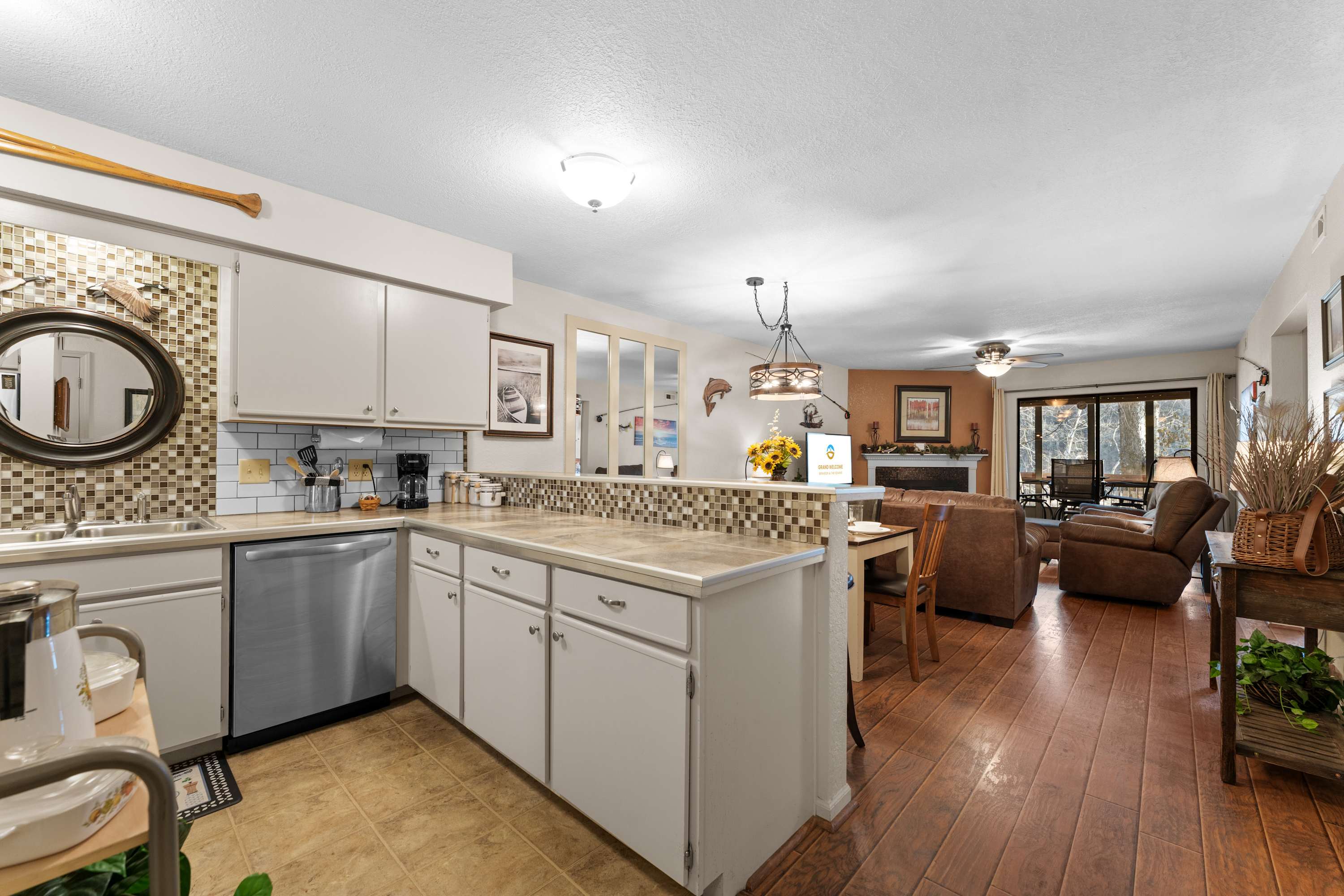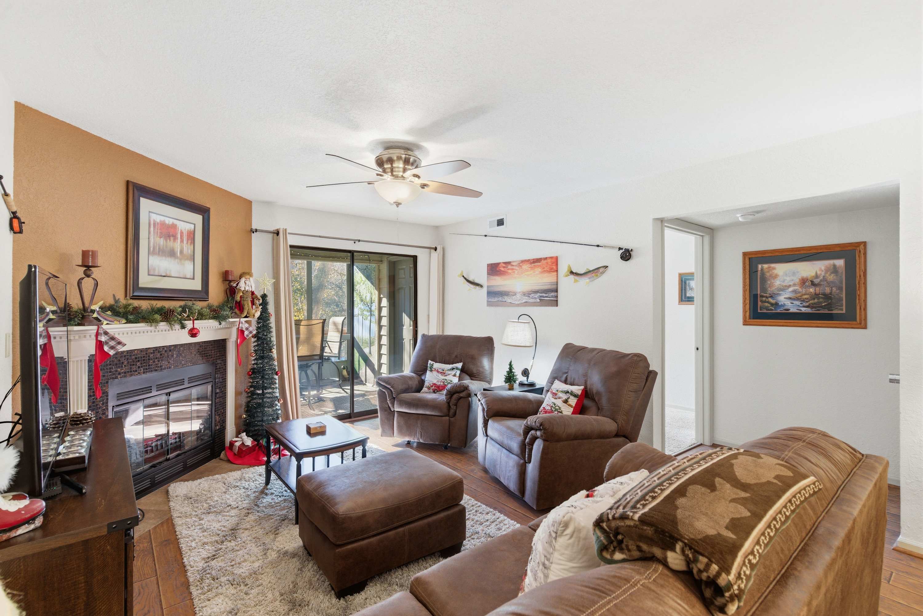 Step inside Water's Edge Hideaway and drop your bags beside the cozy living room, where a sofa and two armchairs are perfectly positioned for watching your favorite shows on the smart TV or enjoying the soft glow of the fireplace on cool evenings. The kitchen, open and airy, features counter seating for four and flows seamlessly into the dining area, where a table for six invites you to gather for meals, games, or late-night laughs. Slide open the door to your private, covered deck—your own serene spot to sip coffee or wine at the outdoor table for four while taking in calming water views that stretch out before you.