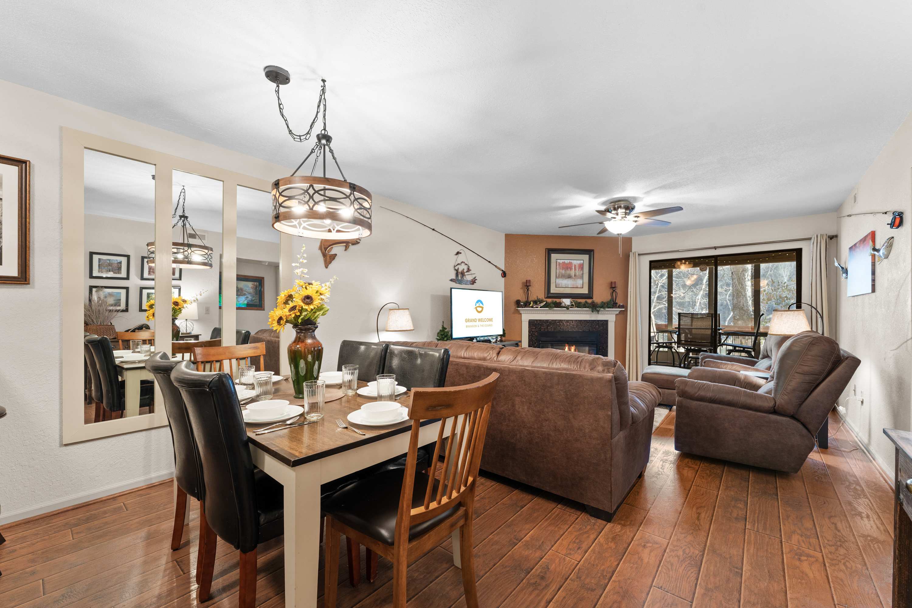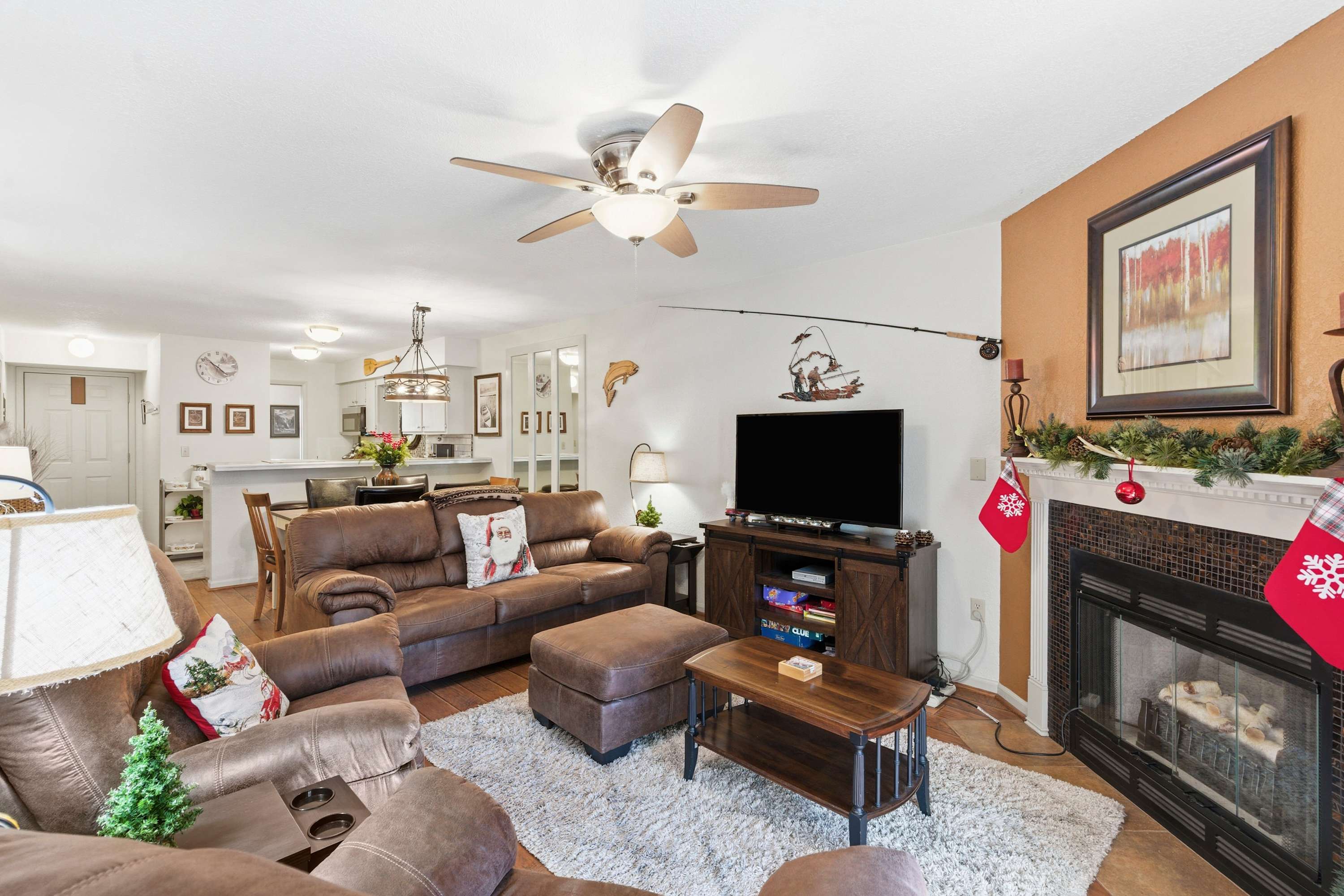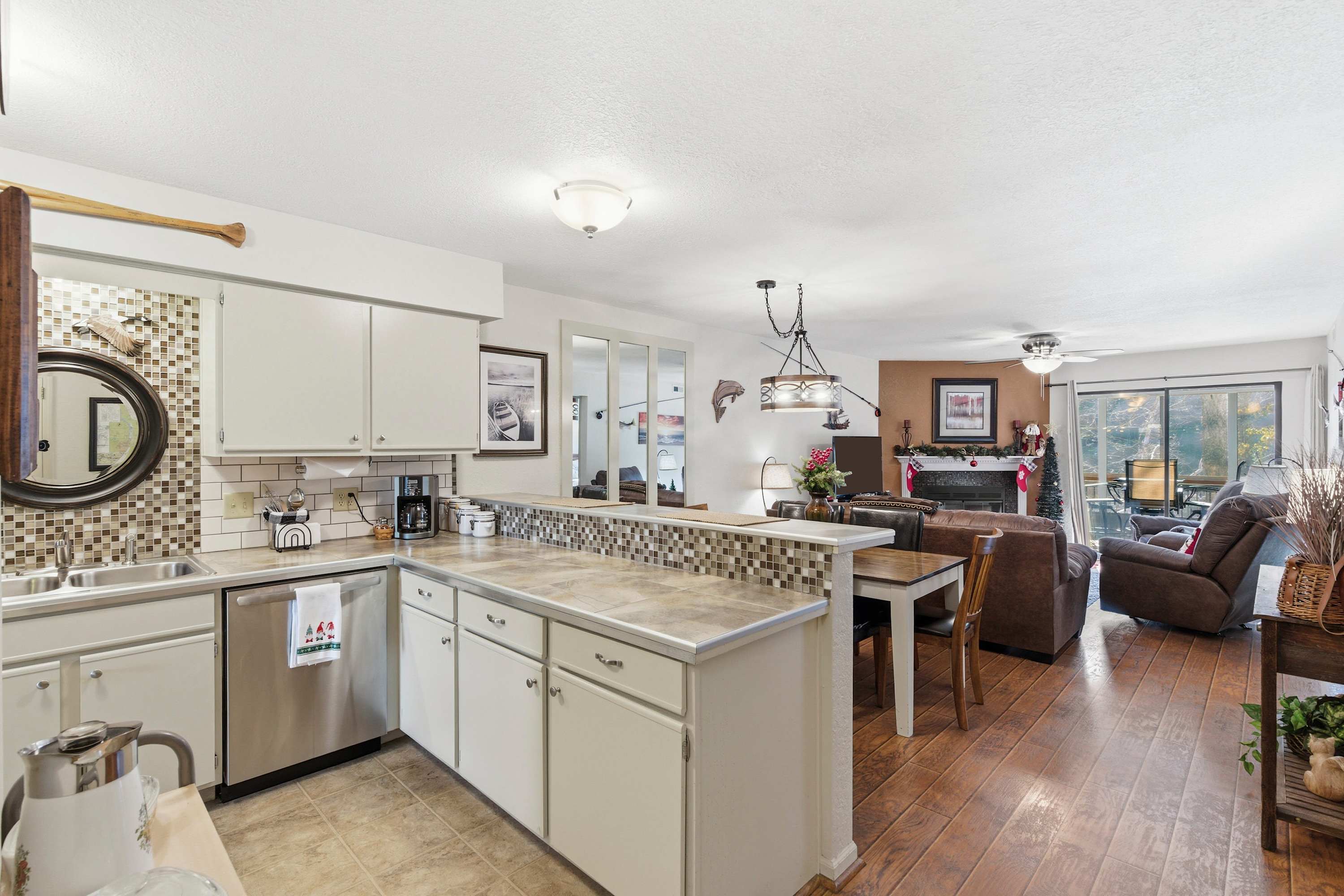 Step inside Water's Edge Hideaway and drop your bags beside the cozy living room, where a sofa and two armchairs are perfectly positioned for watching your favorite shows on the smart TV or enjoying the soft glow of the fireplace on cool evenings. The kitchen, open and airy, features counter seating for four and flows seamlessly into the dining area, where a table for six invites you to gather for meals, games, or late-night laughs. Slide open the door to your private, covered deck—your own serene spot to sip coffee or wine at the outdoor table for four while taking in calming water views that stretch out before you.
