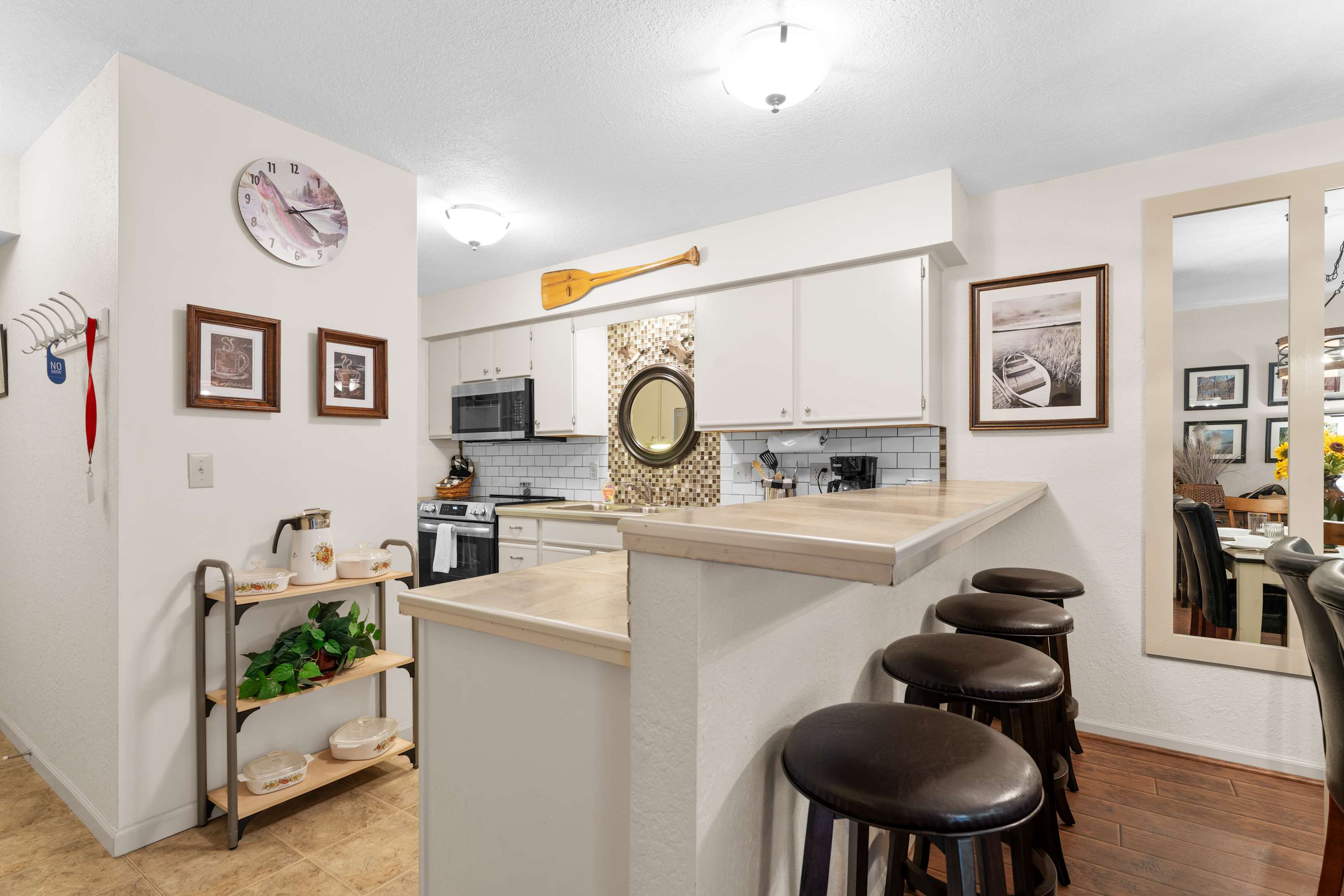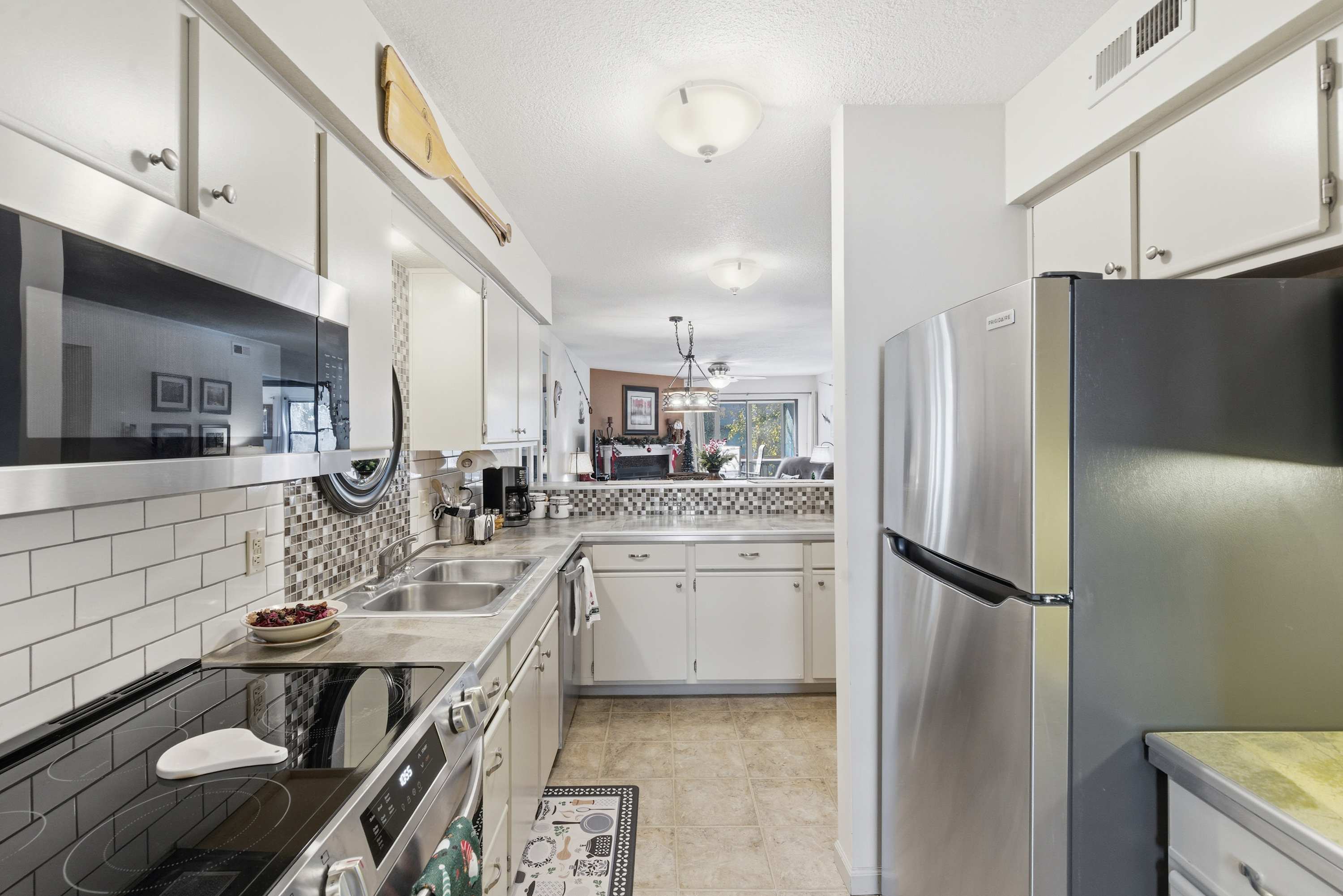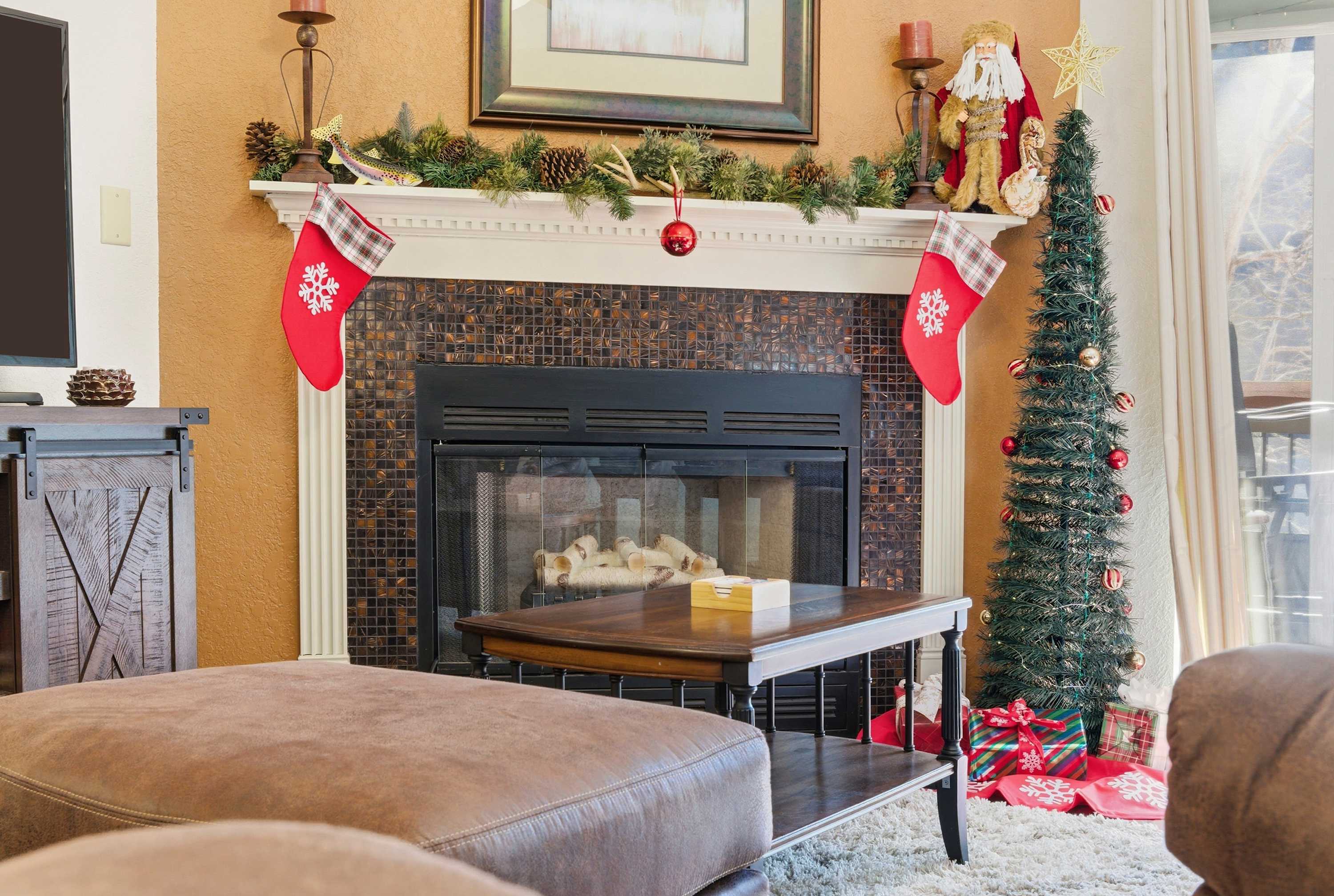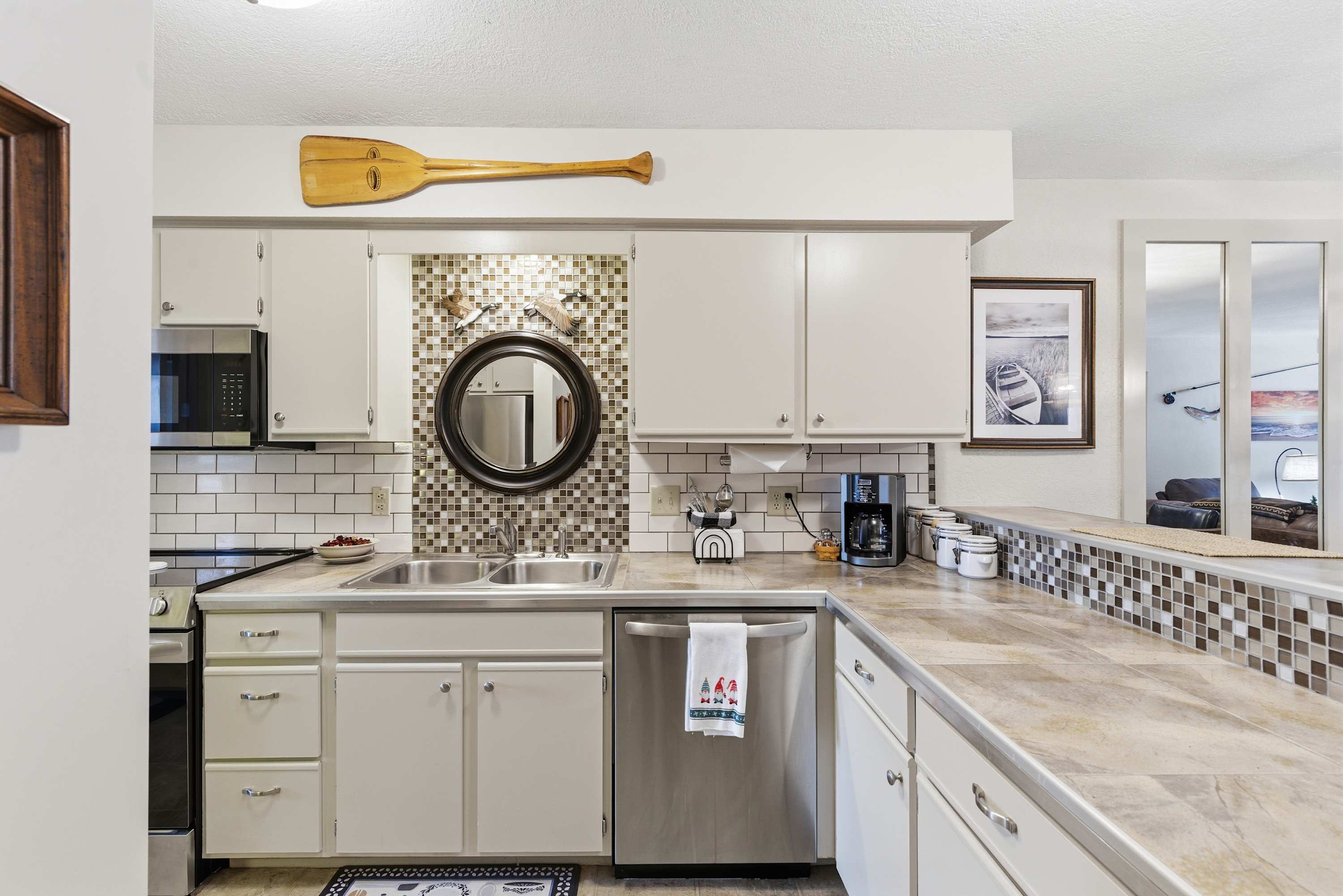 Step inside Water's Edge Hideaway and drop your bags beside the cozy living room, where a sofa and two armchairs are perfectly positioned for watching your favorite shows on the smart TV or enjoying the soft glow of the fireplace on cool evenings. The kitchen, open and airy, features counter seating for four and flows seamlessly into the dining area, where a table for six invites you to gather for meals, games, or late-night laughs. Slide open the door to your private, covered deck—your own serene spot to sip coffee or wine at the outdoor table for four while taking in calming water views that stretch out before you.