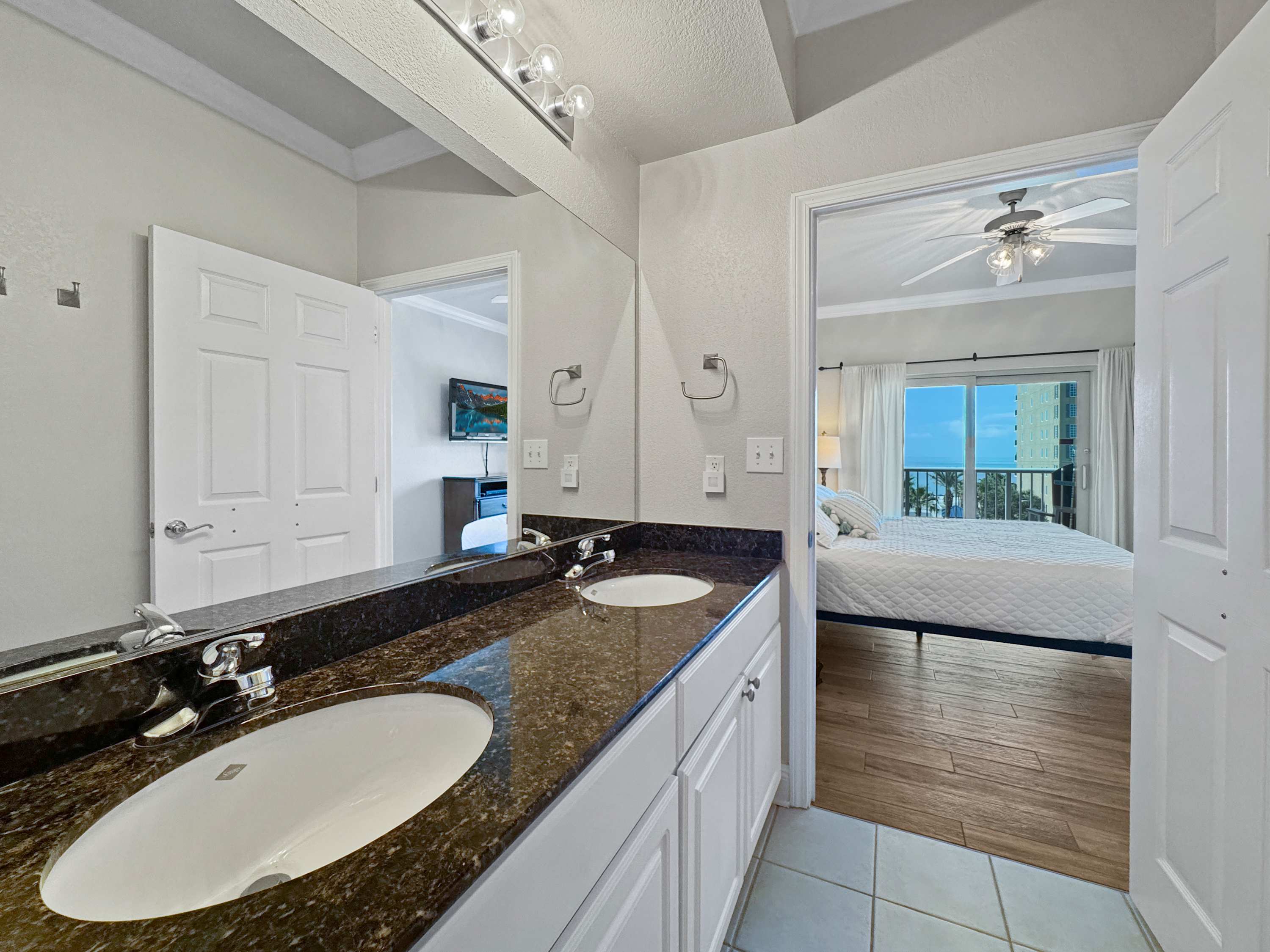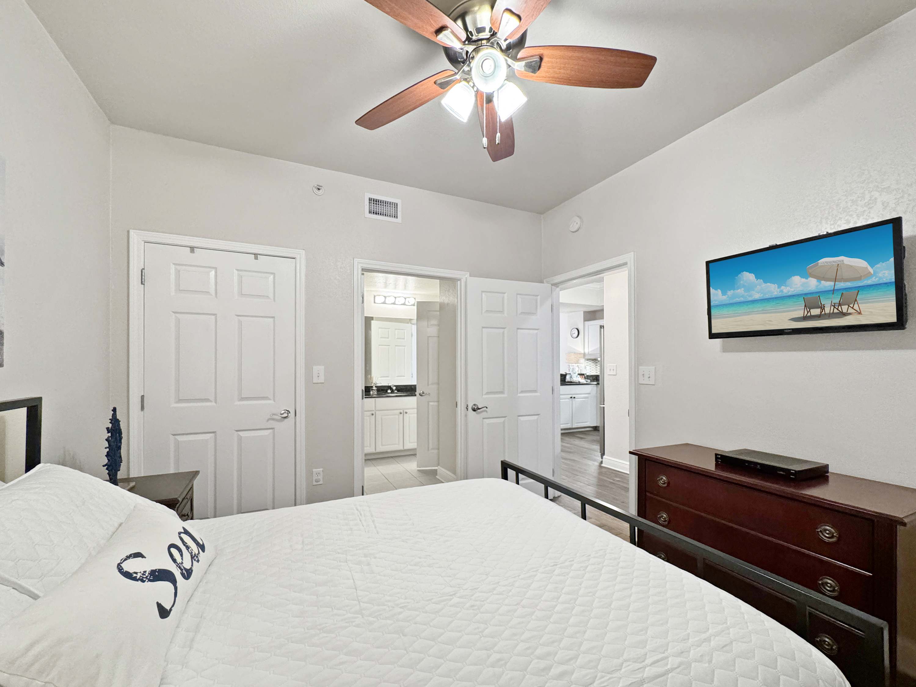 Bedroom #1 includes a king size bed, a TV, a balcony, and ensuite bathroom with a dual vanity and a shower/tub combo.