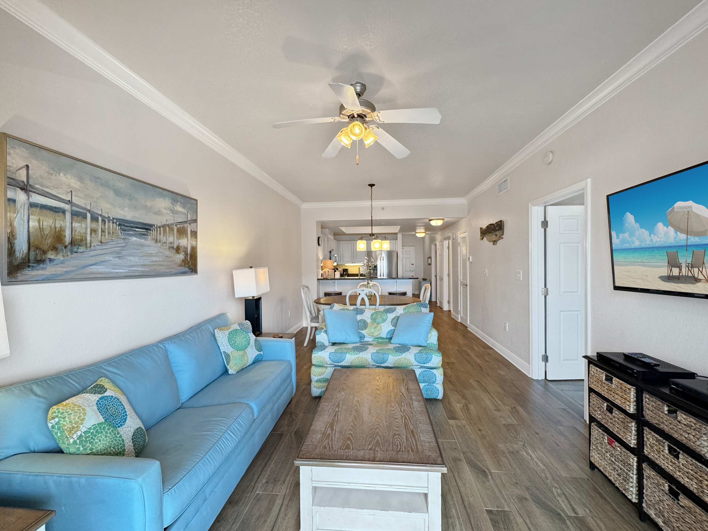 Step inside Sunset Crossing and feel instantly at home. The kitchen is stocked with all the essentials, featuring stainless steel appliances, counter seating for 3, and both Keurig and drip coffee makers to suit every morning mood. Just beyond, the dining table for 4 offers a cozy space to gather. Plan to unwind in the living room with a plush couch and armchair, cable TV with Roku, and a collection of board games for evening fun. Step out onto the covered balcony to take in the salty breeze and coastal views—this peaceful perch is perfect for morning coffee or sunset cocktails.