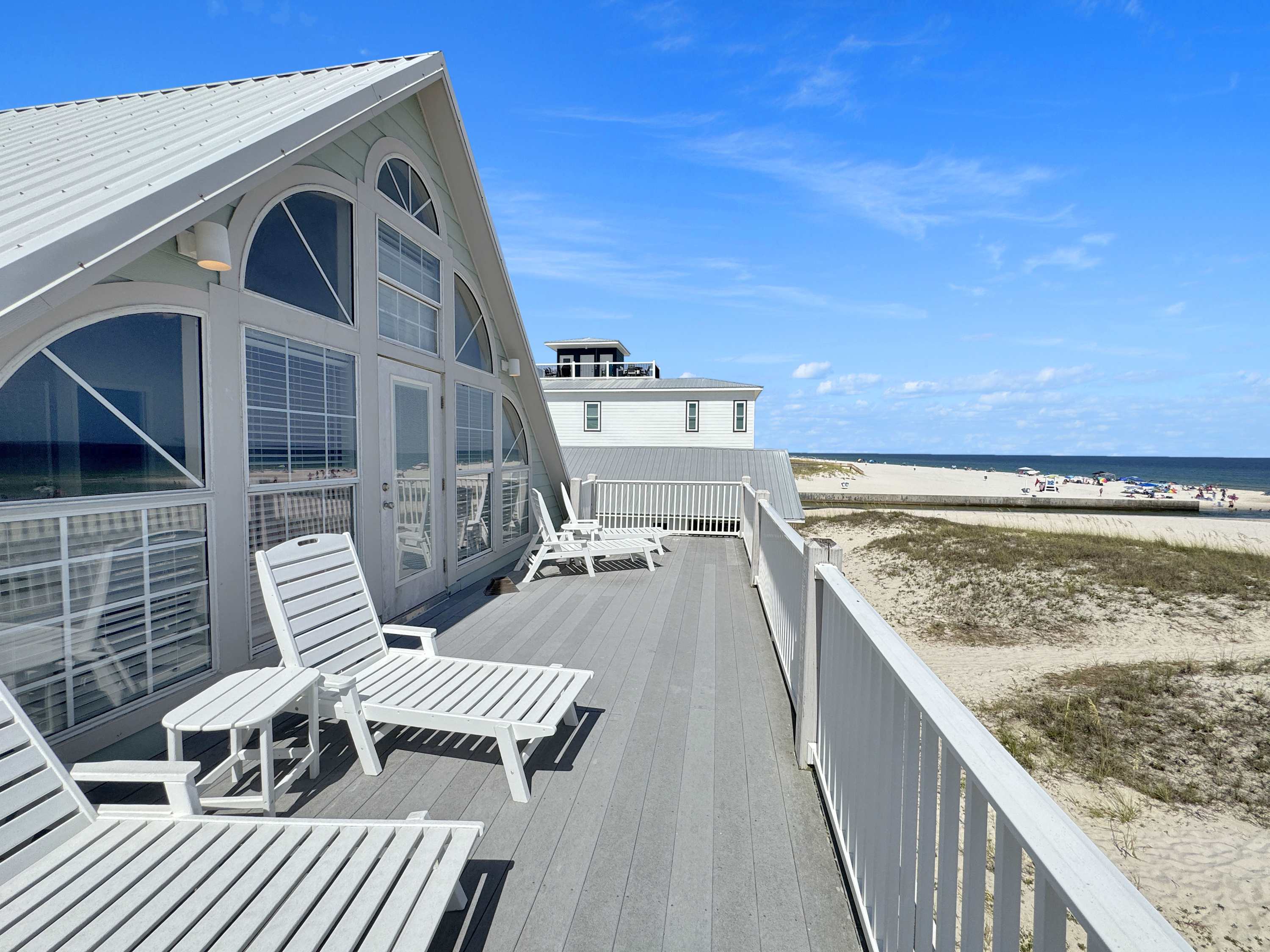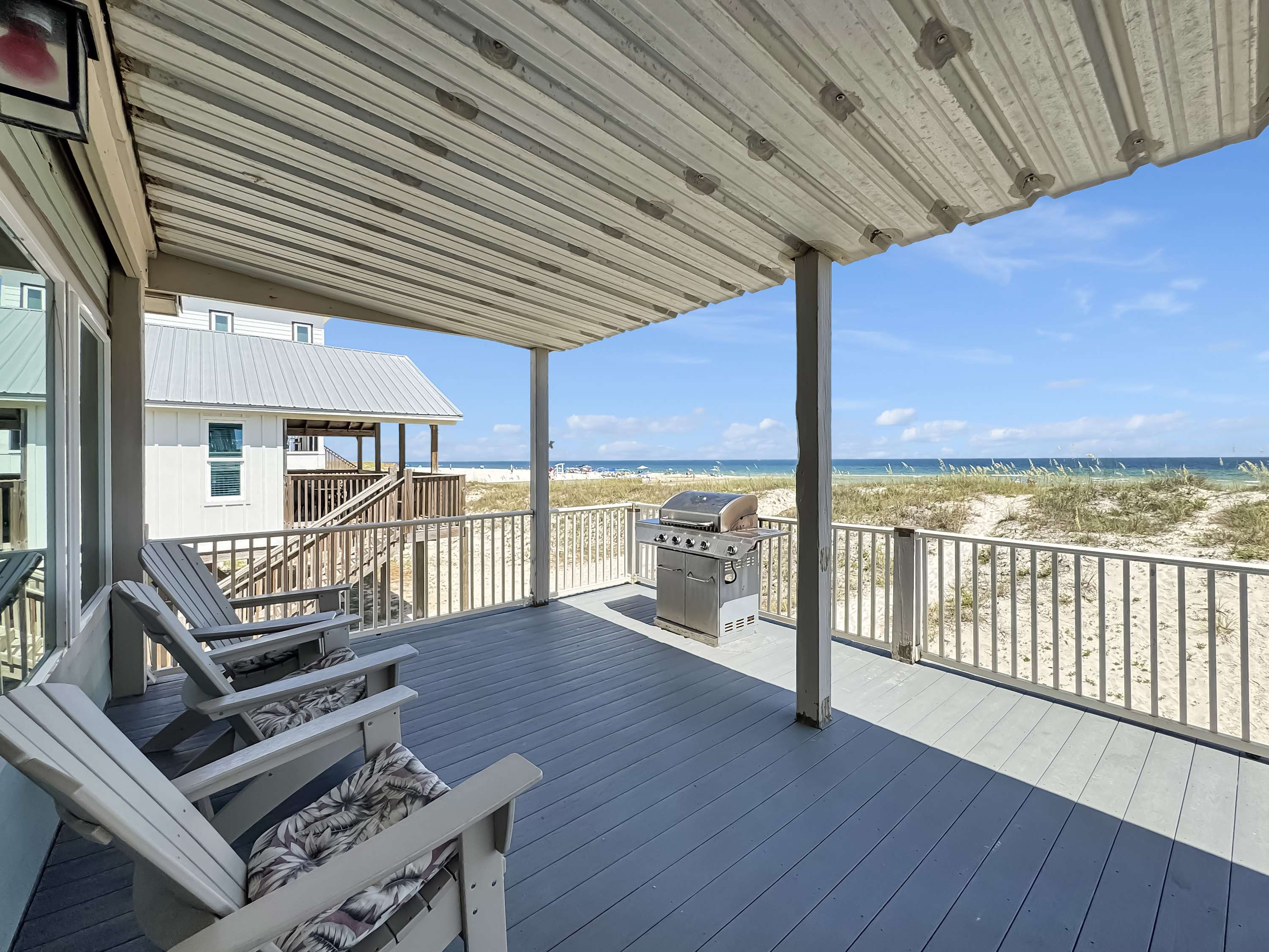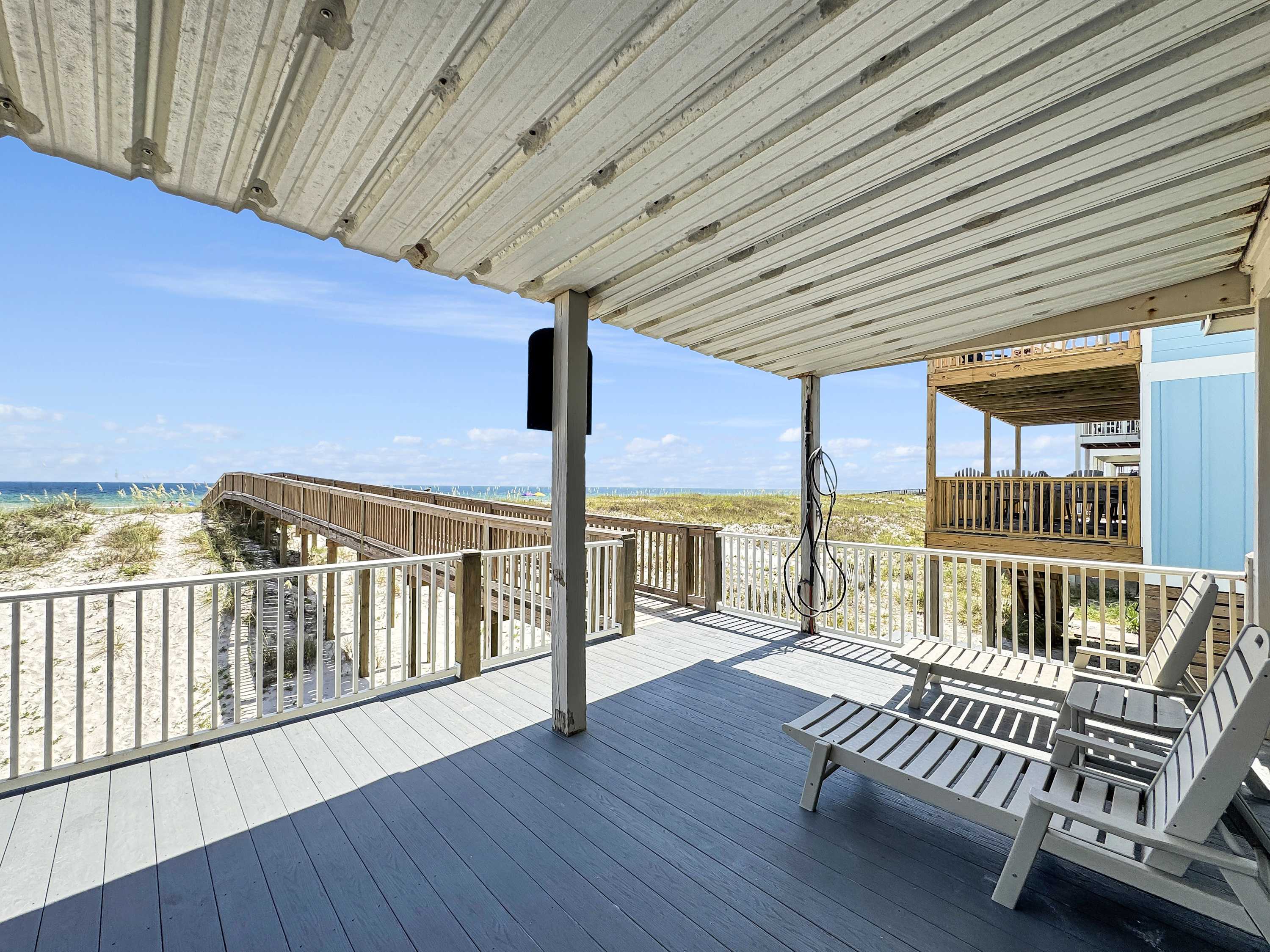 For a more secluded spot, the upper balcony (accessible only through the primary suite on the top floor) offers lounge seating and panoramic Gulf views—ideal for morning coffee or golden-hour sunsets. With plenty of room to spread out, unbeatable beachfront access, and all the comforts of home, Pass Time is more than a place to stay—it’s where your next unforgettable beach memory begins.
