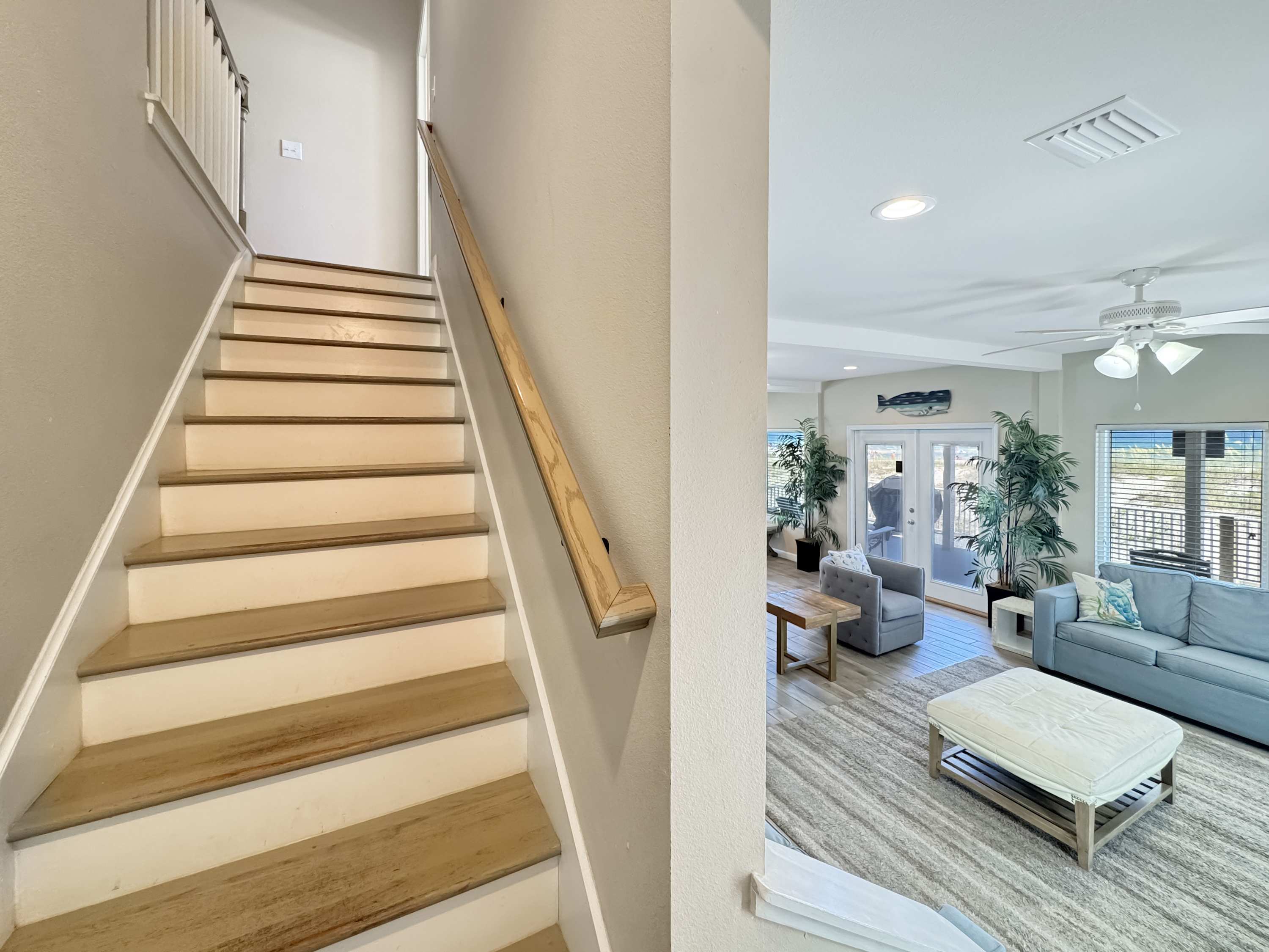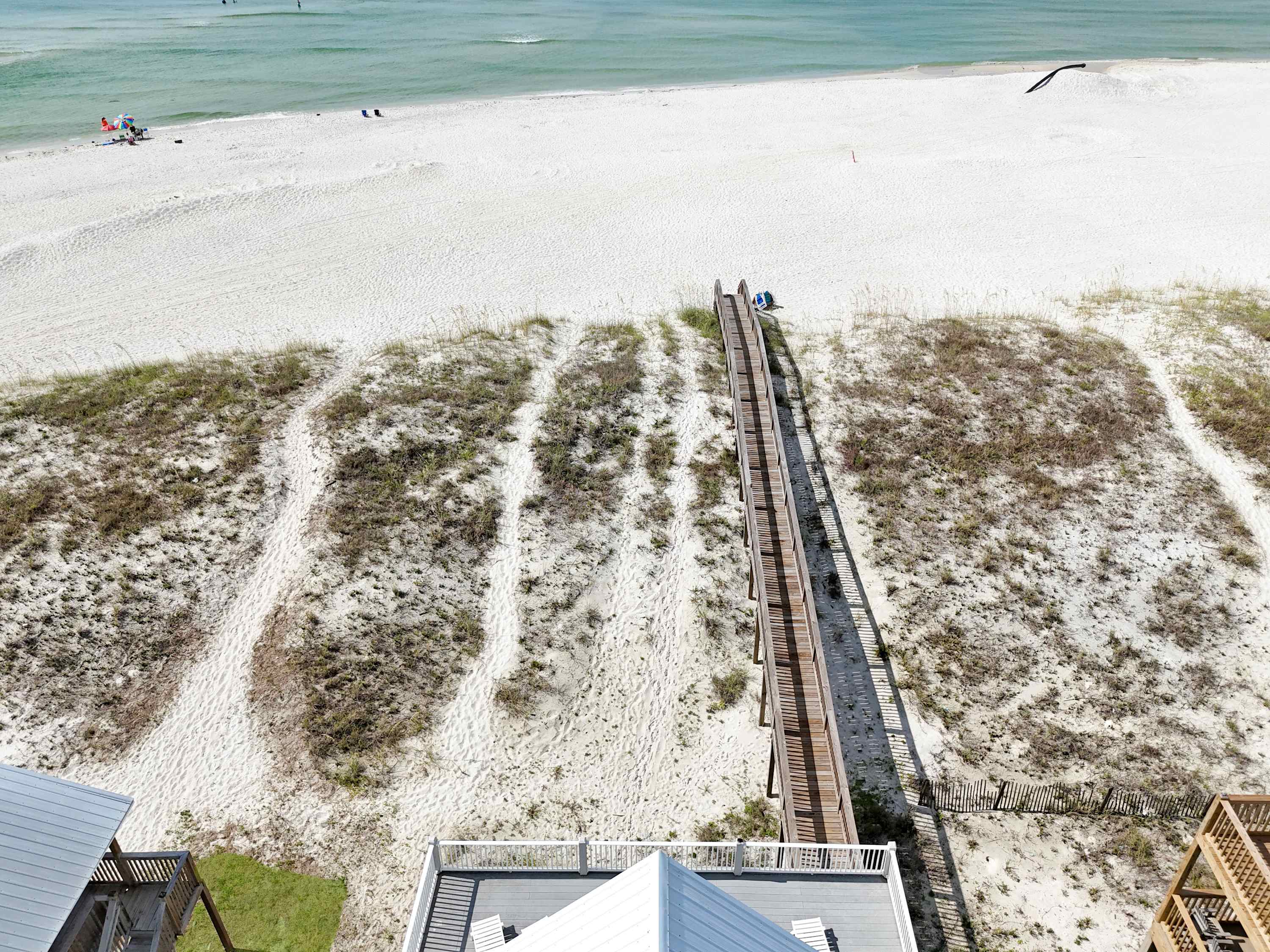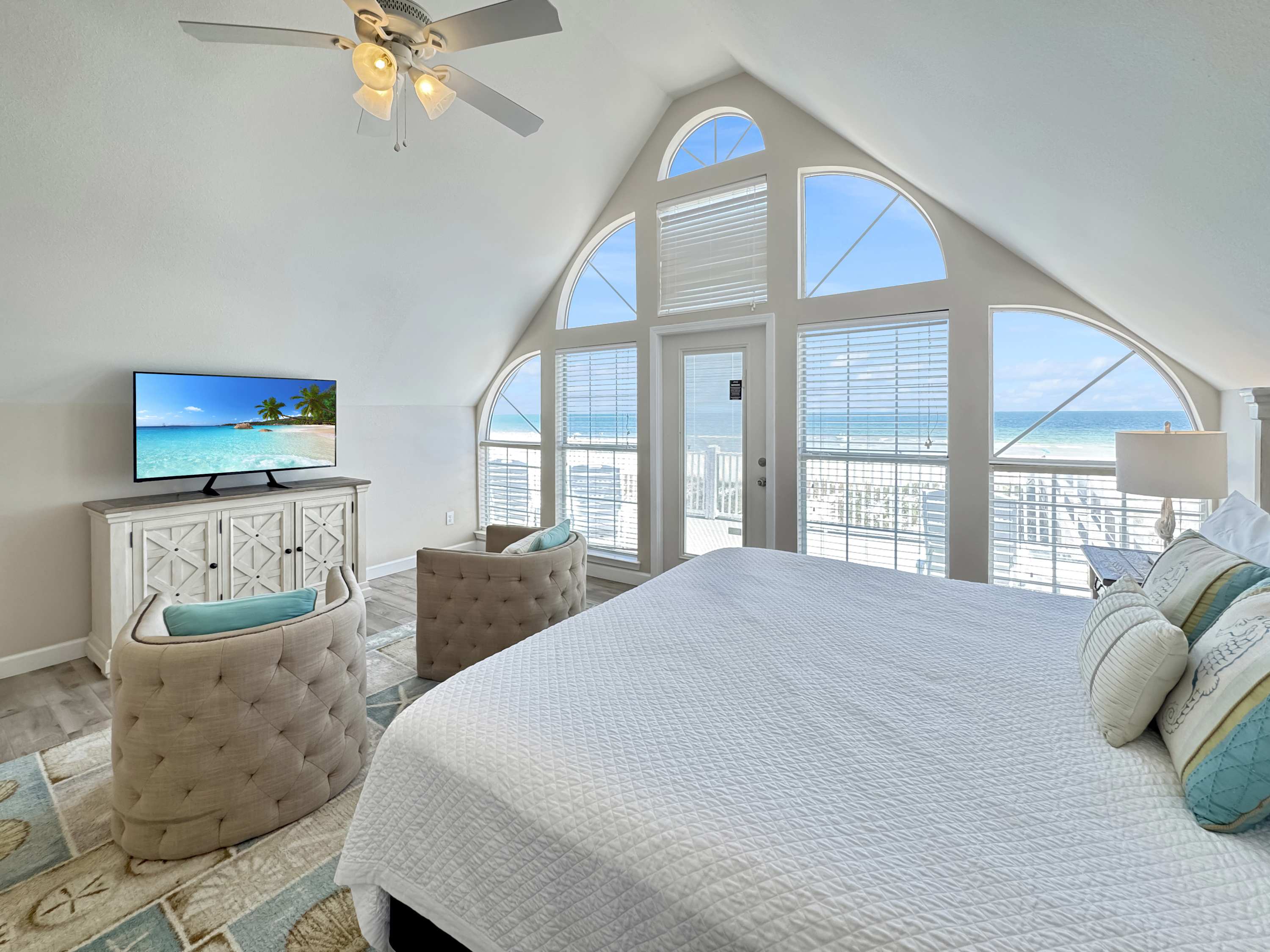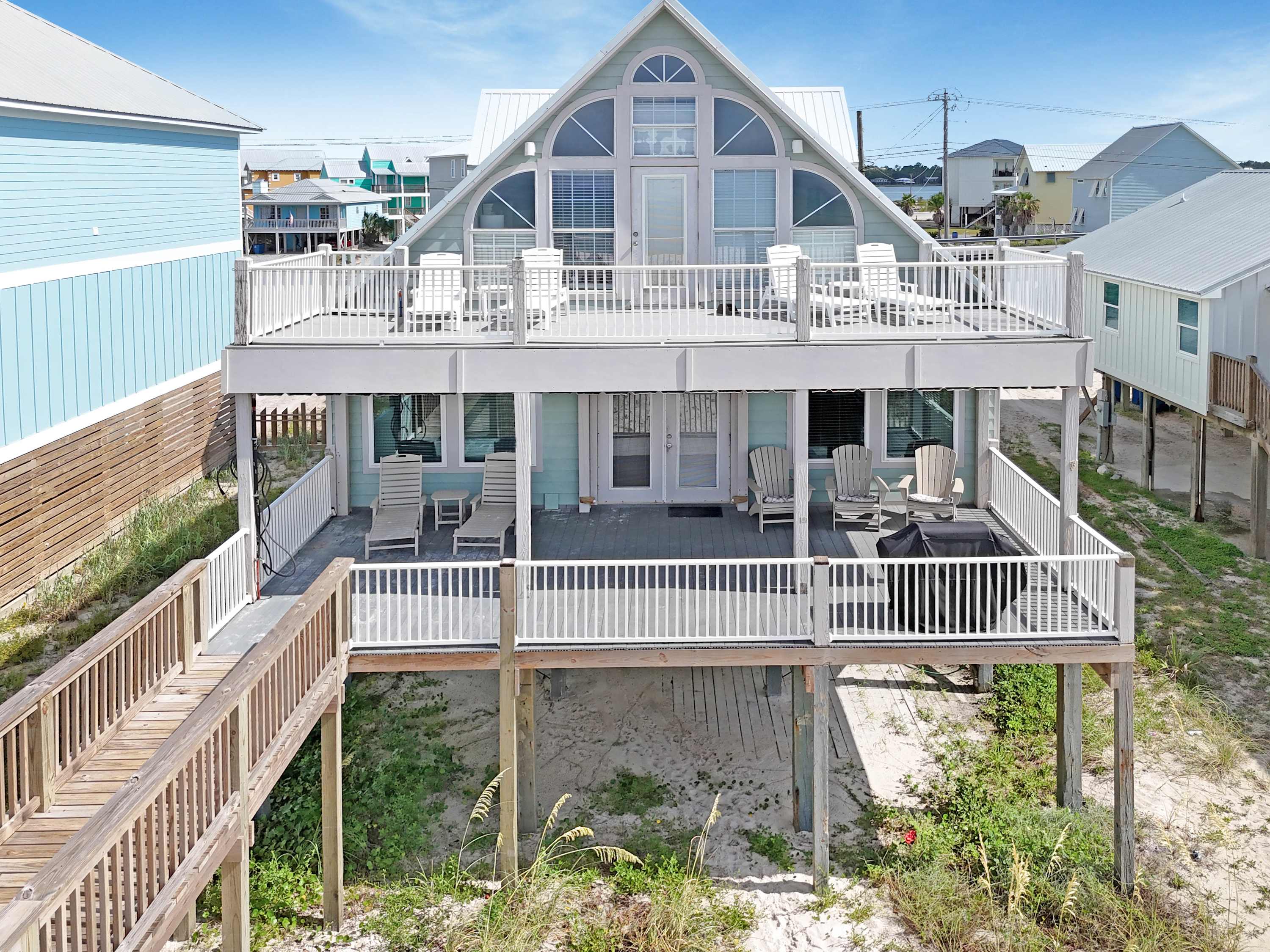 For a more secluded spot, the upper balcony (accessible only through the primary suite on the top floor) offers lounge seating and panoramic Gulf views—ideal for morning coffee or golden-hour sunsets. With plenty of room to spread out, unbeatable beachfront access, and all the comforts of home, Pass Time is more than a place to stay—it’s where your next unforgettable beach memory begins.
