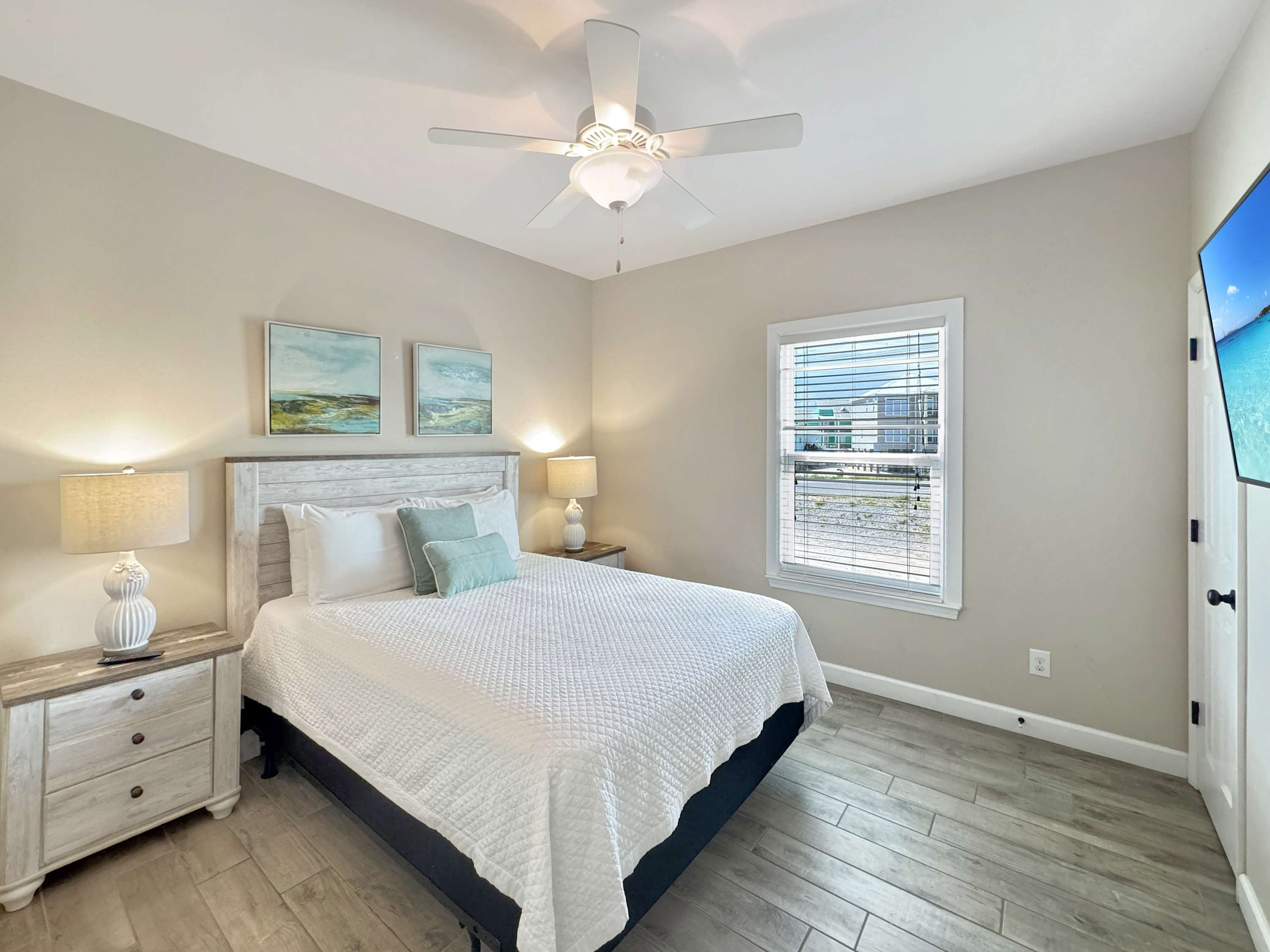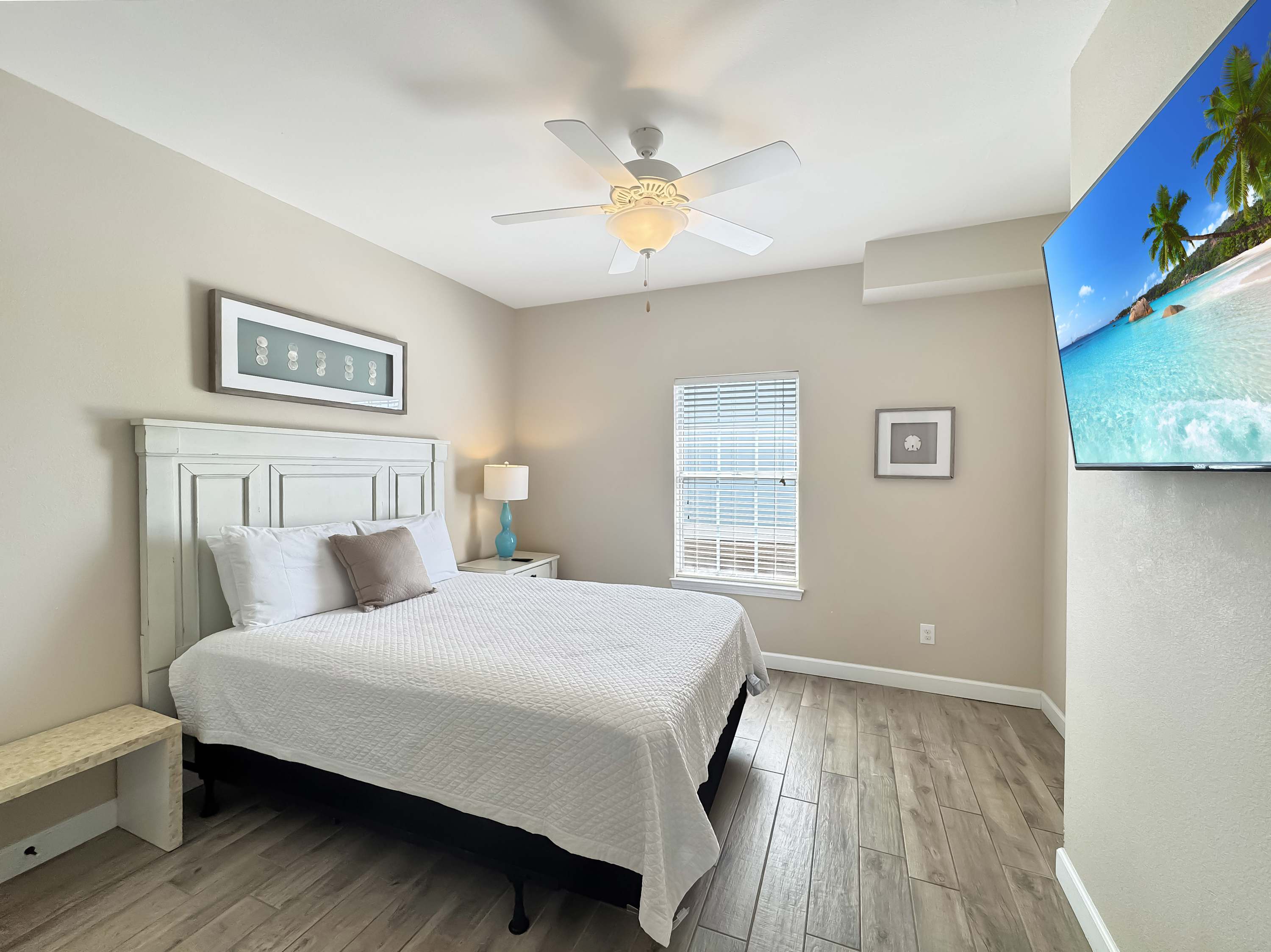 Bedroom #5 includes a queen size bed, a smart TV, and an ensuite bathroom with a single vanity and a shower/tub combo.