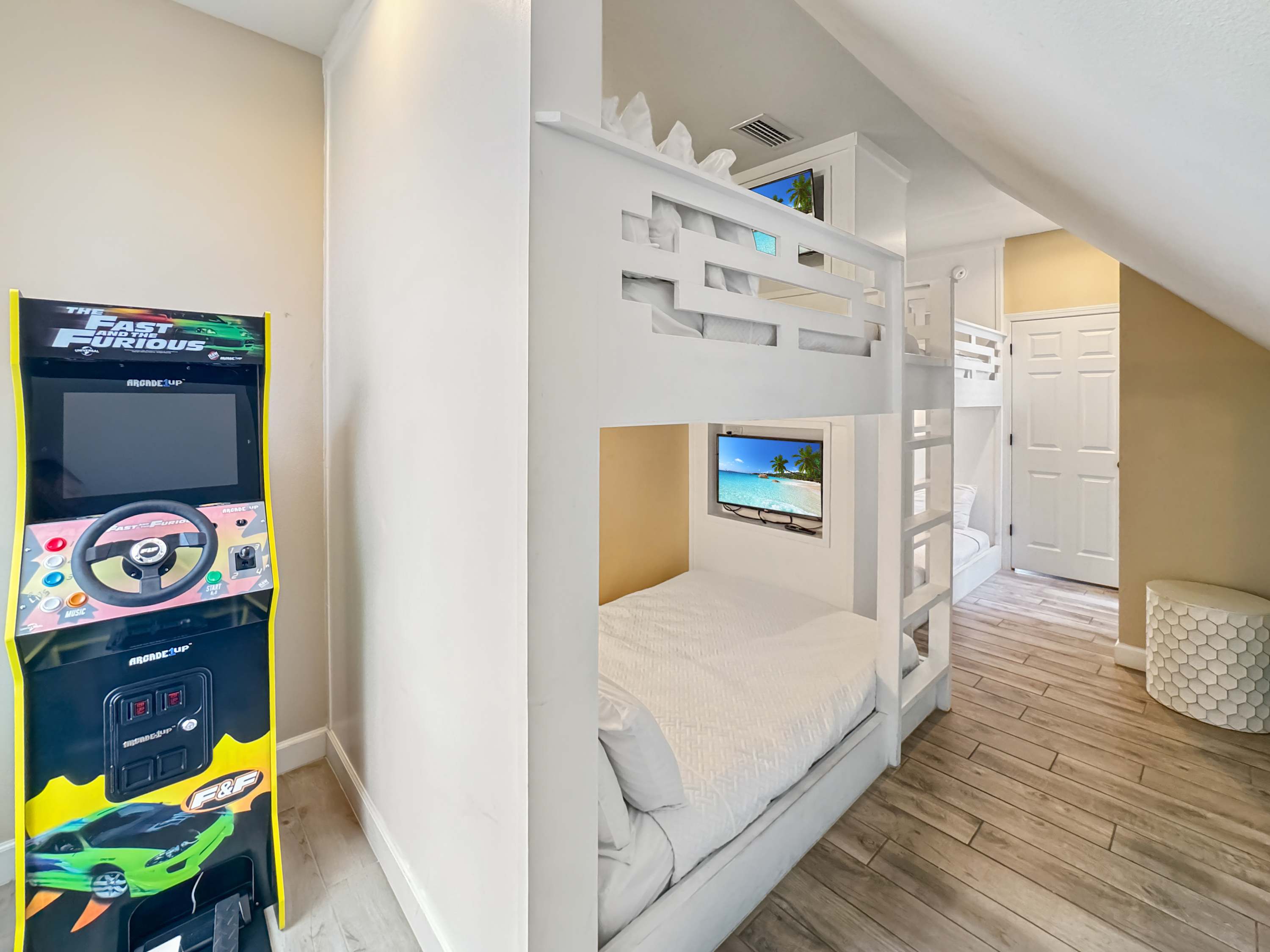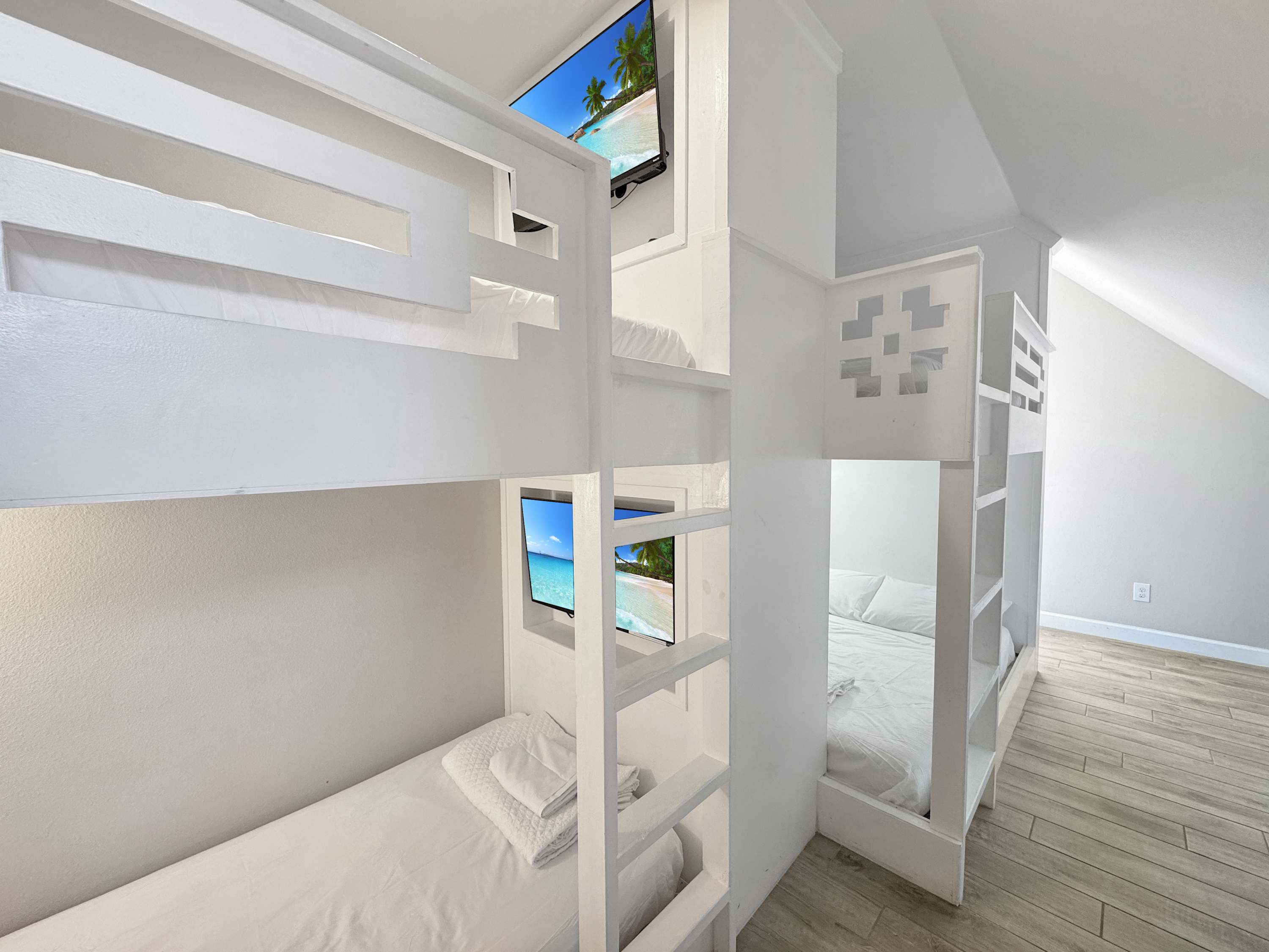 Bedroom #2 includes twin-over-twin bunk beds, full-over-full bunk beds, a smart TV, and an ensuite bathroom with a single vanity and a walk-in shower.