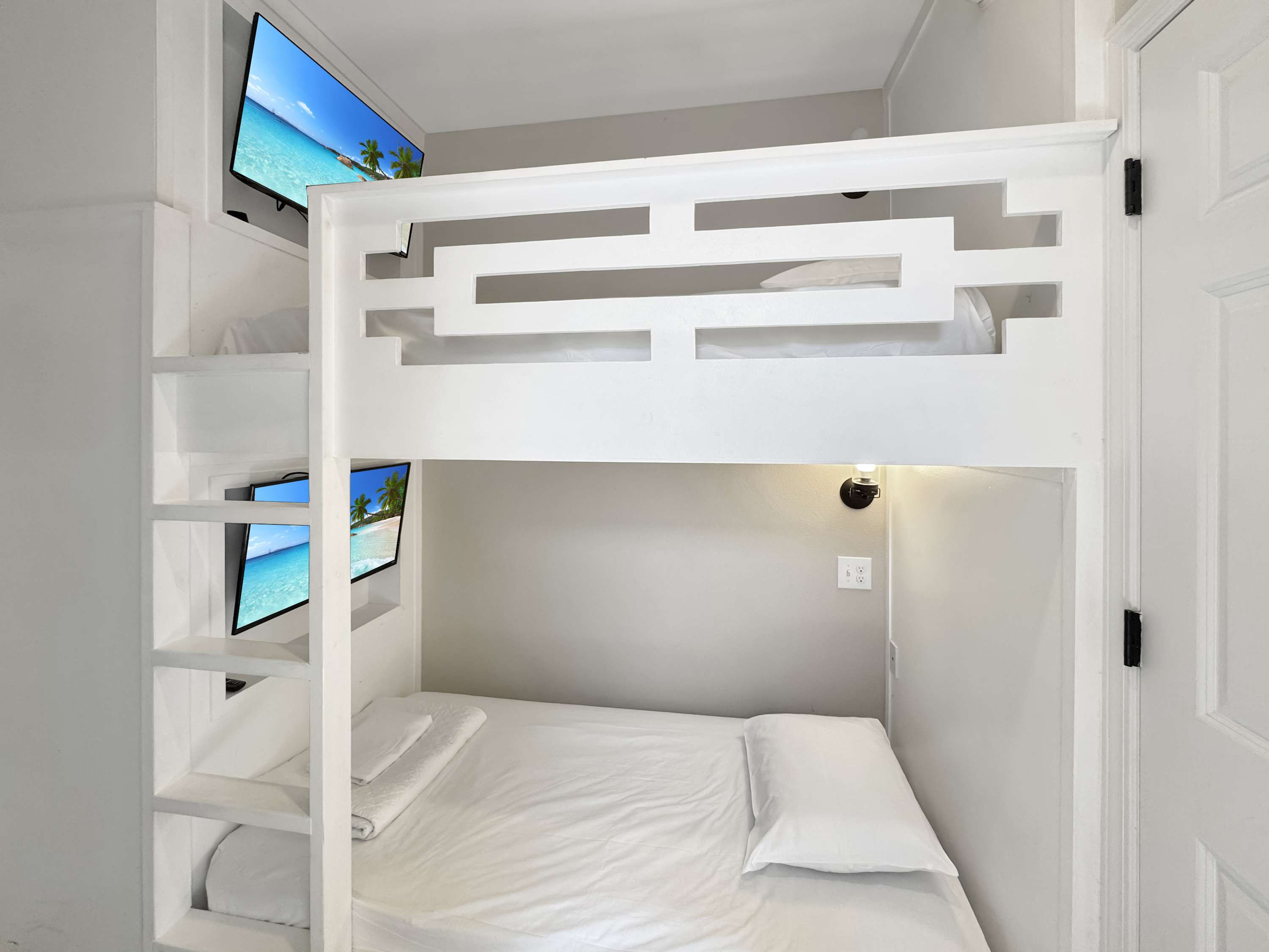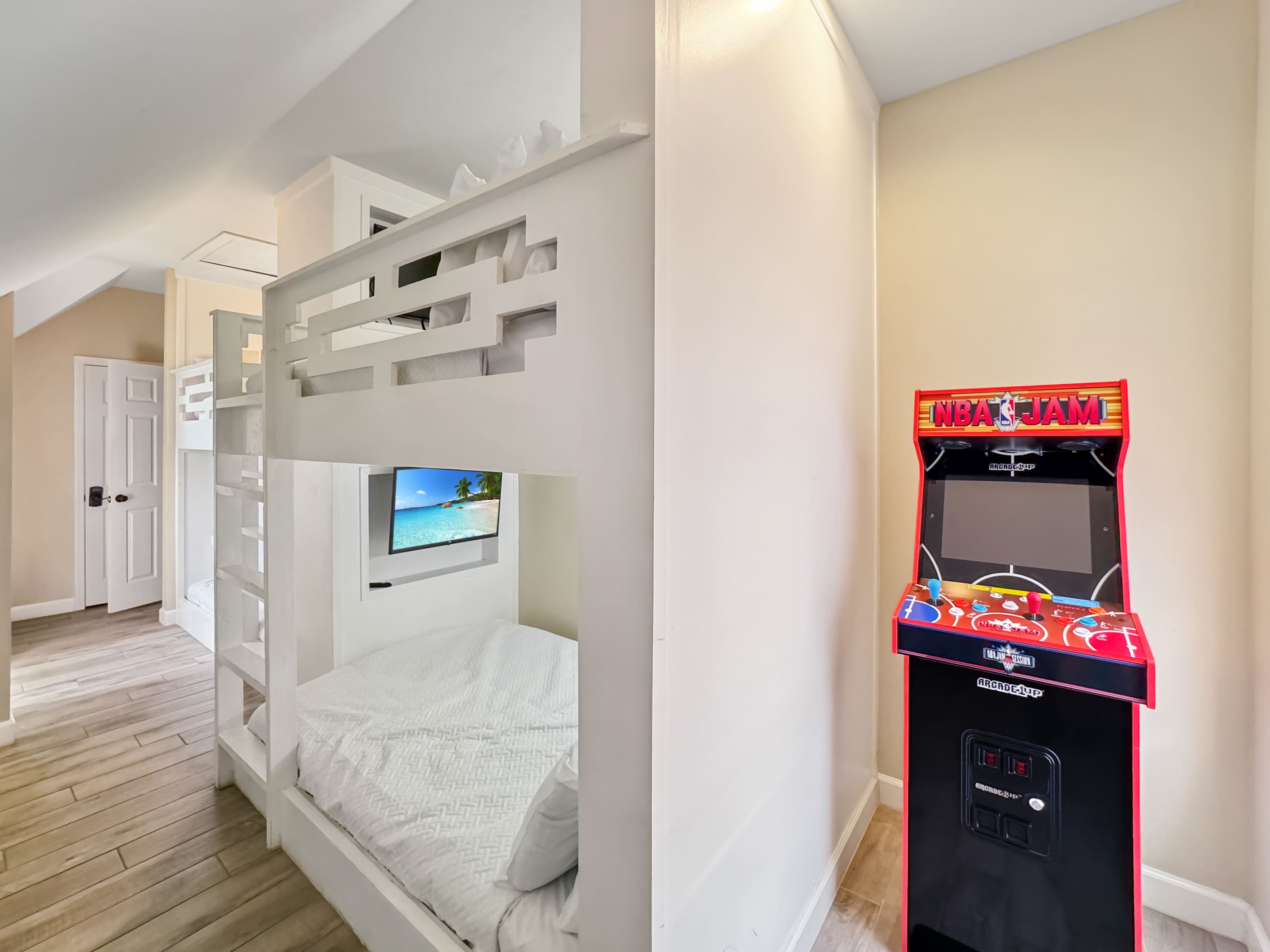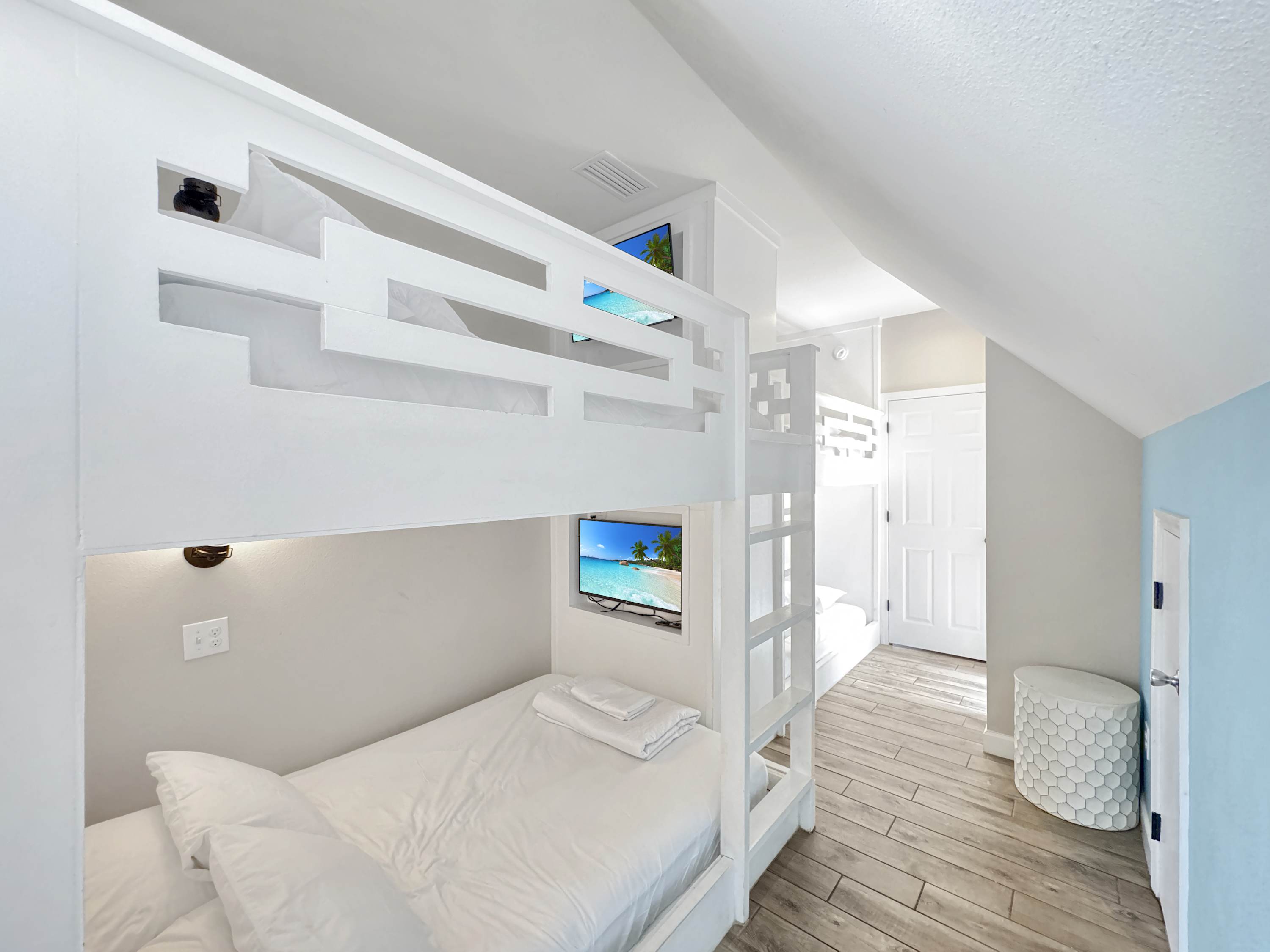Bedroom #3 includes twin-over-twin bunk beds, full-over-full bunk beds, a smart TV, and an ensuite bathroom with a single vanity and a walk-in shower.