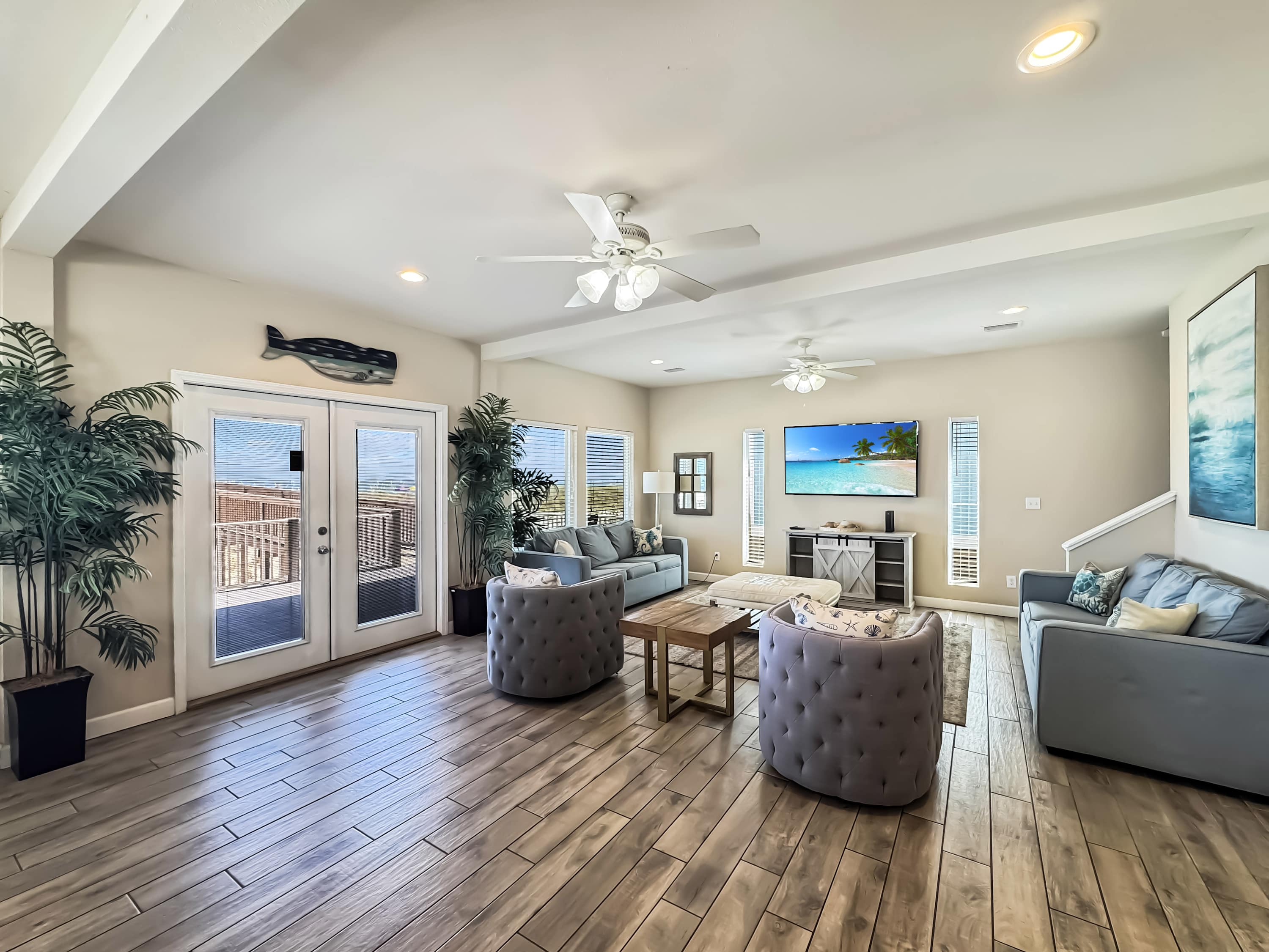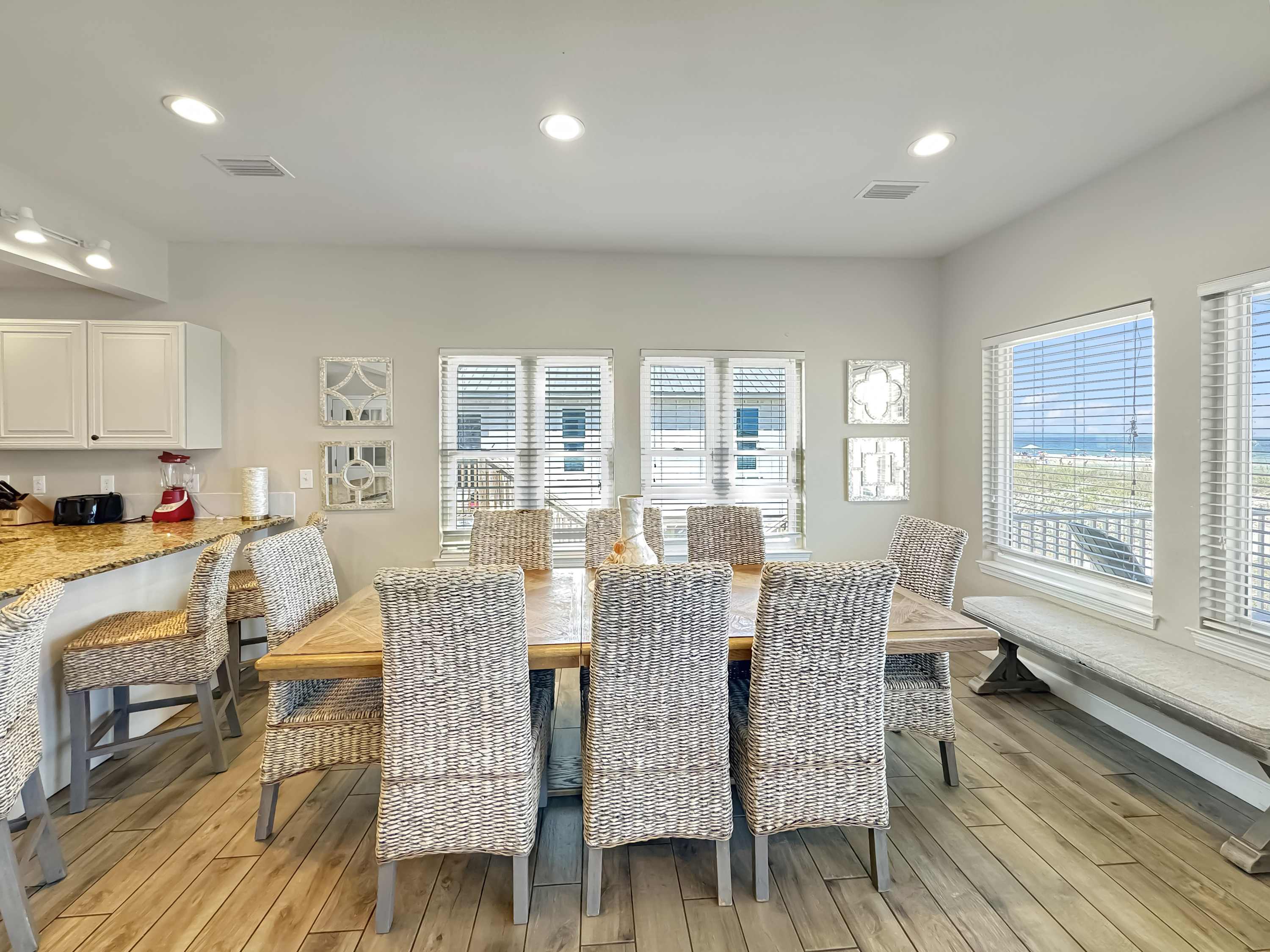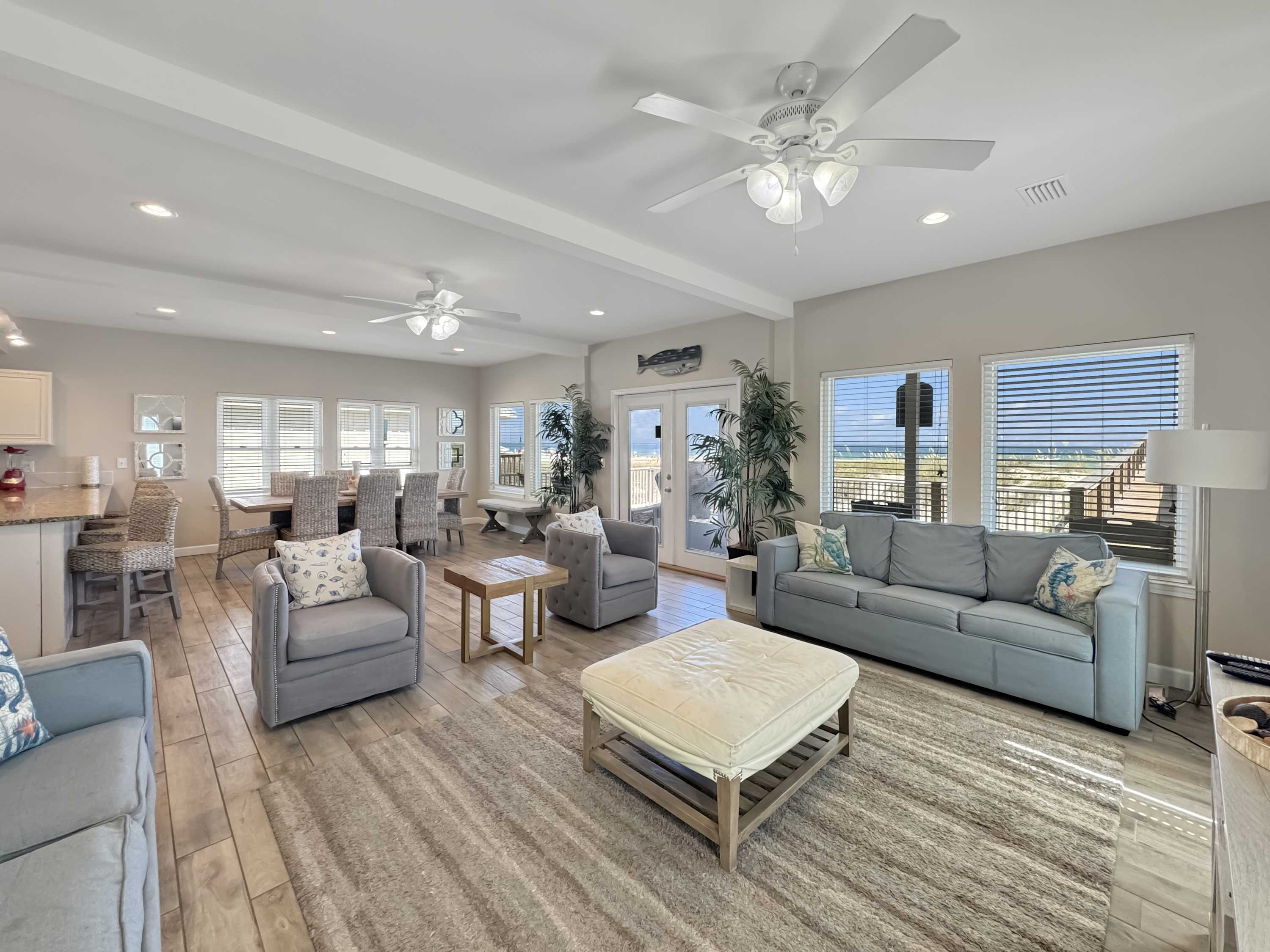 Inside, this home welcomes you with a bright, beachy living room filled with natural light. Gather on two comfy couches or in cozy armchairs while enjoying a game night or movie on the smart TV. A small upstairs den with a couch and second smart TV gives kids or teens a space of their own. The kitchen is modern and functional, with stone countertops, stainless steel appliances, and ample counter space for prepping group meals—plus counter seating for 4 and a dining table for 8 where memories are made over shared meals. Step outside and you're greeted by a large beachfront deck, complete with a gas grill, multiple seating areas, and your own private boardwalk leading directly to the beach—no crowds, no hassle, just your group and the ocean.