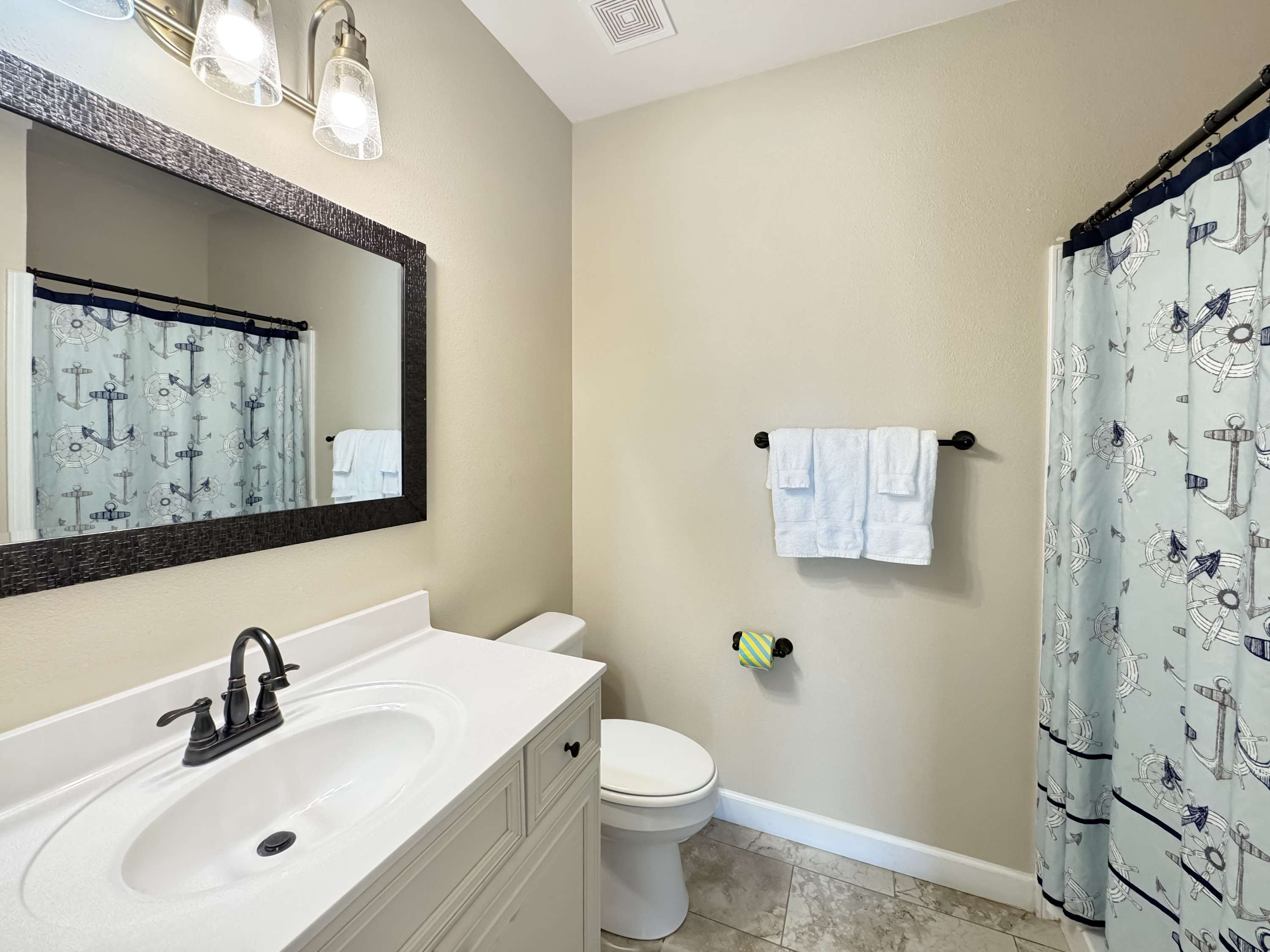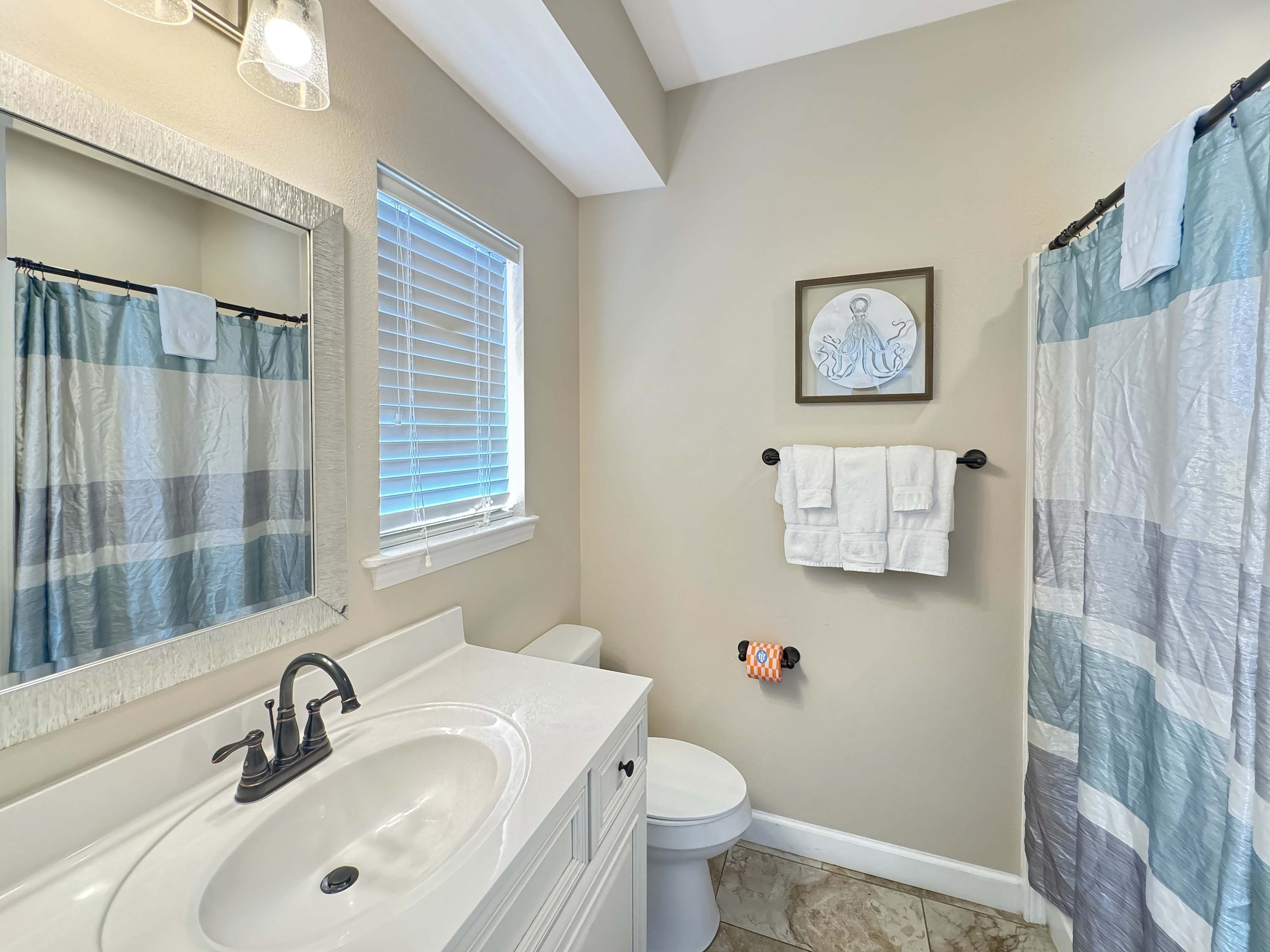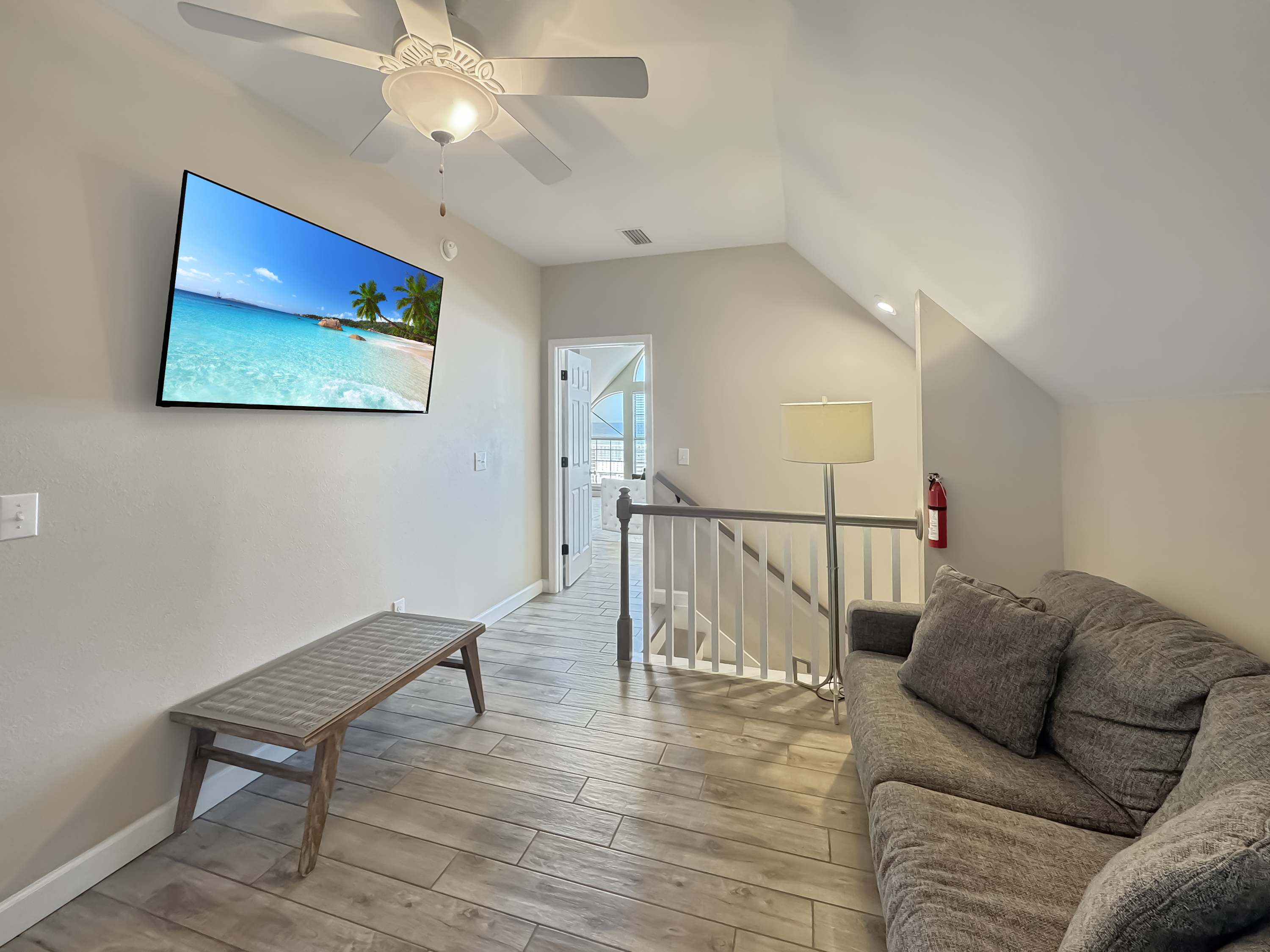 Inside, this home welcomes you with a bright, beachy living room filled with natural light. Gather on two comfy couches or in cozy armchairs while enjoying a game night or movie on the smart TV. A small upstairs den with a couch and second smart TV gives kids or teens a space of their own. The kitchen is modern and functional, with stone countertops, stainless steel appliances, and ample counter space for prepping group meals—plus counter seating for 4 and a dining table for 8 where memories are made over shared meals. Step outside and you're greeted by a large beachfront deck, complete with a gas grill, multiple seating areas, and your own private boardwalk leading directly to the beach—no crowds, no hassle, just your group and the ocean.