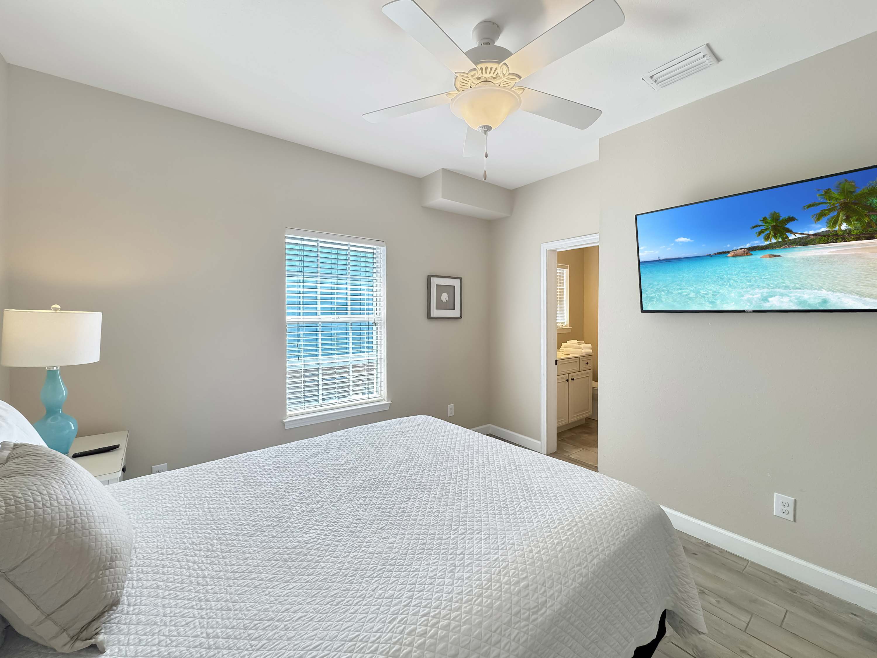 Bedroom #4 includes a king size bed, a smart TV, and an ensuite bathroom with a dual vanity and a shower/tub combo.