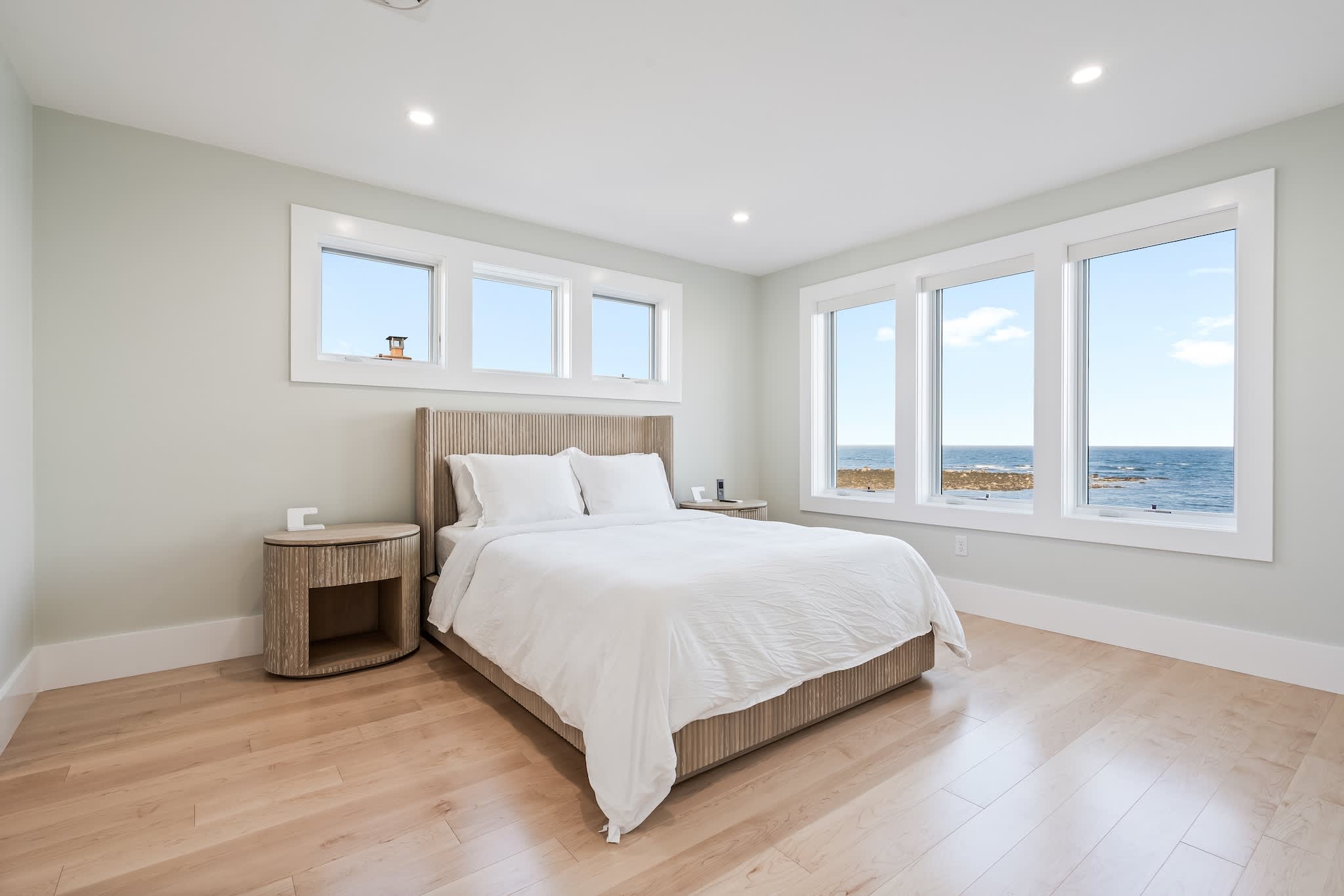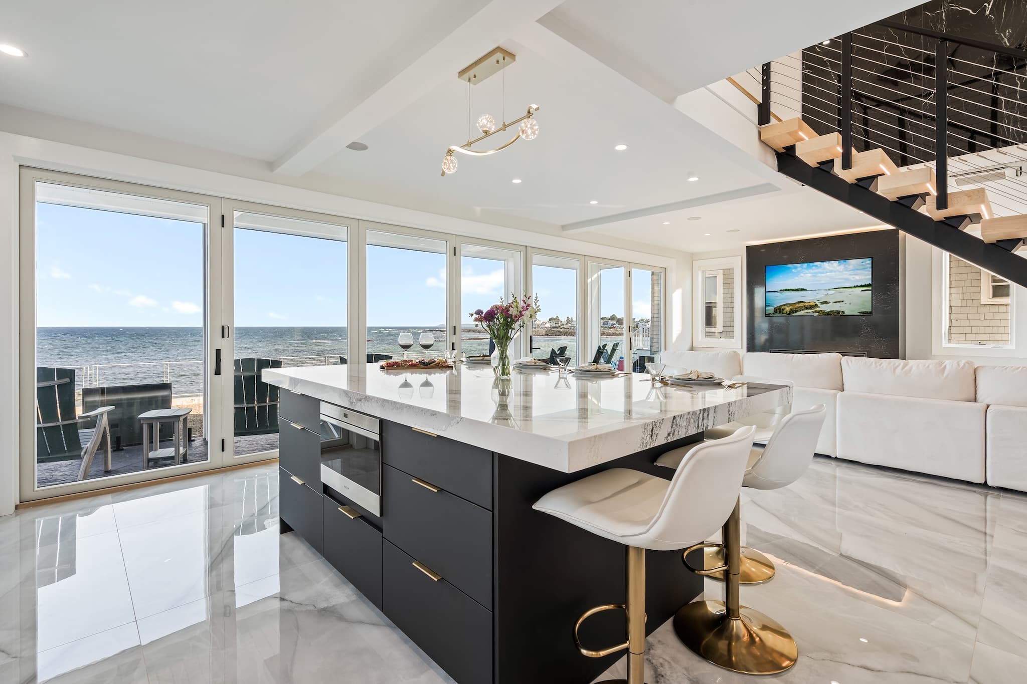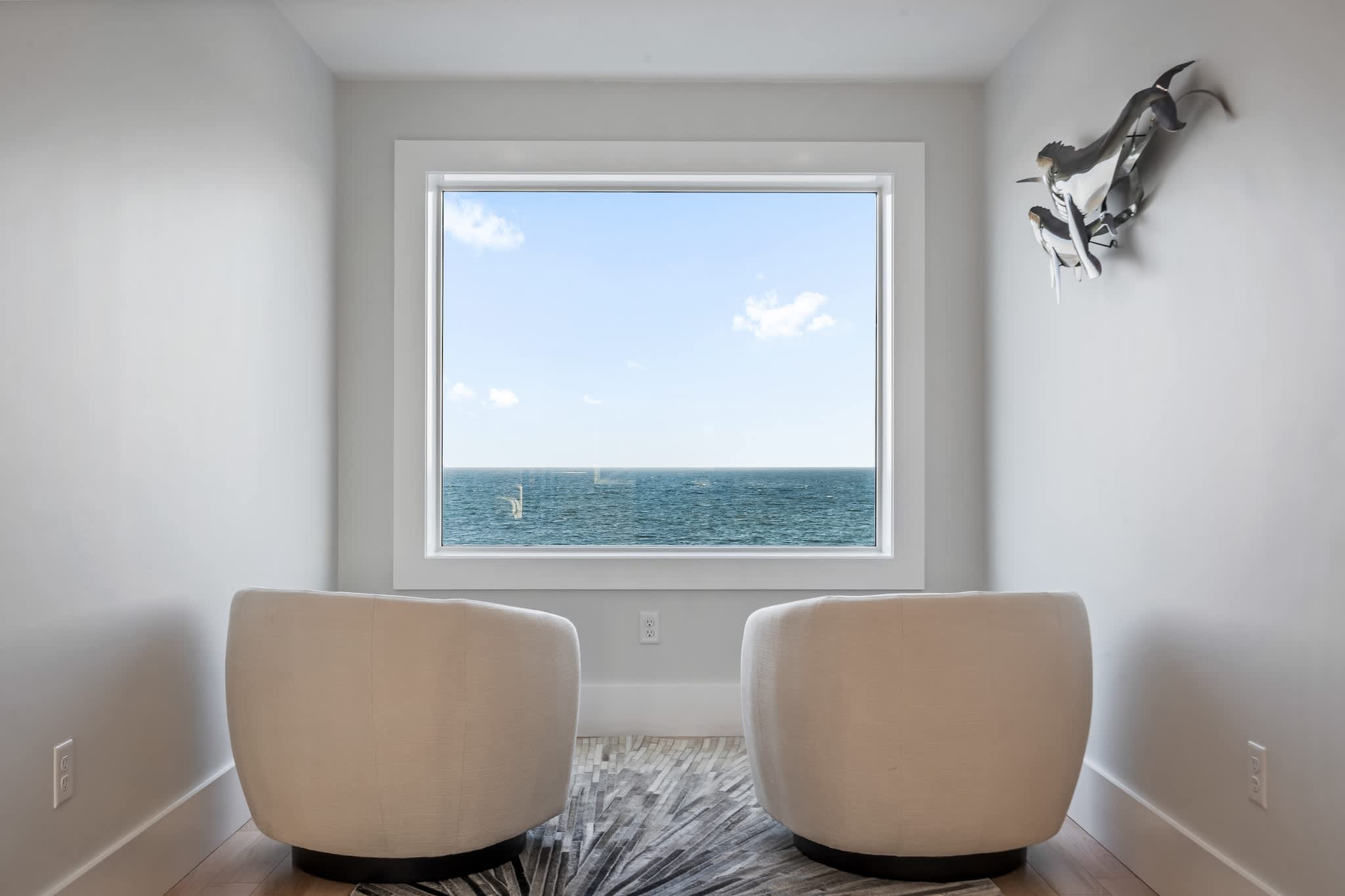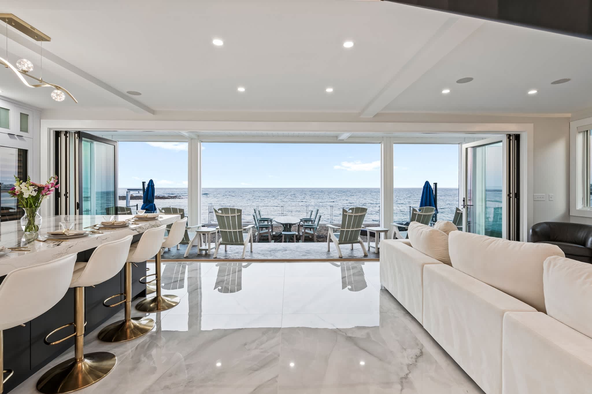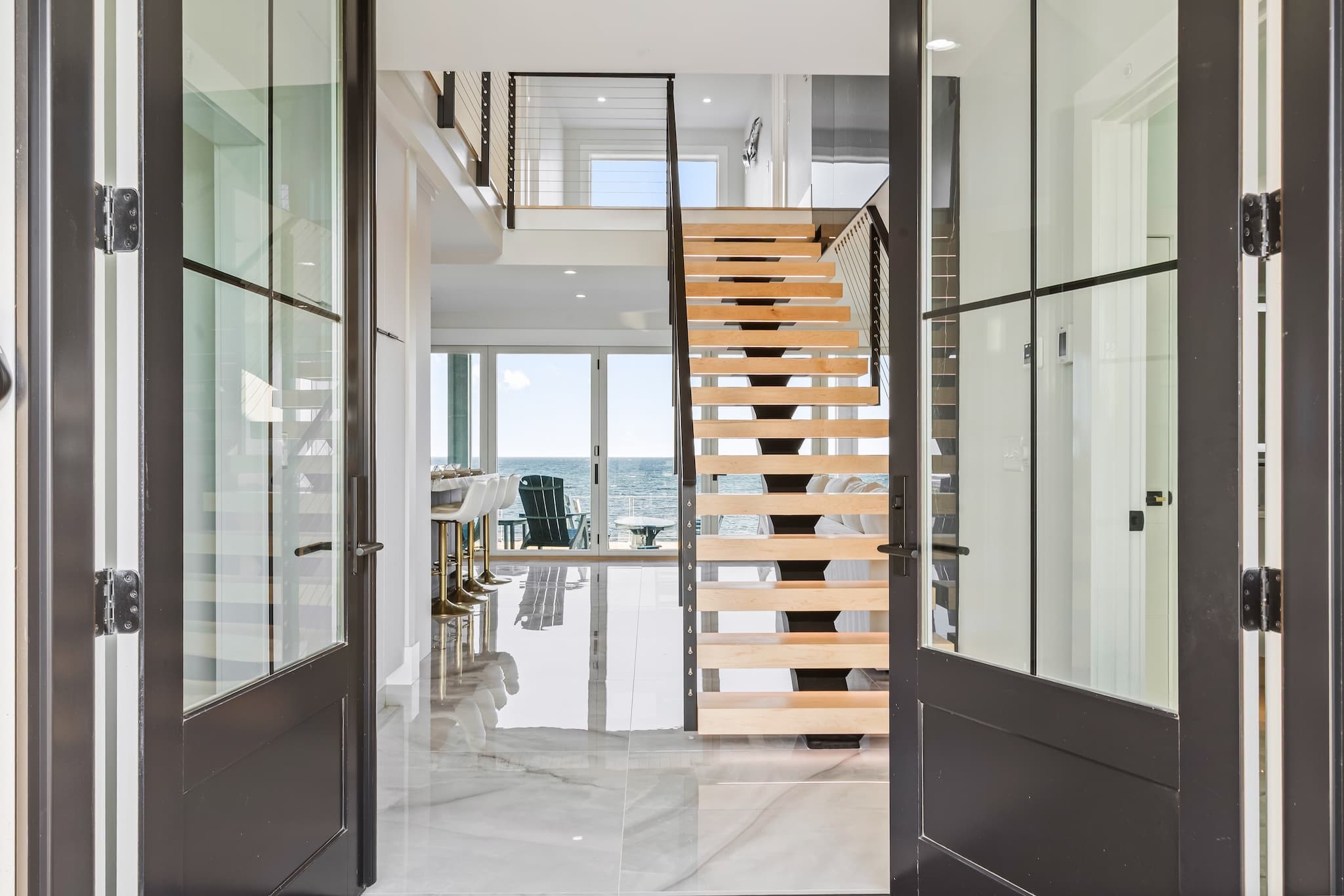 • Floor-to-ceiling windows showcasing the ocean