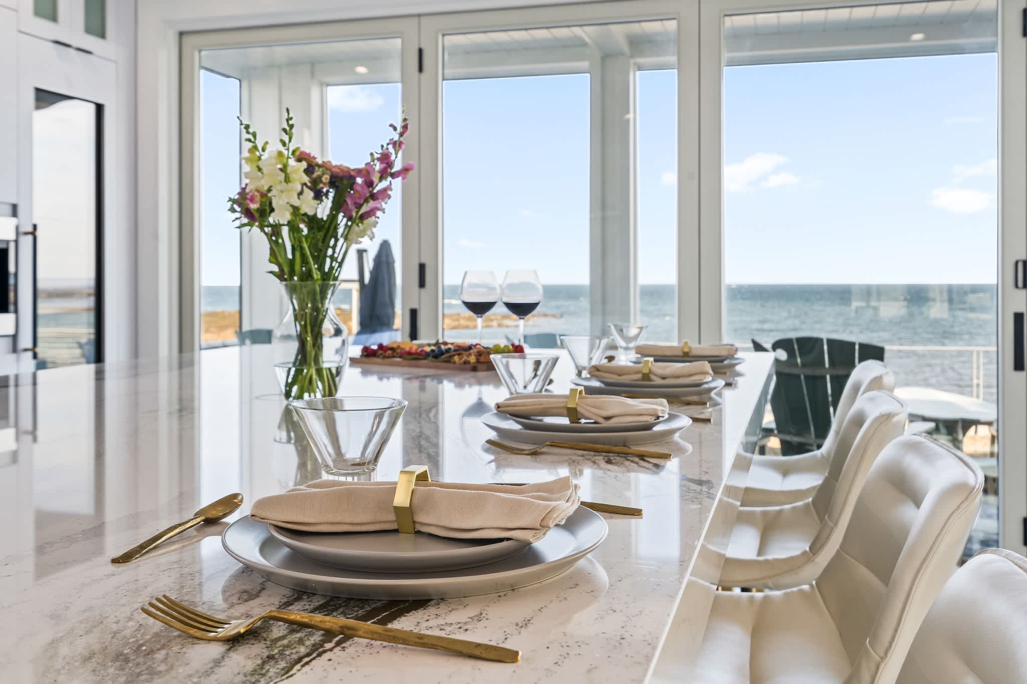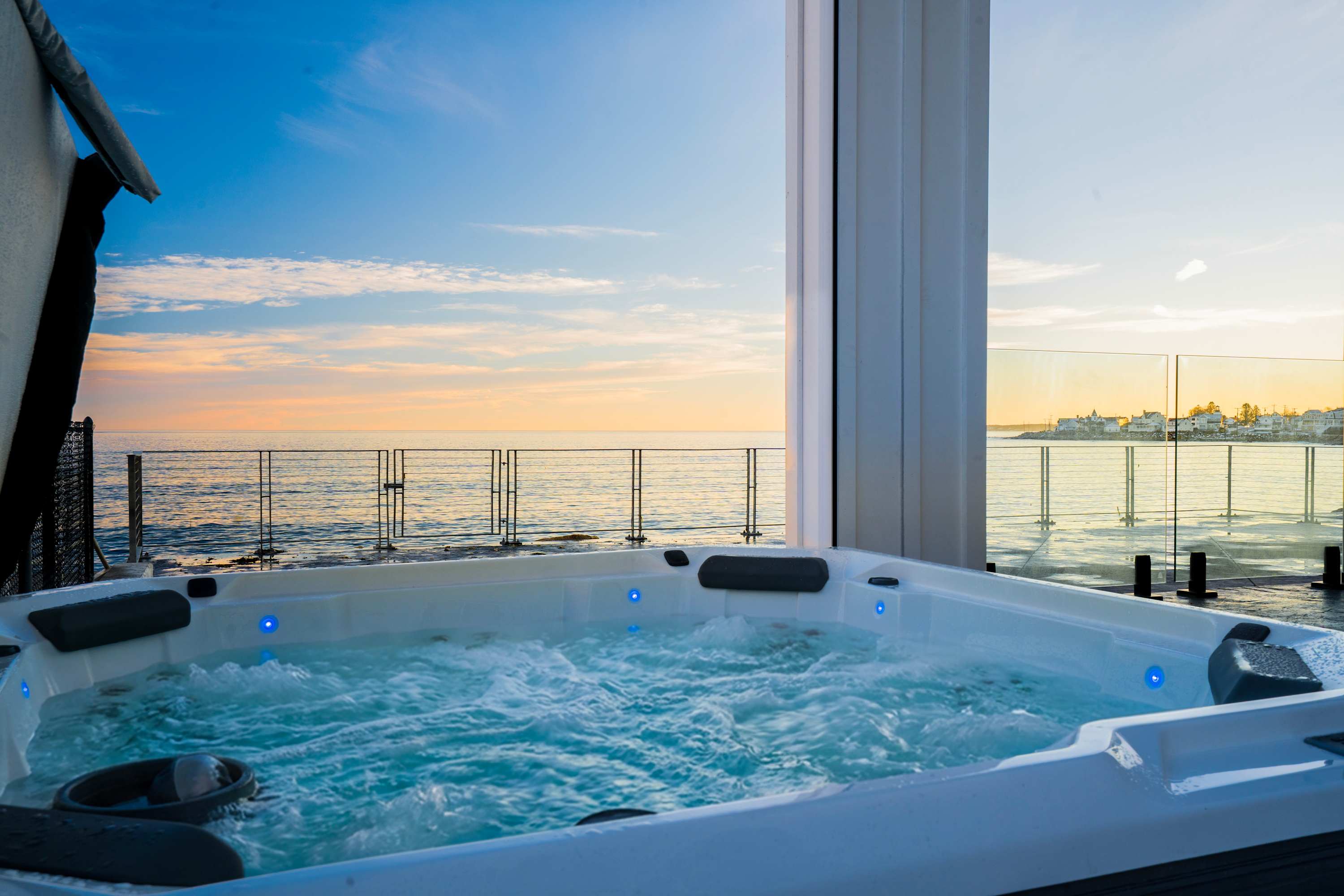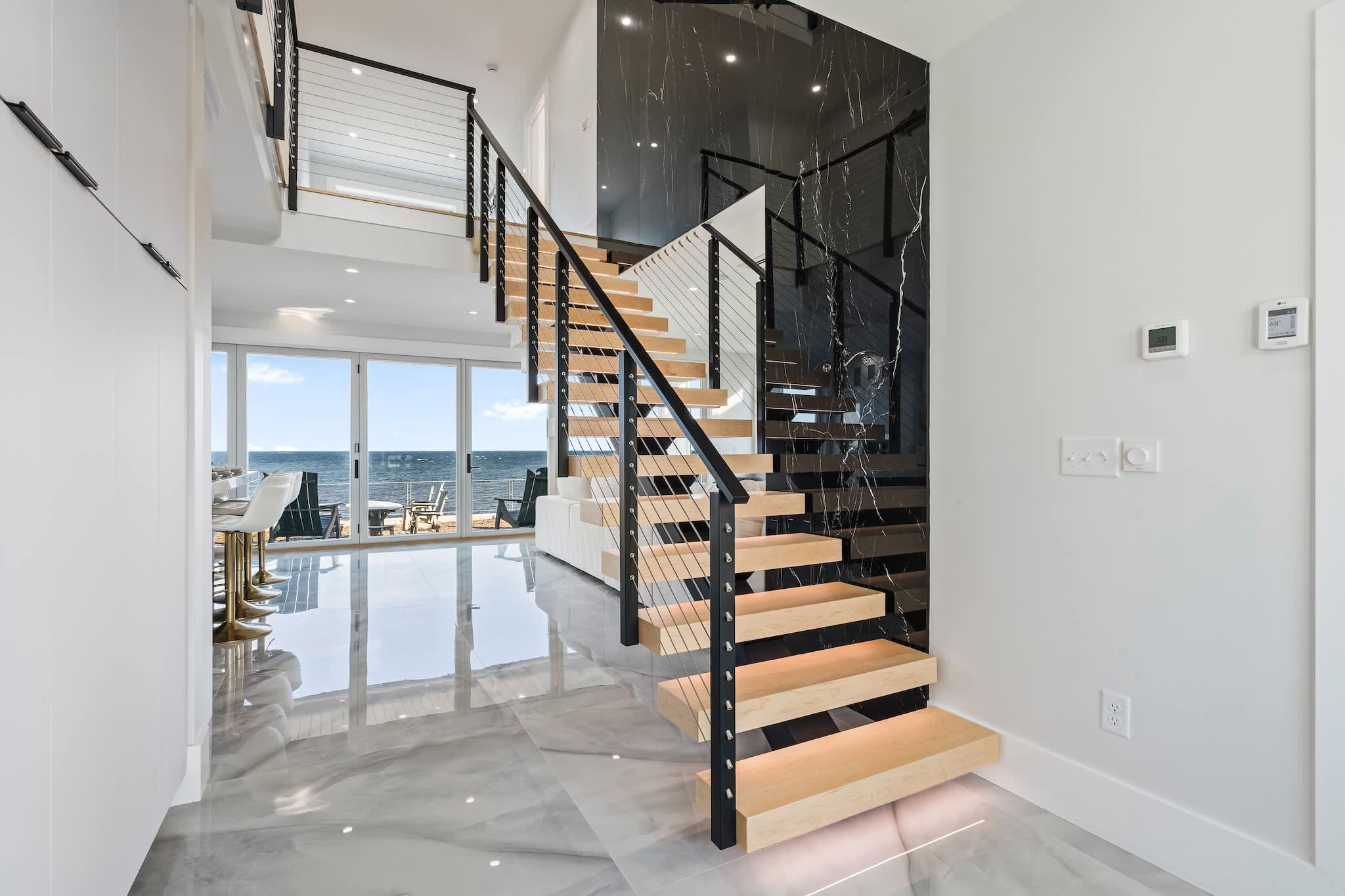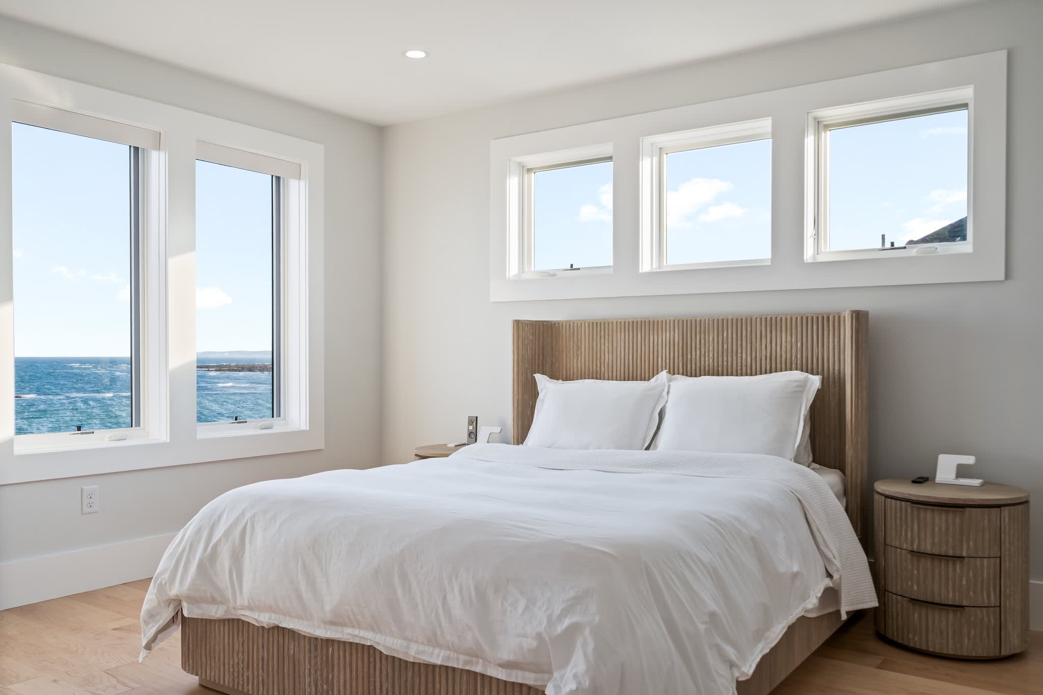 • Floor-to-ceiling windows showcasing the ocean