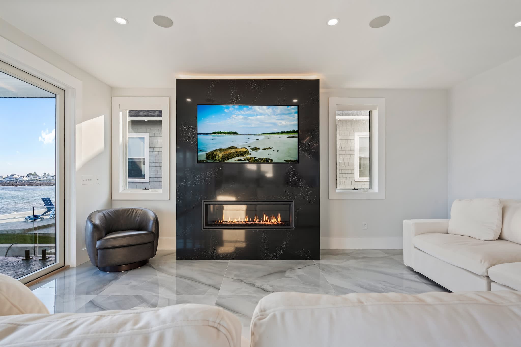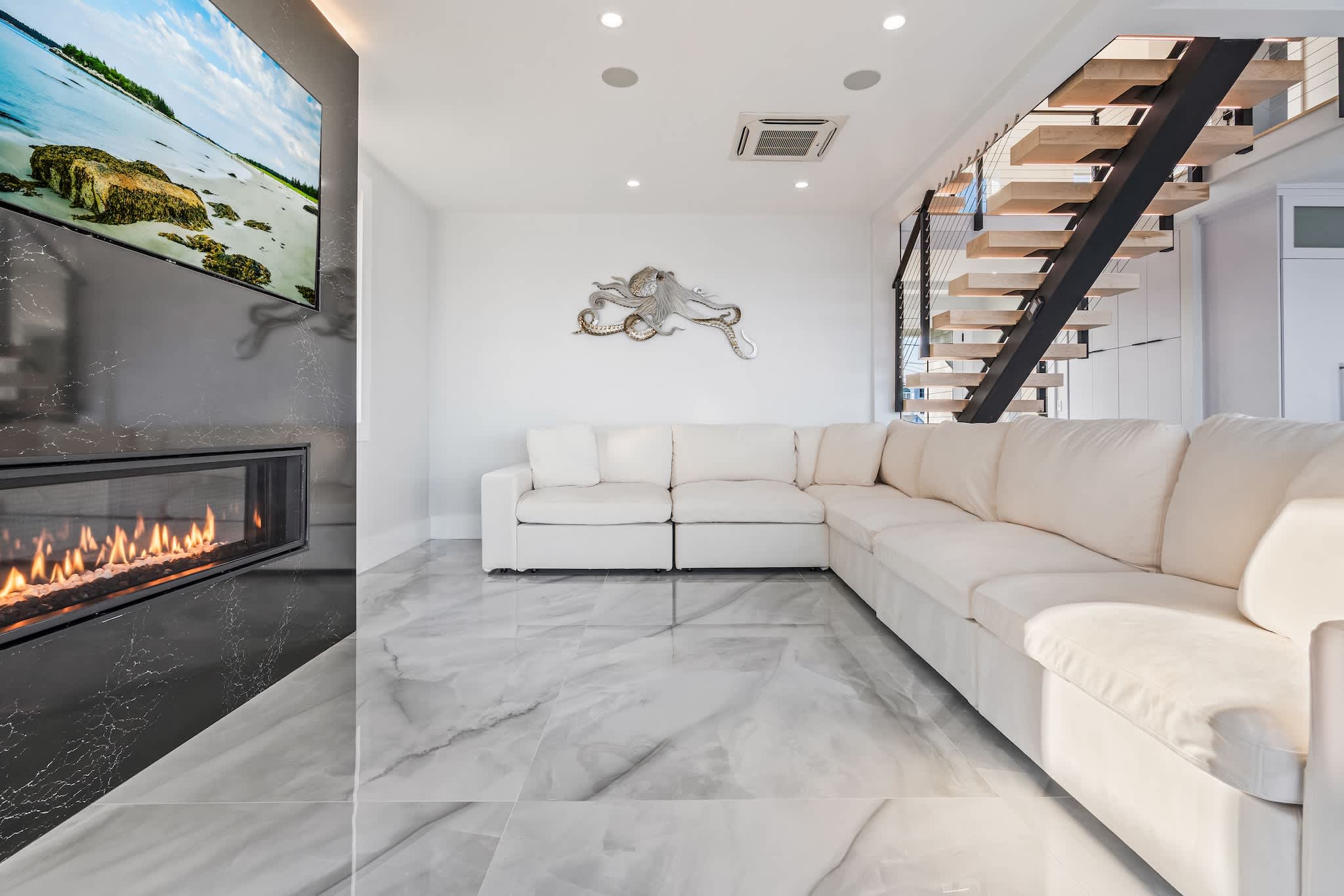 • Open-concept living room with oversized sofa, large smart TV & indoor fireplace