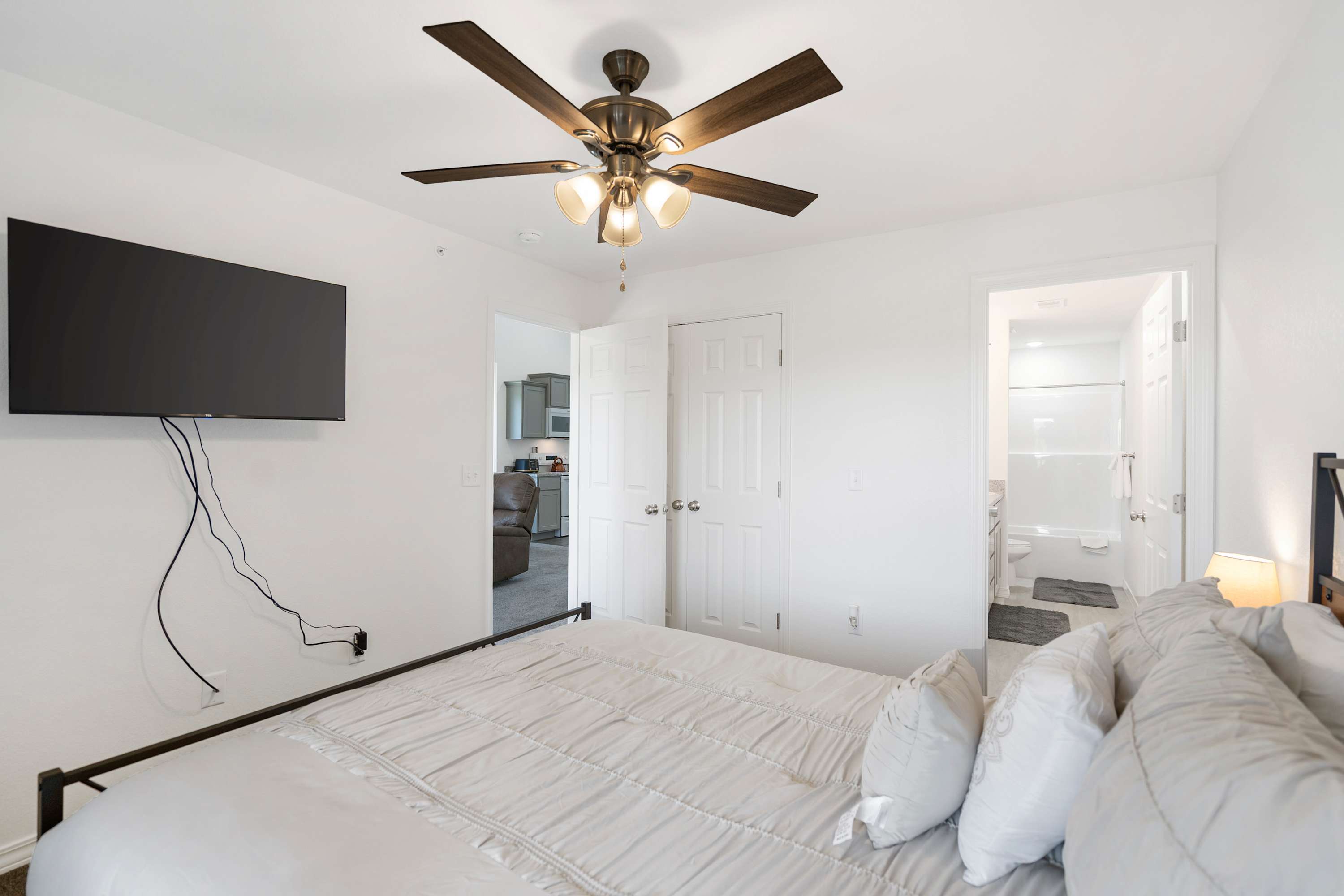 Bedroom #2 includes a queen size bed, a smart TV, deck access, and an ensuite bathroom with a dual vanity and a shower/tub combo.