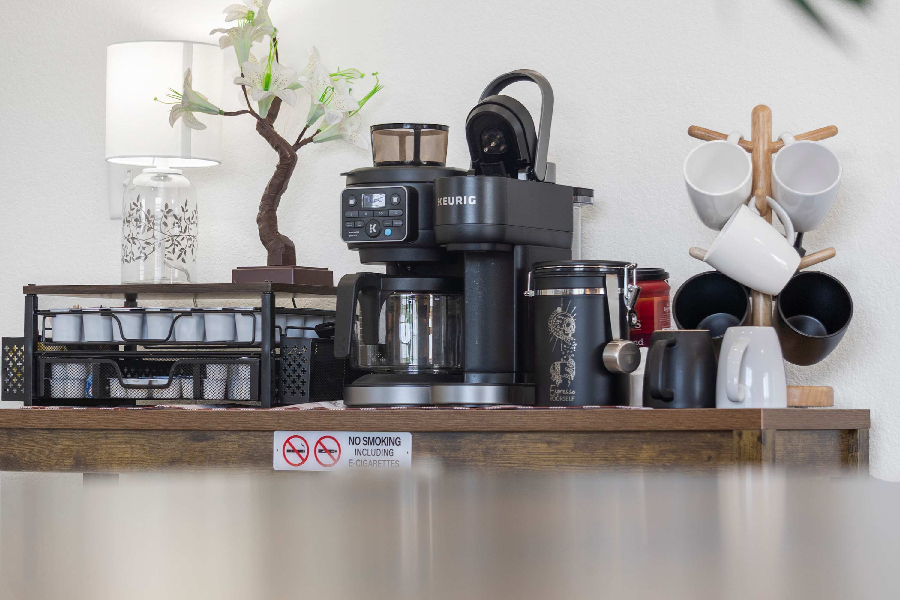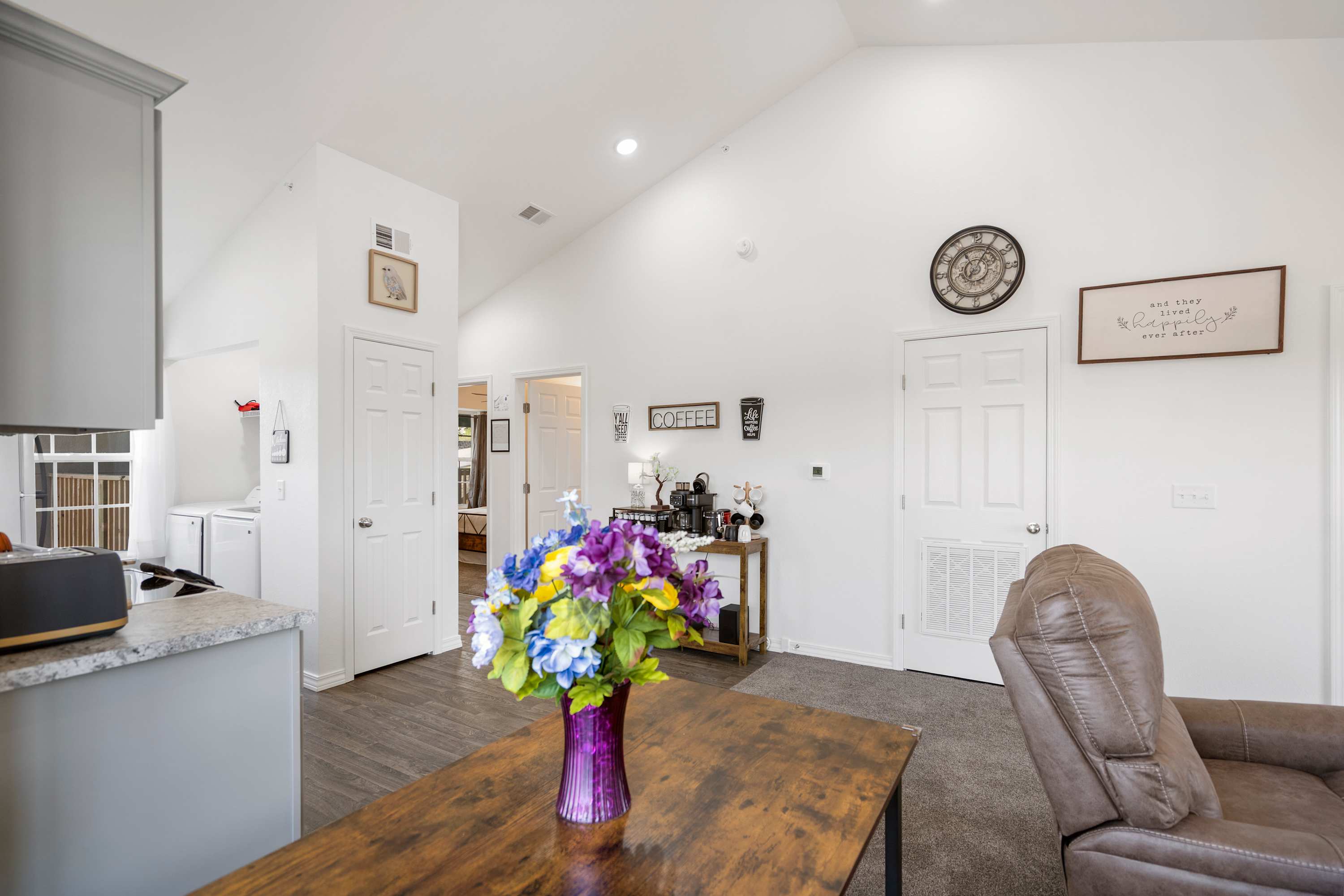 Back inside, the fully stocked kitchen is as charming as it is functional, with soft gray cabinets, gleaming white appliances, and a coffee bar complete with both drip and Keurig options to start your mornings just right. Whether you’re enjoying a quick breakfast at the dining table for four or preparing dinner after a day of adventures, everything you need is right at your fingertips.