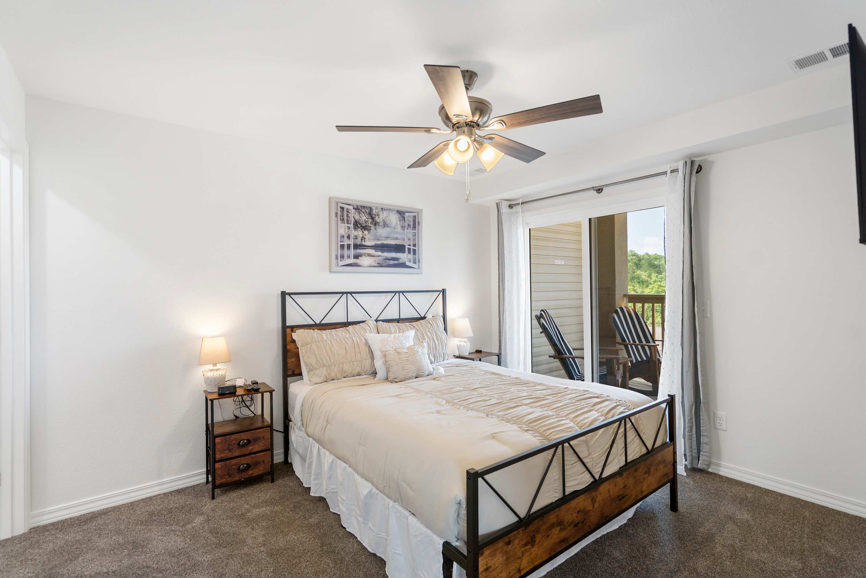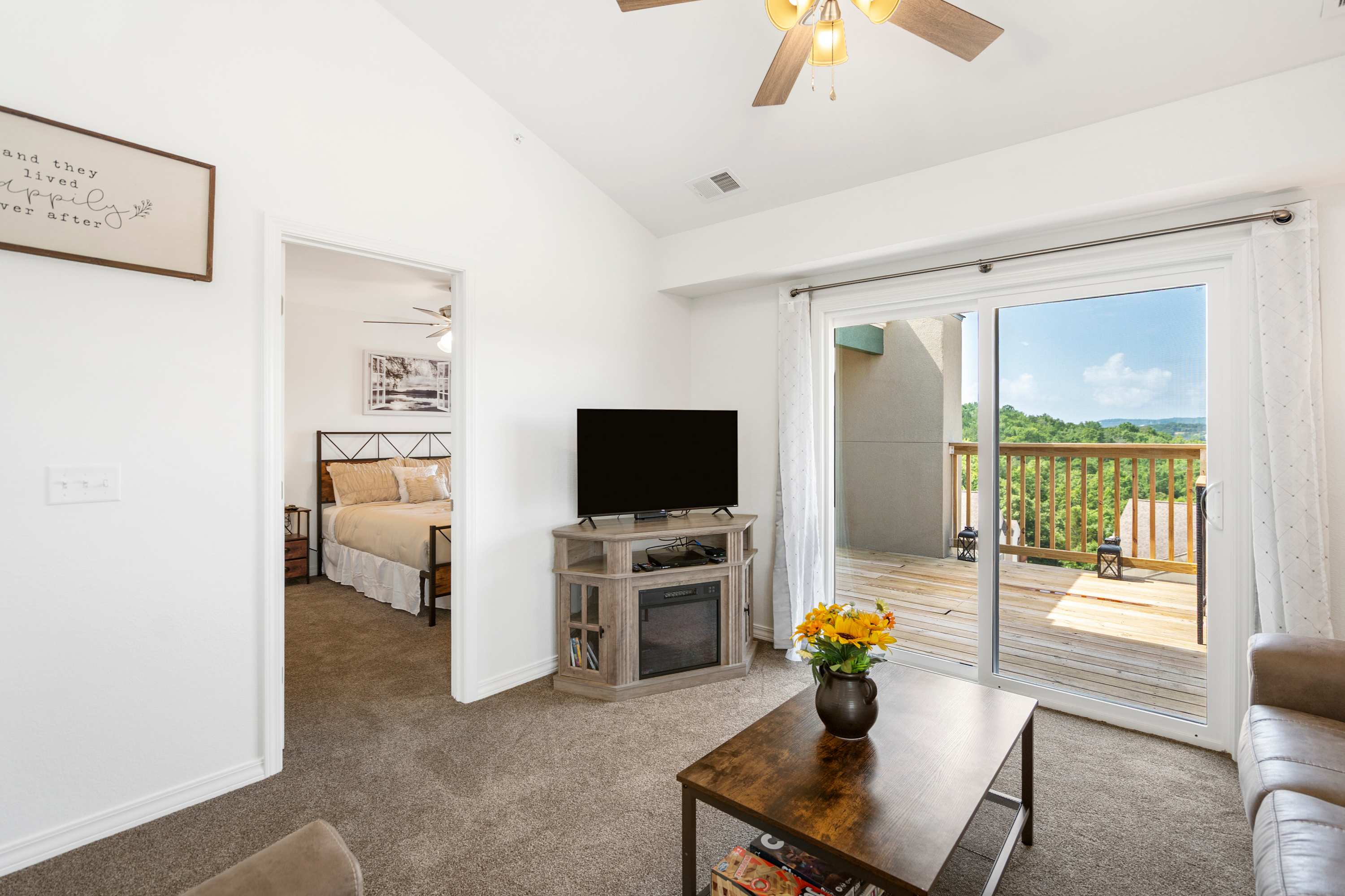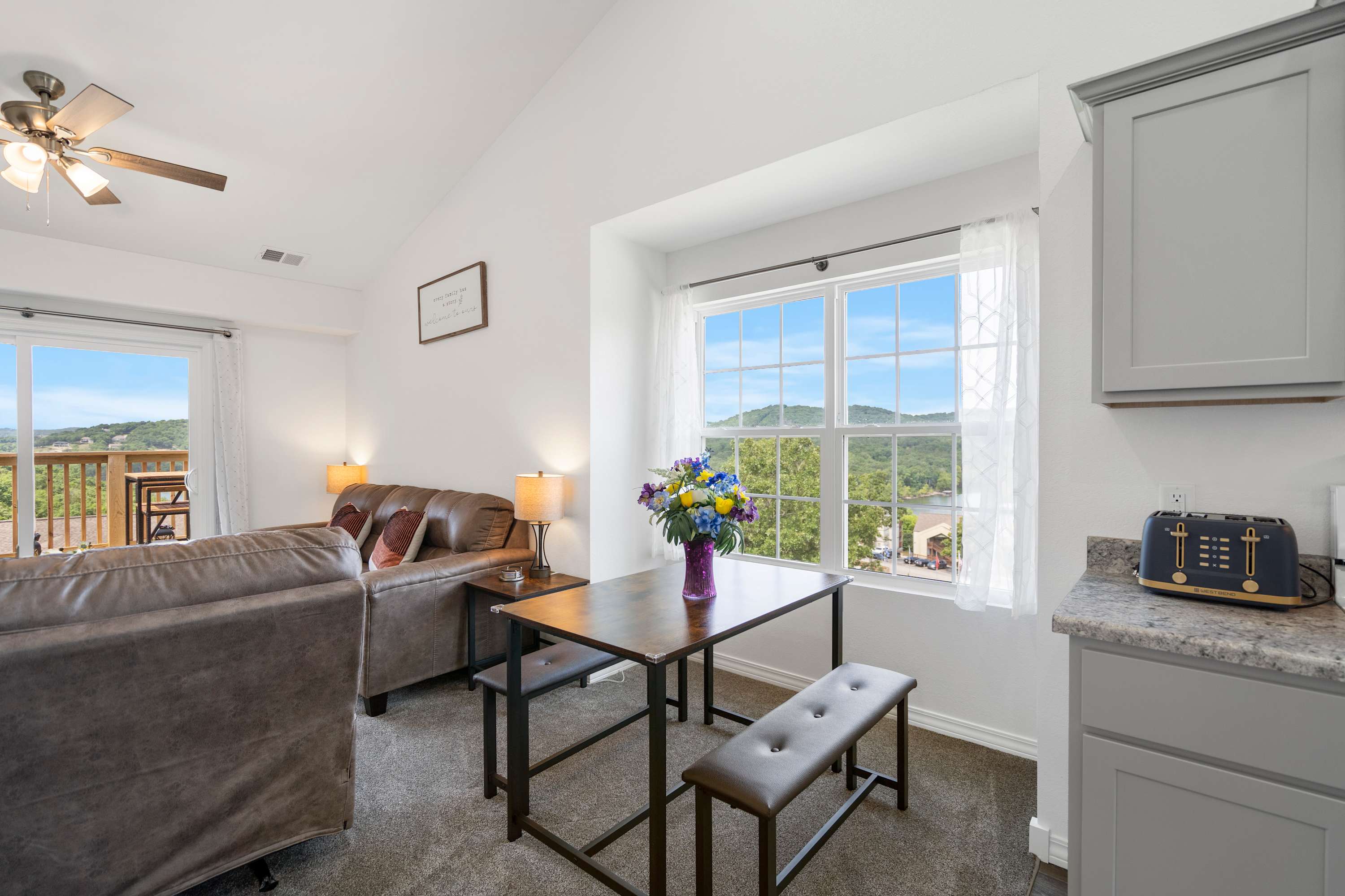 Step inside your serene retreat and feel the worries of the day melt away. The open-concept living and dining area is cozy and bright, with a plush sofa and armchair set before a smart TV—perfect for movie nights or catching the game. Light flows in through the sliding glass doors, drawing you toward the balcony where a table for four and extra seating awaits. It’s the perfect perch to sip a drink and take in the sweeping views of Table Rock Lake below.