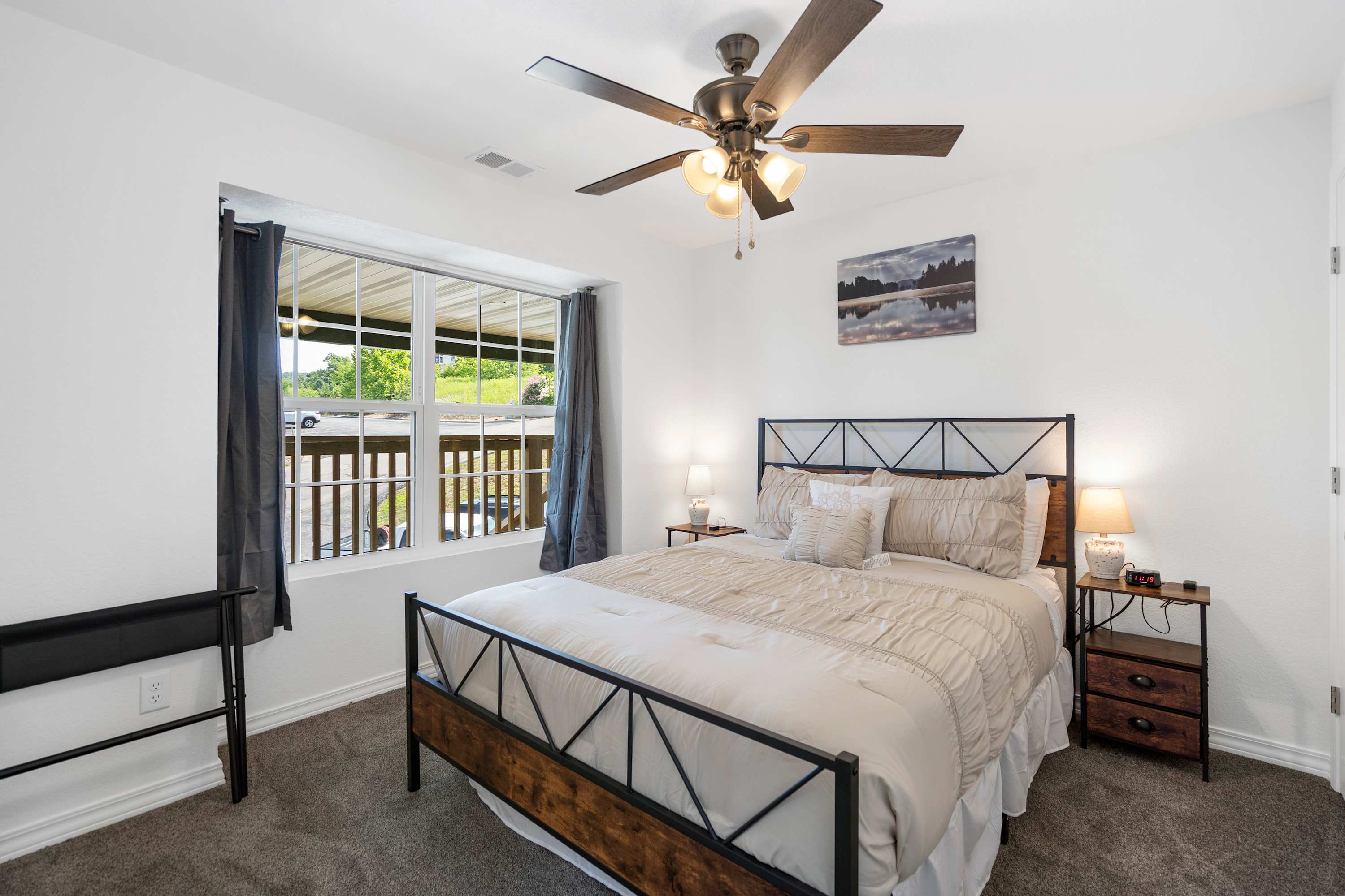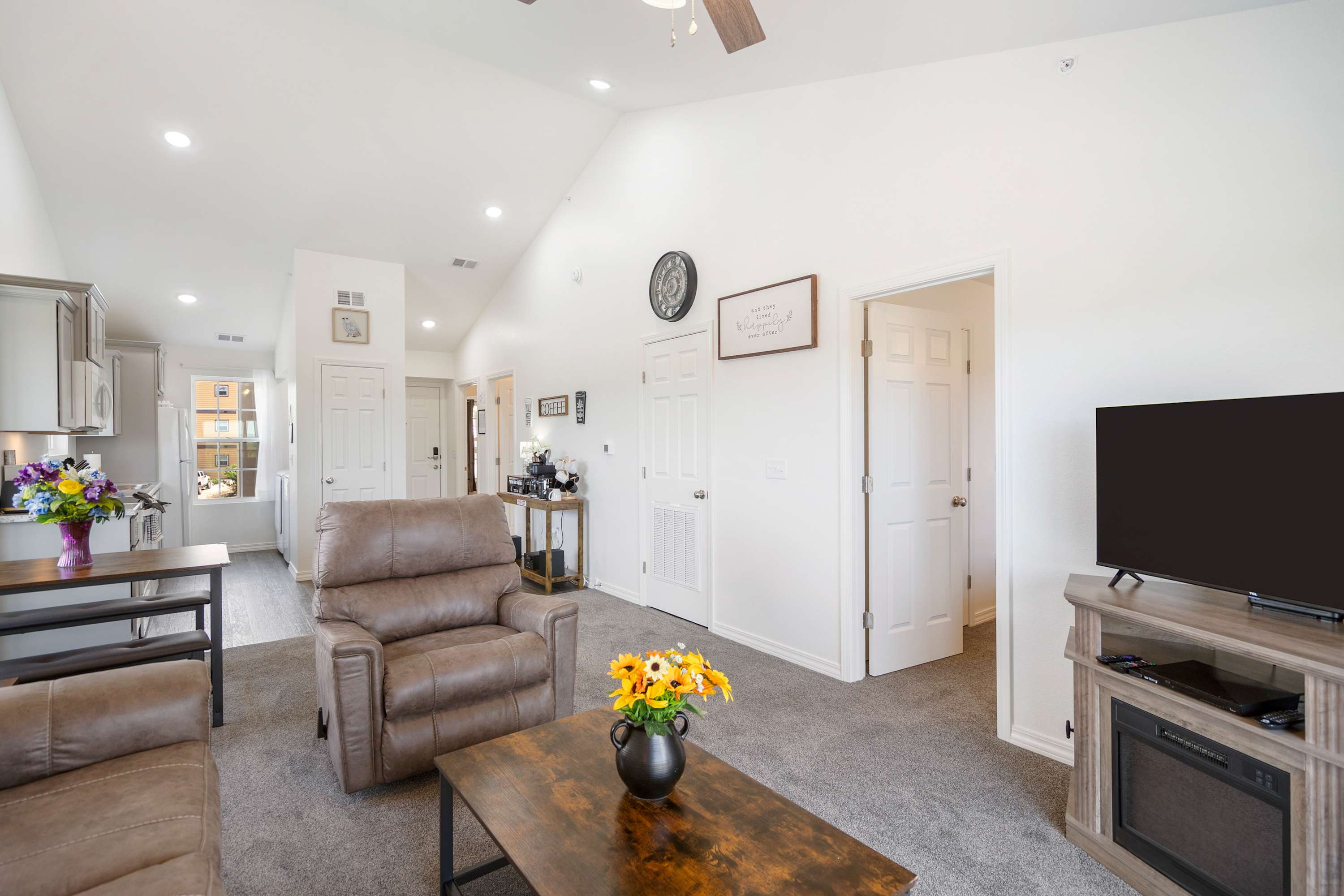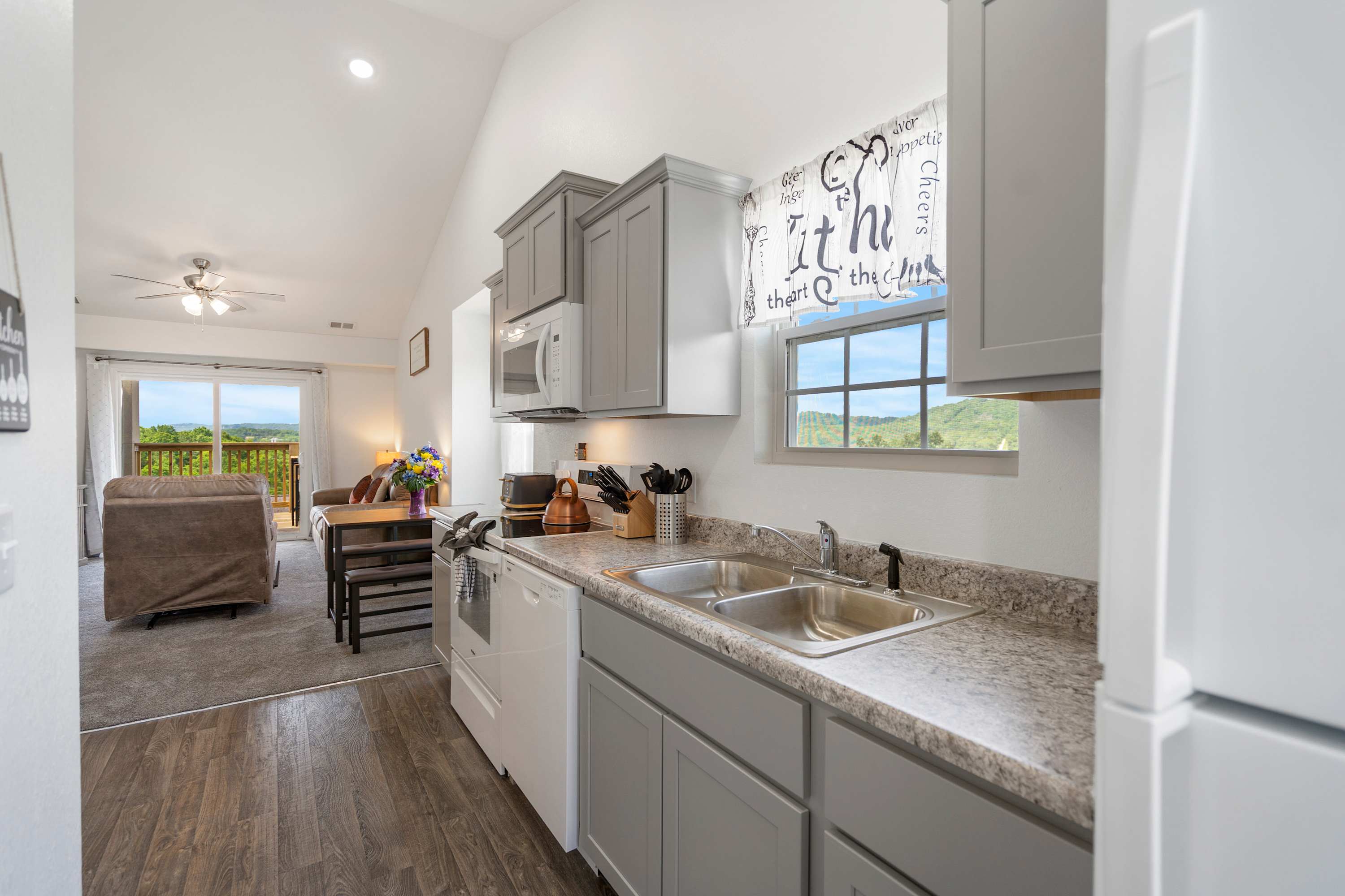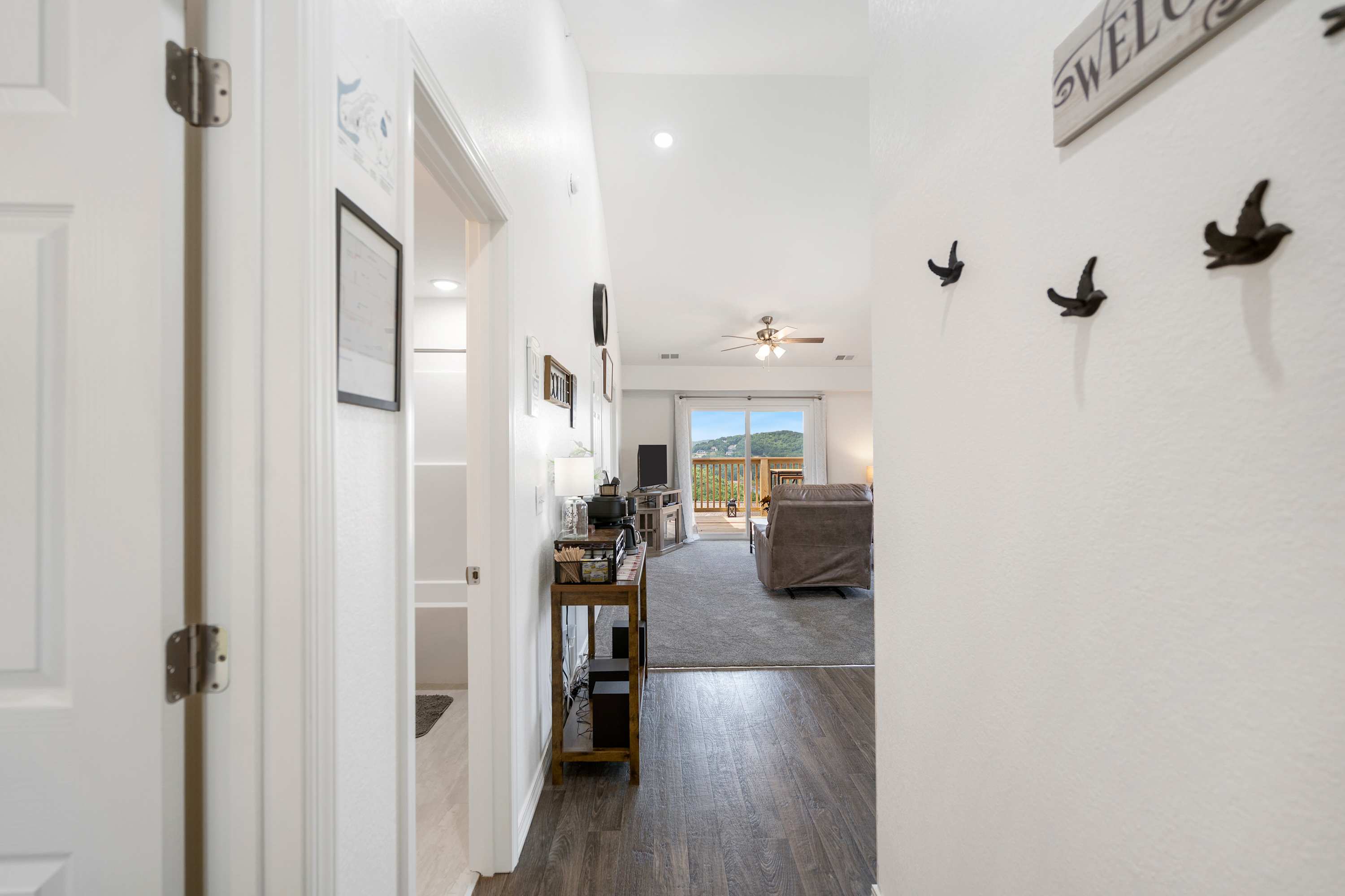 Step inside your serene retreat and feel the worries of the day melt away. The open-concept living and dining area is cozy and bright, with a plush sofa and armchair set before a smart TV—perfect for movie nights or catching the game. Light flows in through the sliding glass doors, drawing you toward the balcony where a table for four and extra seating awaits. It’s the perfect perch to sip a drink and take in the sweeping views of Table Rock Lake below.