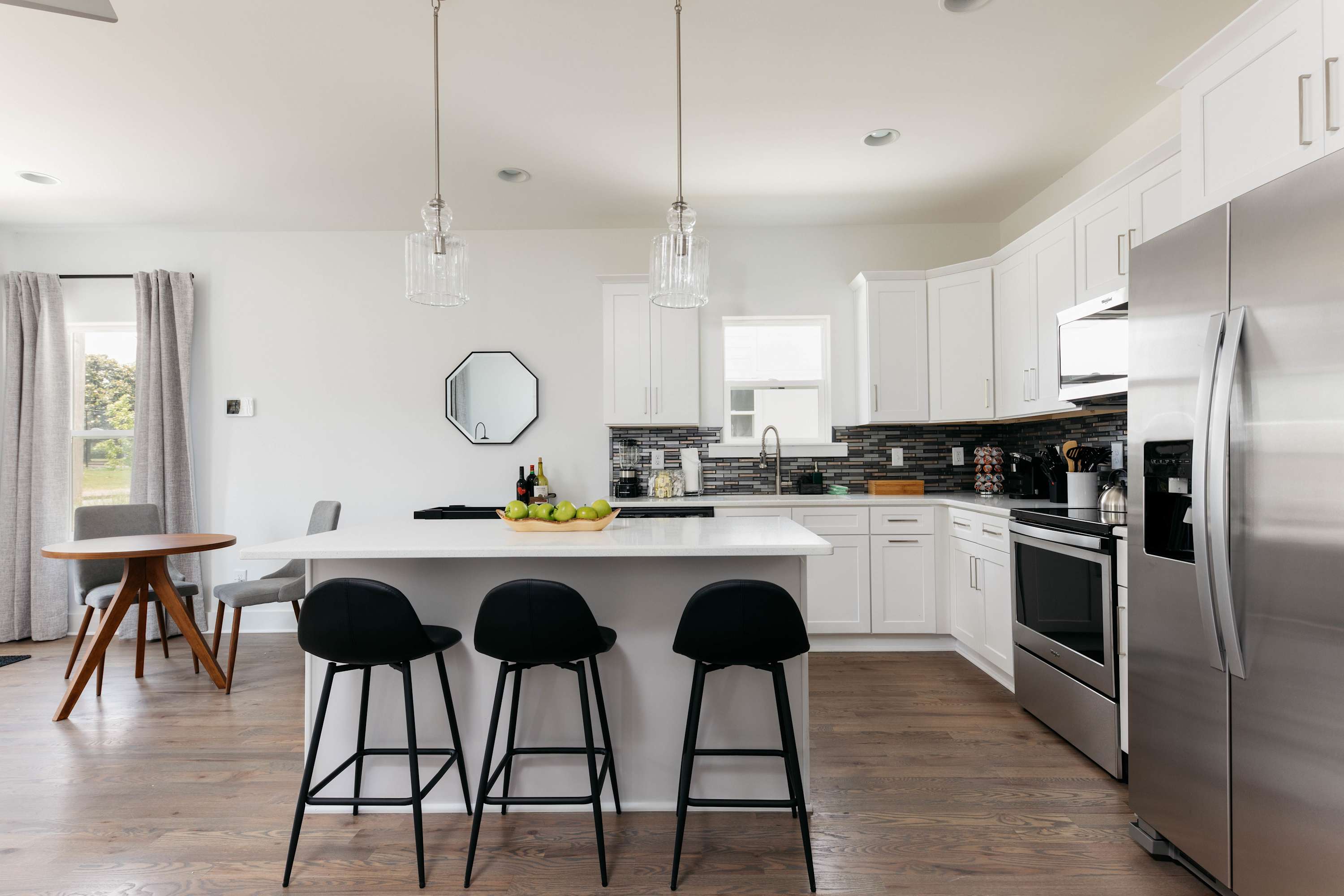 Spread across three levels, this home features a cozy, light-filled living area, a chef-ready kitchen with stainless steel appliances, and a spacious island for gathering. Each bedroom is uniquely styled with plush bedding, vibrant accents, and modern finishes that pop in photos. Wi-Fi, smart TVs, and self check-in make your stay as seamless as it is comfortable.