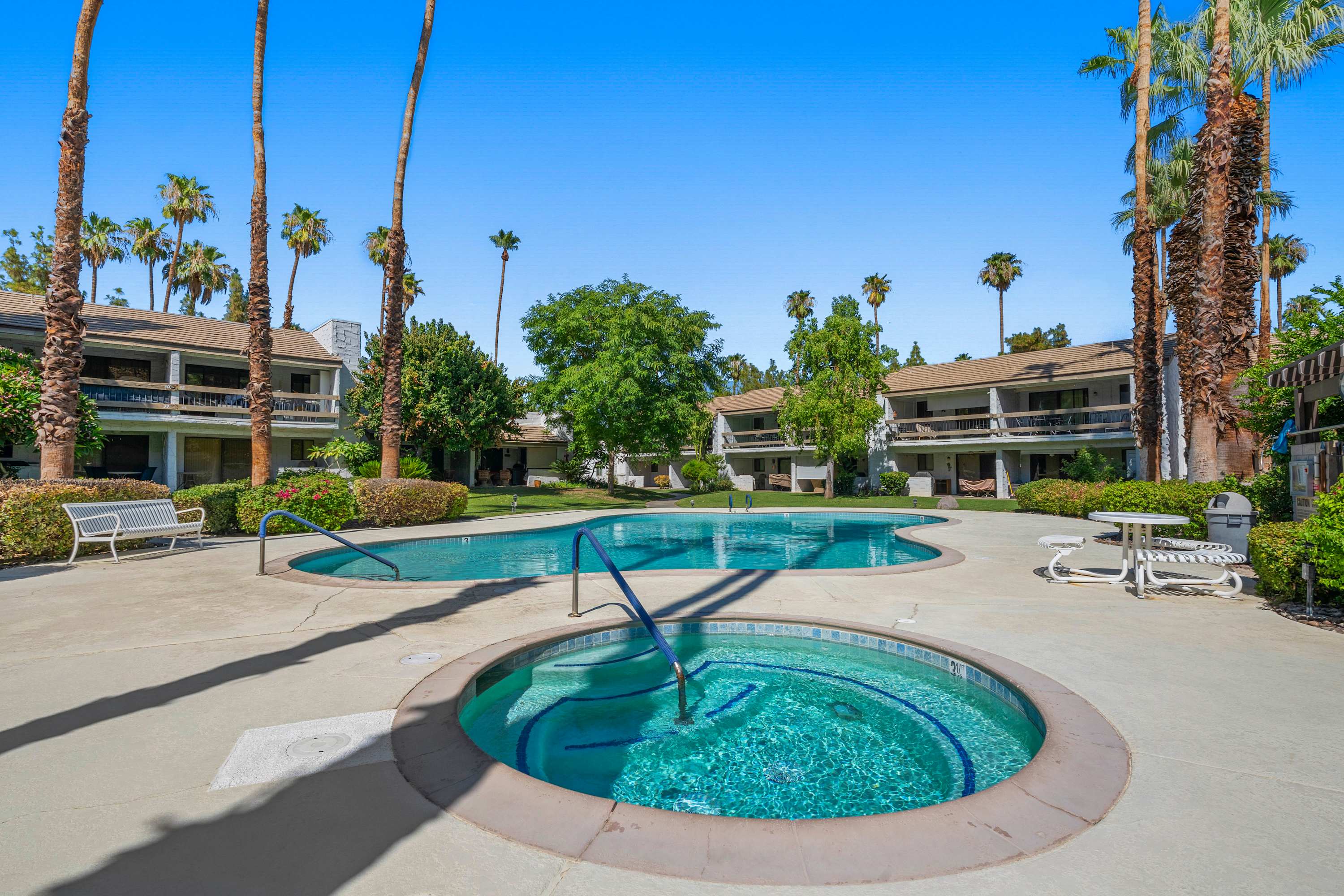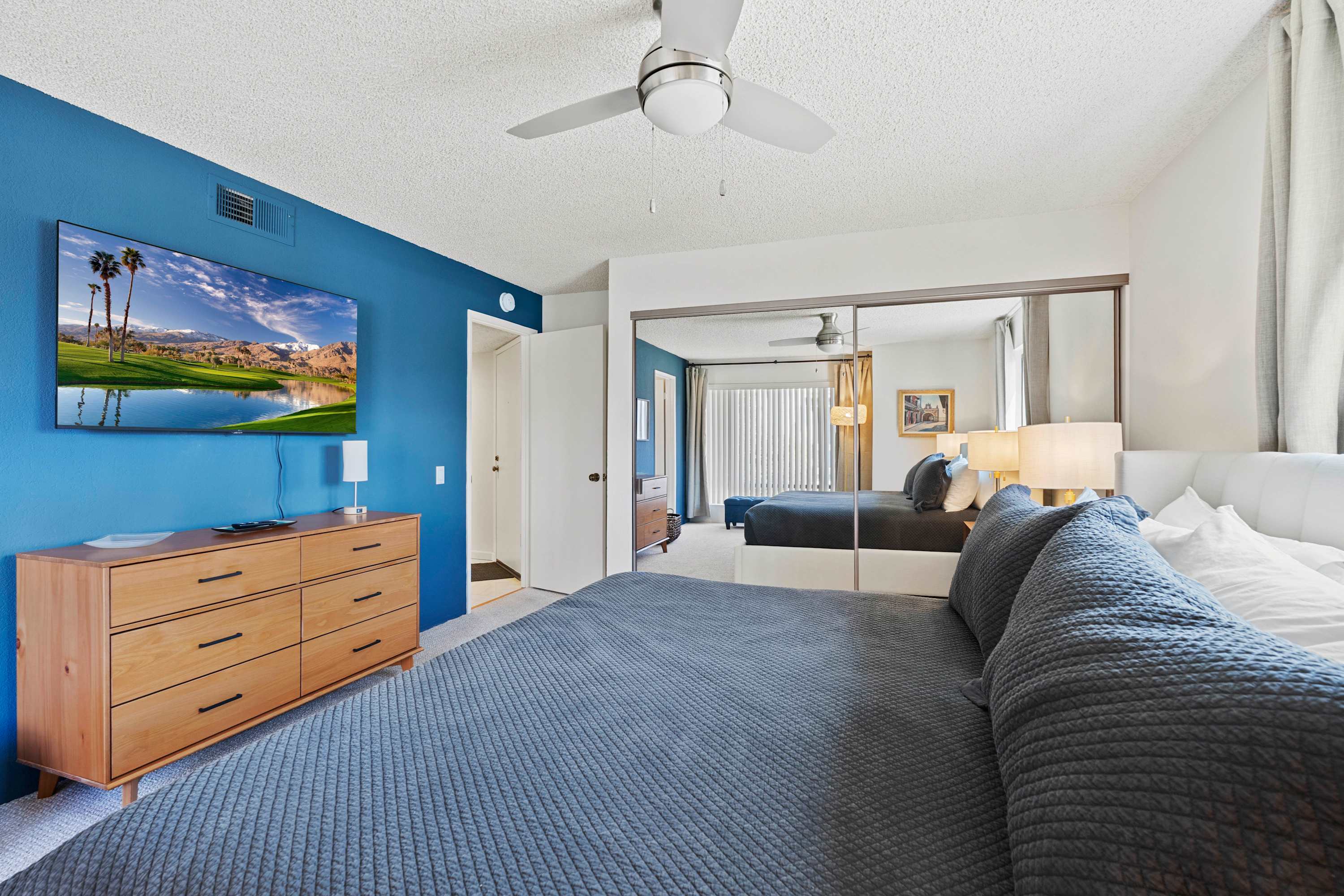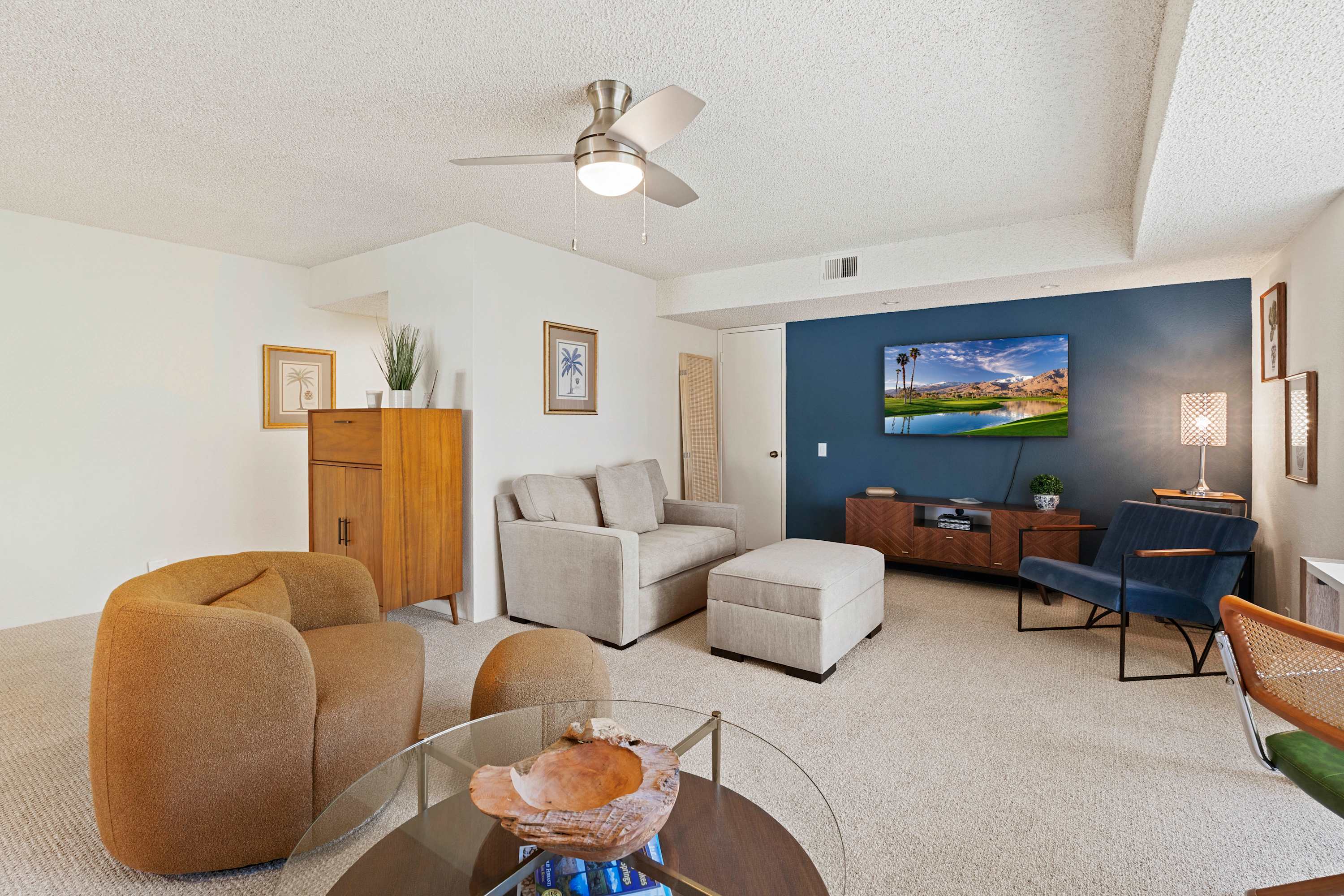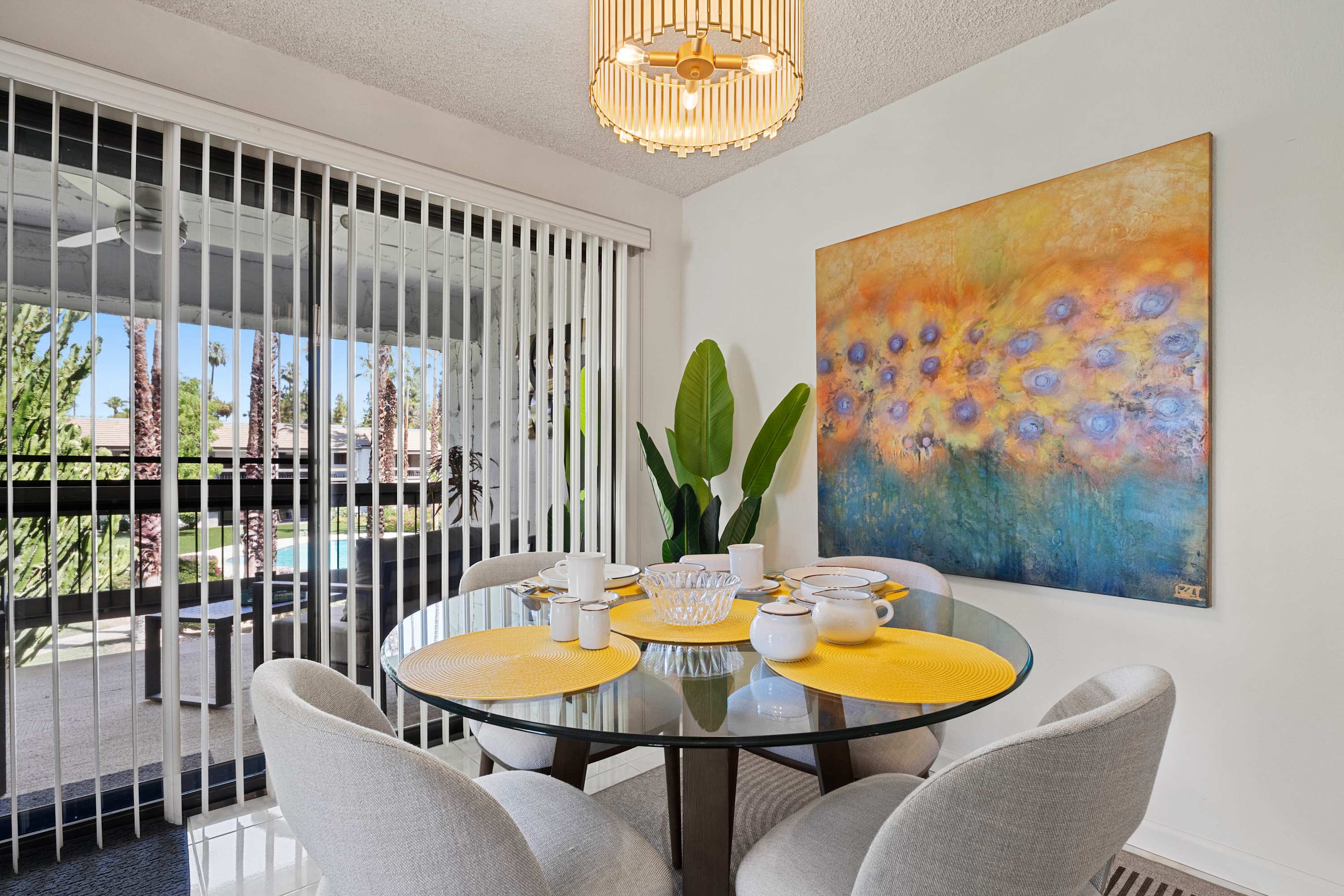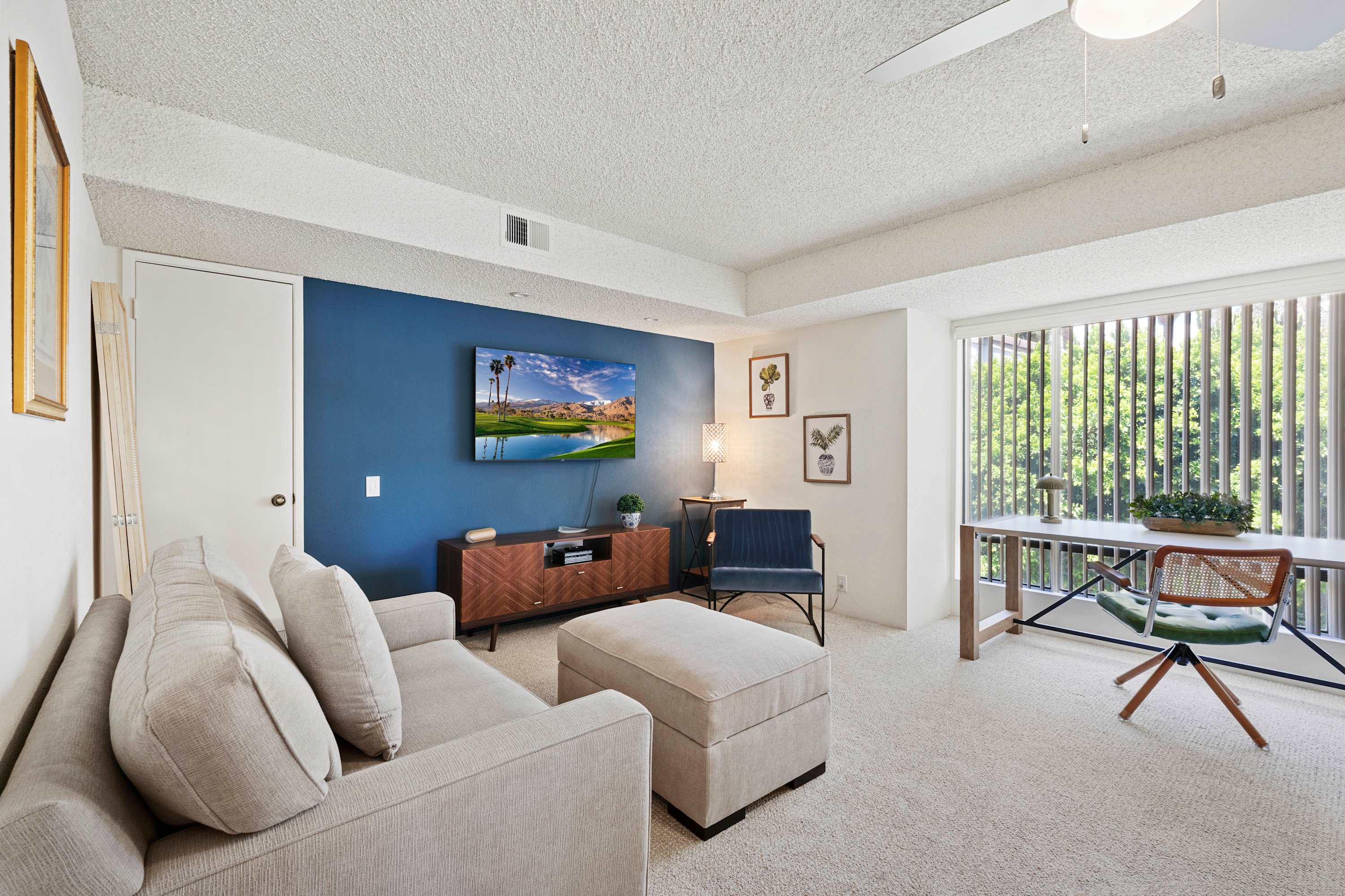 Welcome to your sun-kissed escape at Palm Canyon Villas, a resort-style oasis in Palm Springs designed for relaxation and connection. Whether you're planning a romantic getaway for two or a cozy retreat for three, this upper-level condo offers comfort, charm, & access to top-tier amenities. Spend your mornings lounging by the sparkling pool or unwinding in the spa, then challenge your partner to a game of tennis/pickleball just steps from your door at Sunset Palmar.
