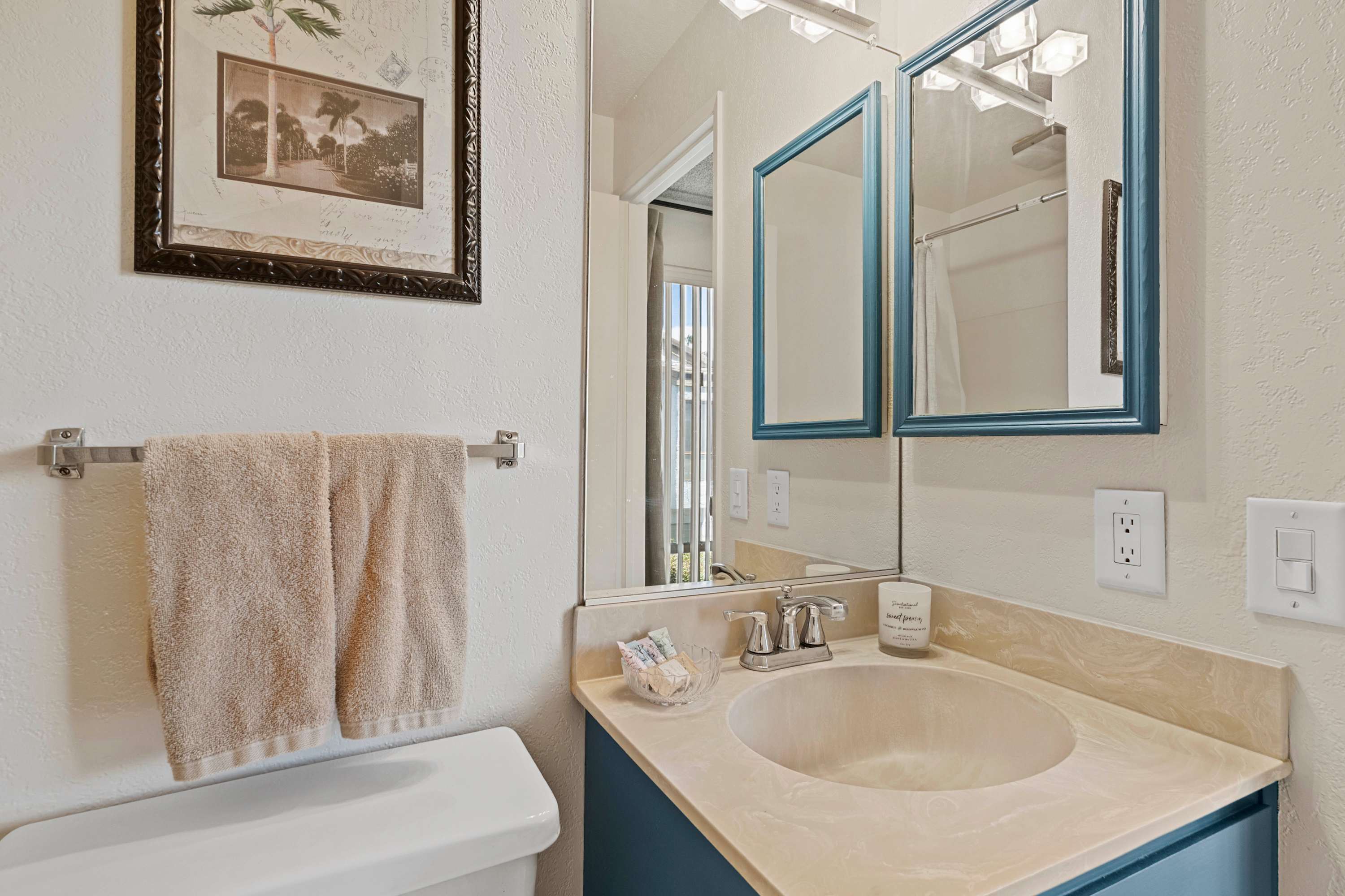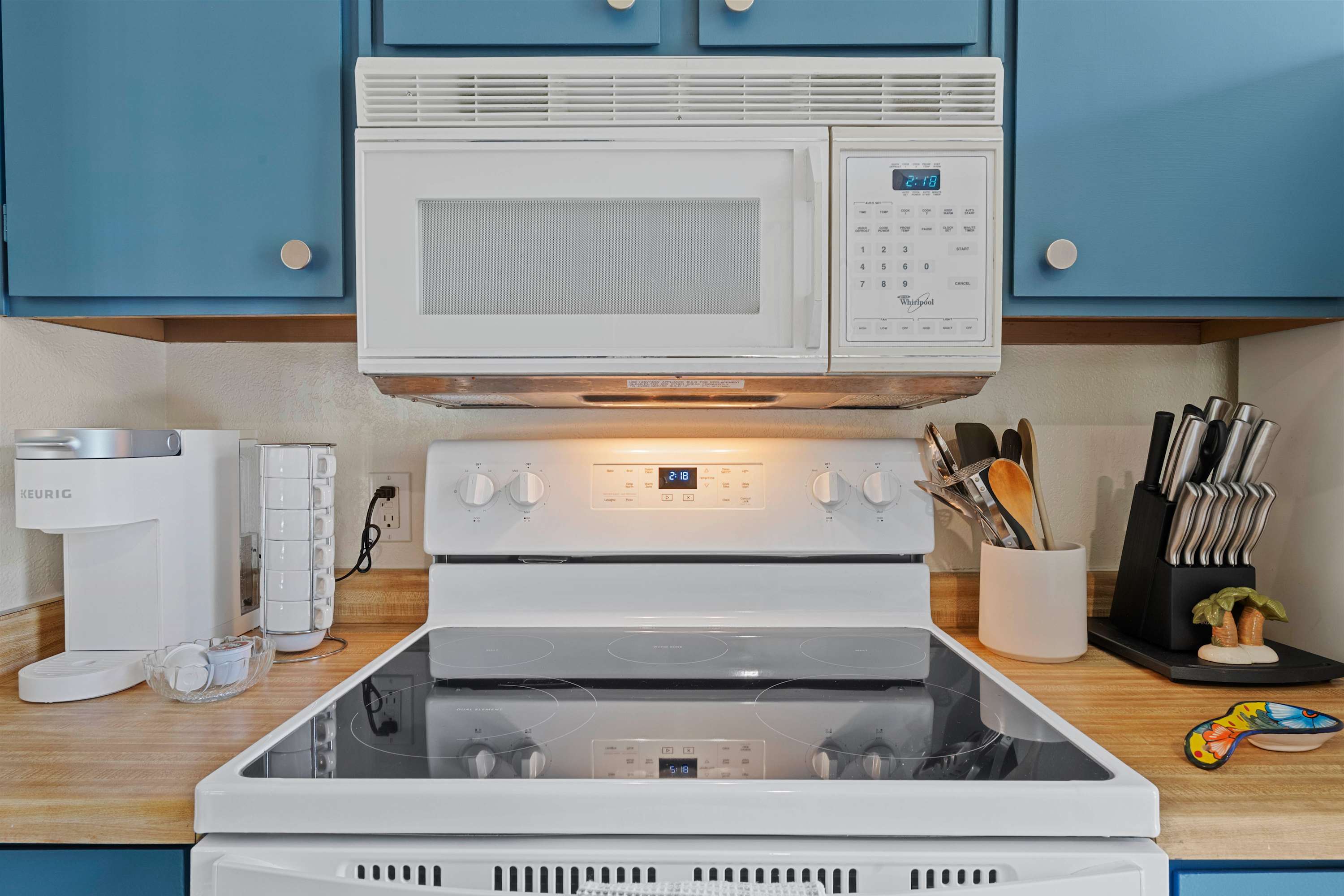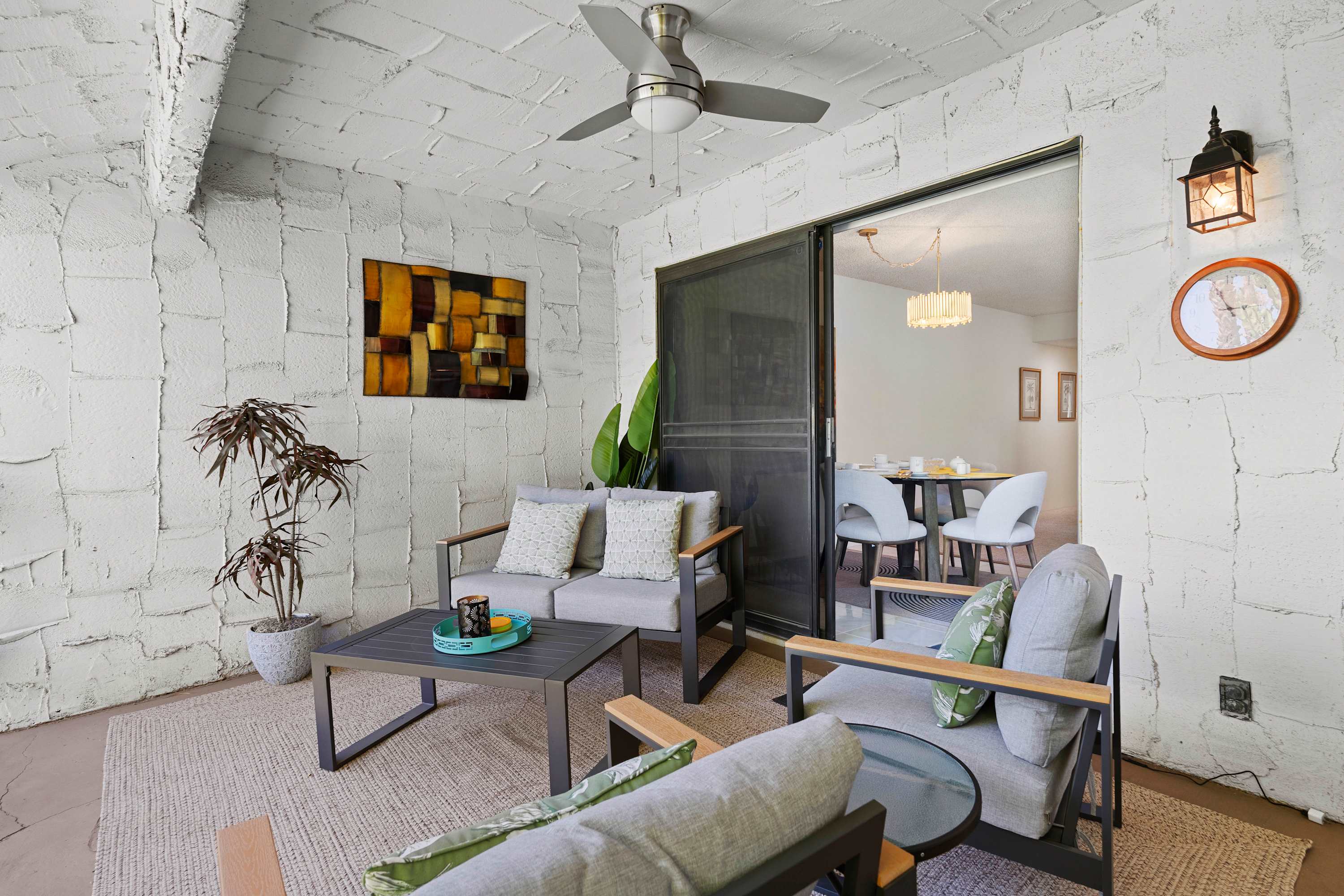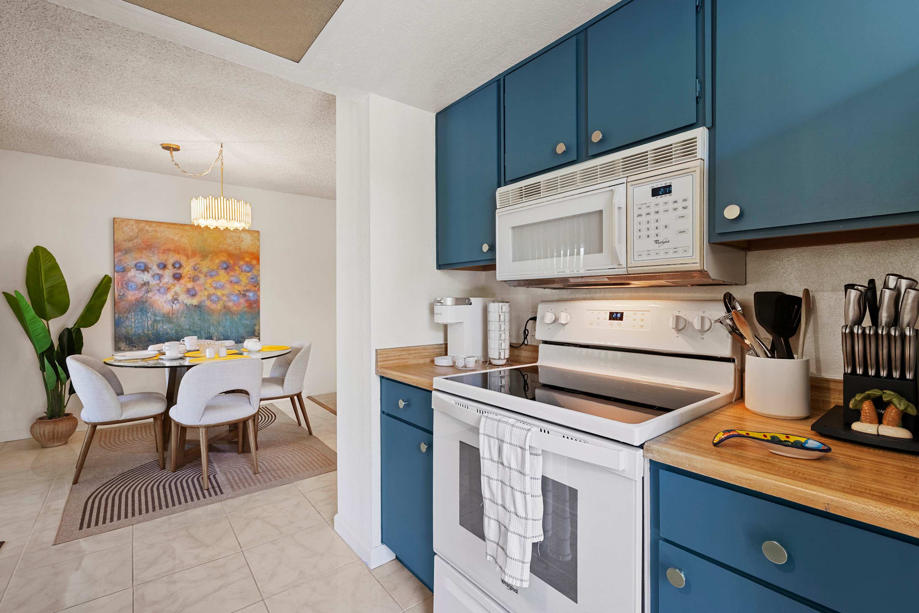Inside, this home blends laid-back style with functionality. The living room features a plush couch and two inviting armchairs with an ottoman—perfect for movie nights in front of the smart TV. A desk sits by the window, offering a bright spot to work or journal during your stay. The kitchen greets you with cheerful blue cabinets, white appliances, and a Keurig for your morning brew. A dining table for four sits near the sliding glass doors, leading to a covered balcony where you can relax in comfortable seating and enjoy tranquil views of the garden and pool below. When it's time to wind down, the bedroom is your private retreat, complete with room-darkening shades to ensure restful sleep.