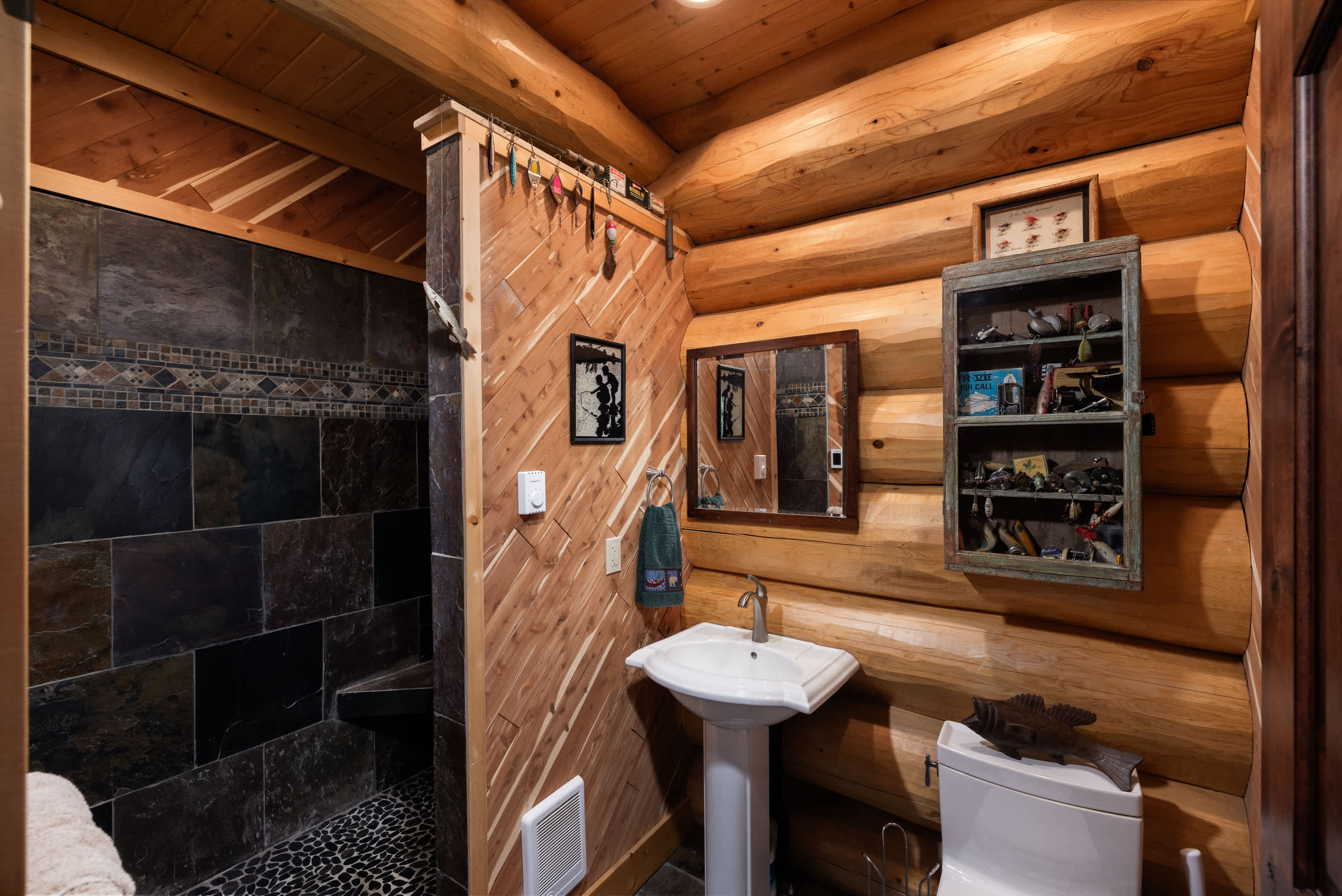 This home also includes an additional full guest bathroom with a pedestal sink and a walk-in shower.