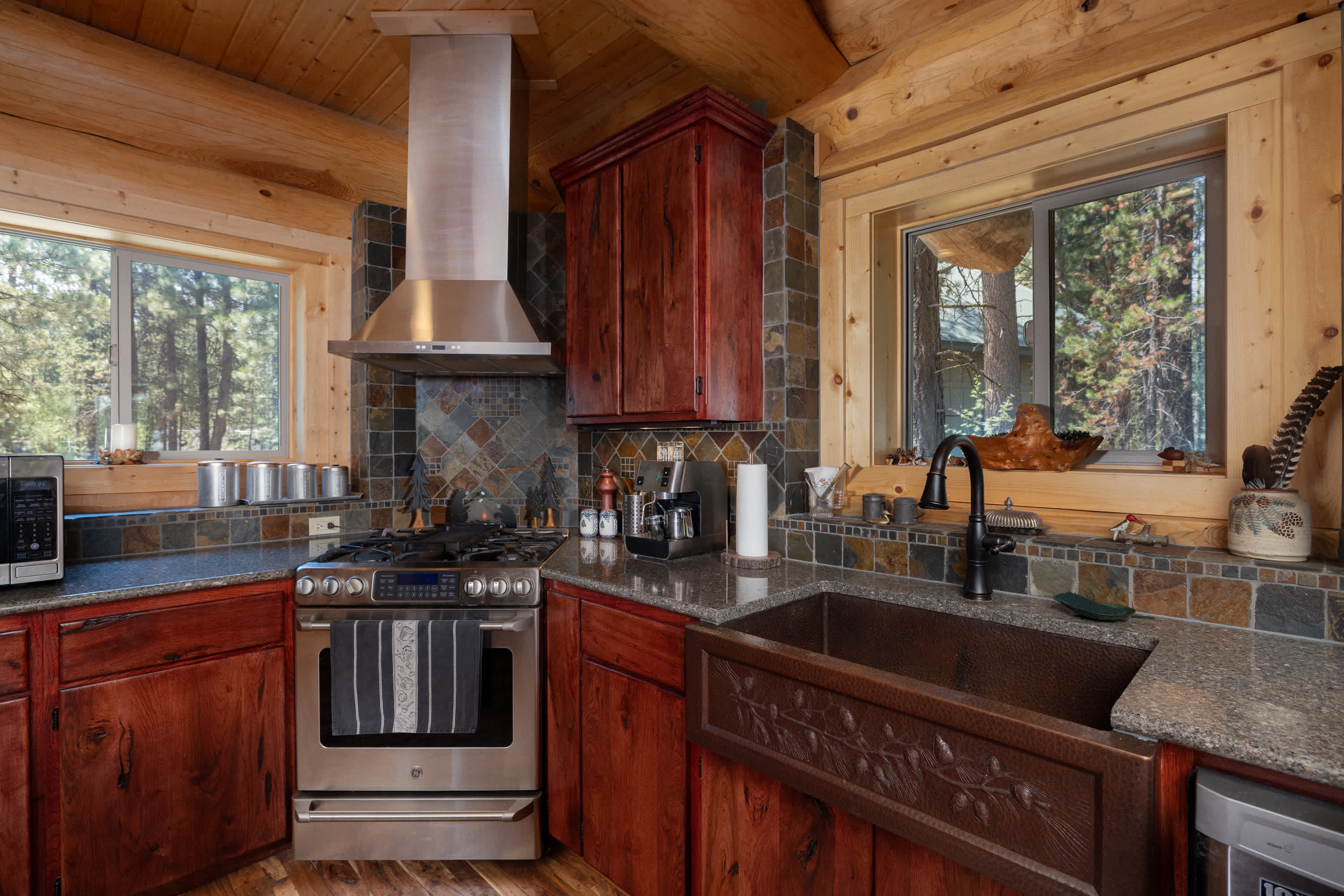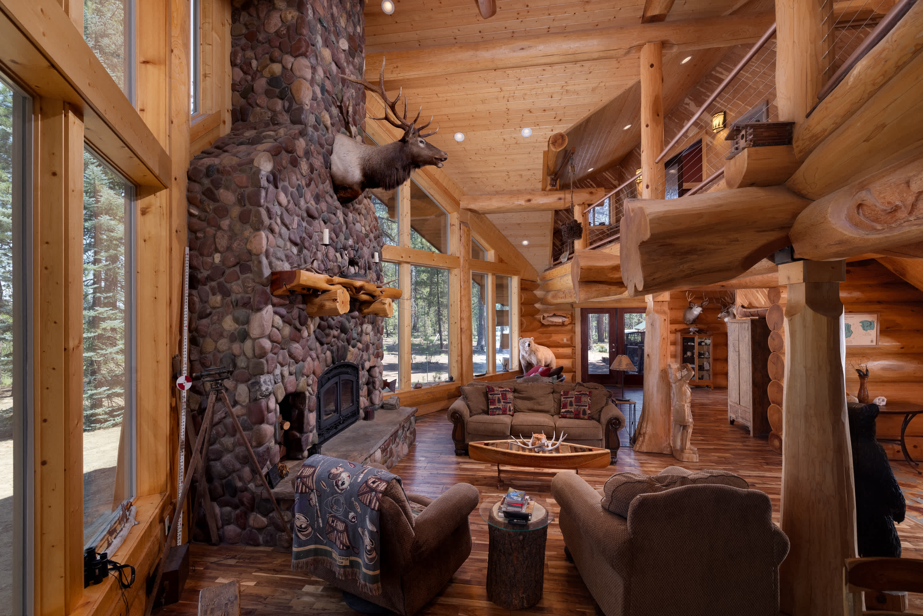 Step inside and be welcomed by soaring peaked ceilings and the warm, rustic charm of a true log cabin. The spacious living room invites you to relax by a grand floor-to-ceiling stone fireplace, framed by tall windows that capture breathtaking views. Sink into the couch or cozy armchairs with a board game and a cup of coffee in hand. The kitchen is equally inviting, with rich wood cabinetry, stone counters, stainless appliances, and both Keurig and drip coffee options at the ready. A large island with seating for four opens seamlessly into the dining area, where an oversized table for eight encourages long meals and great conversation.