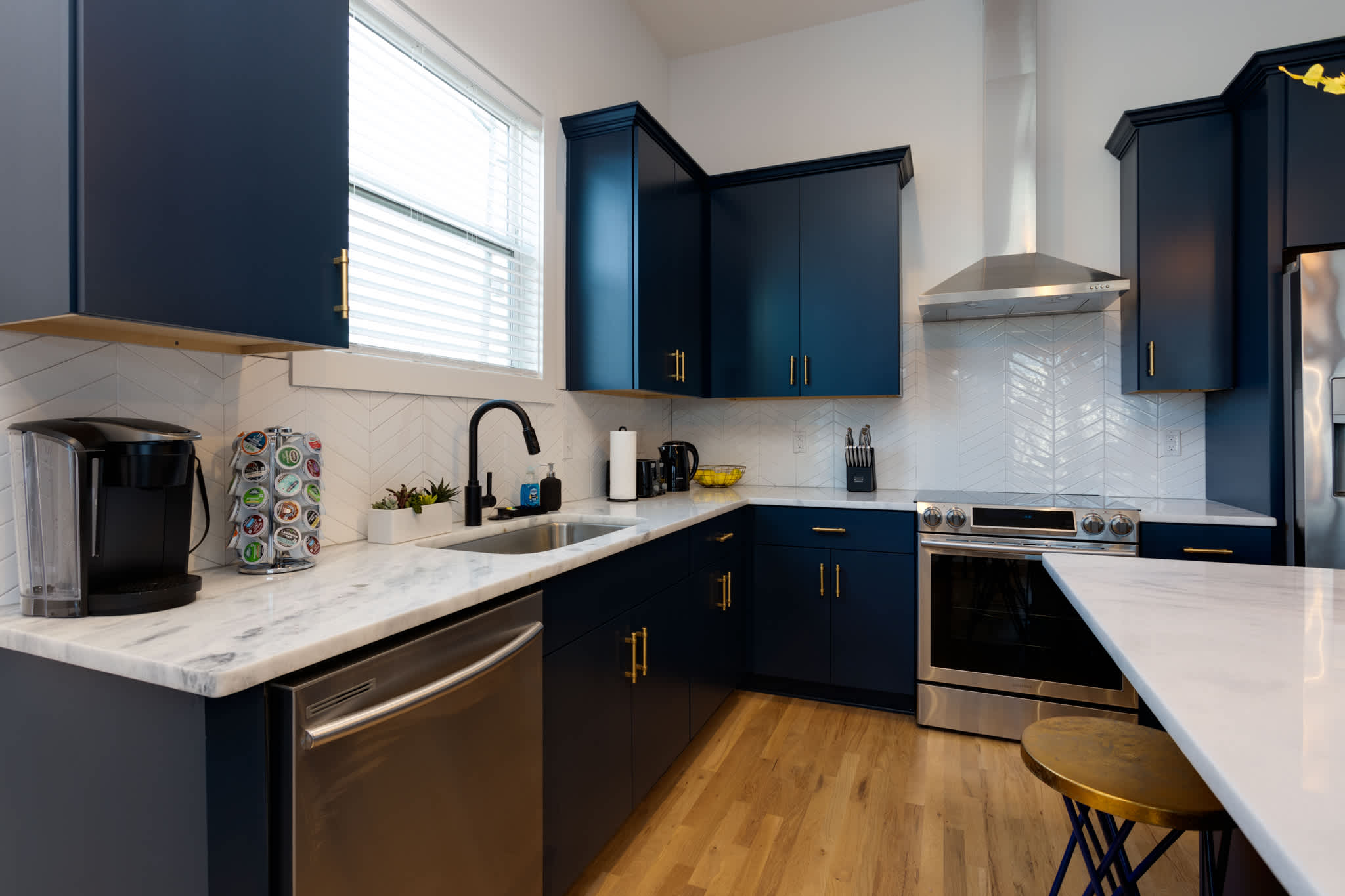 This thoughtfully designed townhome offers the ideal blend of comfort and convenience. Unwind in the bright and cozy living area with a large smart TV, or cook a group meal in the full kitchen with modern appliances and island seating. With four dedicated bedrooms plus a bonus area, there's room for everyone to spread out. The top-floor balcony is perfect for evening drinks, while the wet bar and mini-fridge upstairs add extra hosting convenience. Great for groups, families, or business travelers alike.
