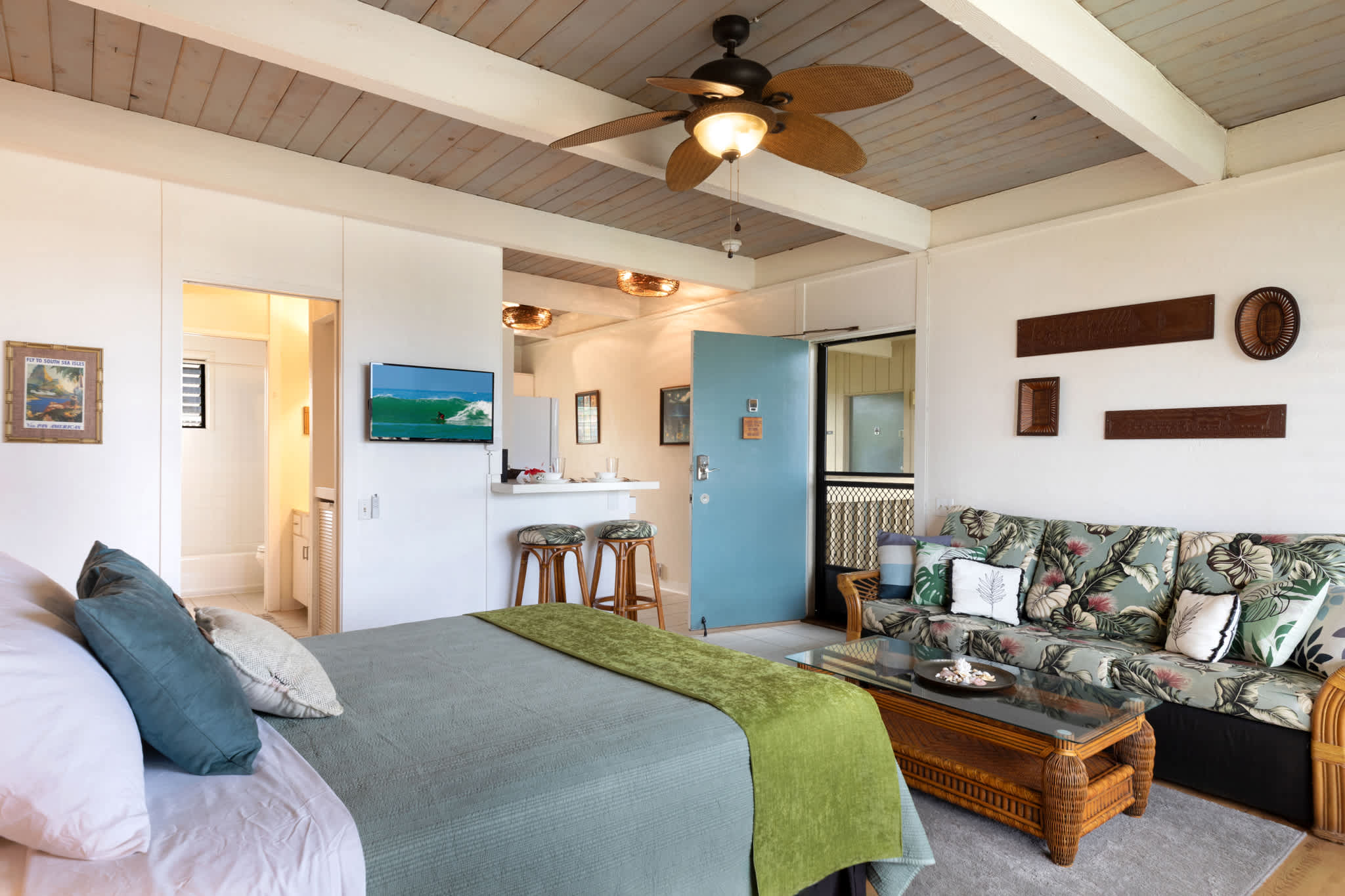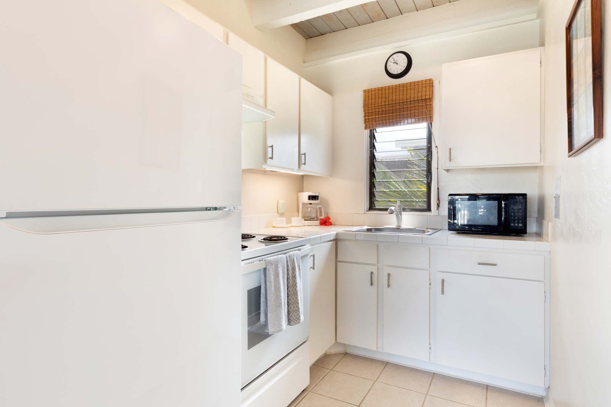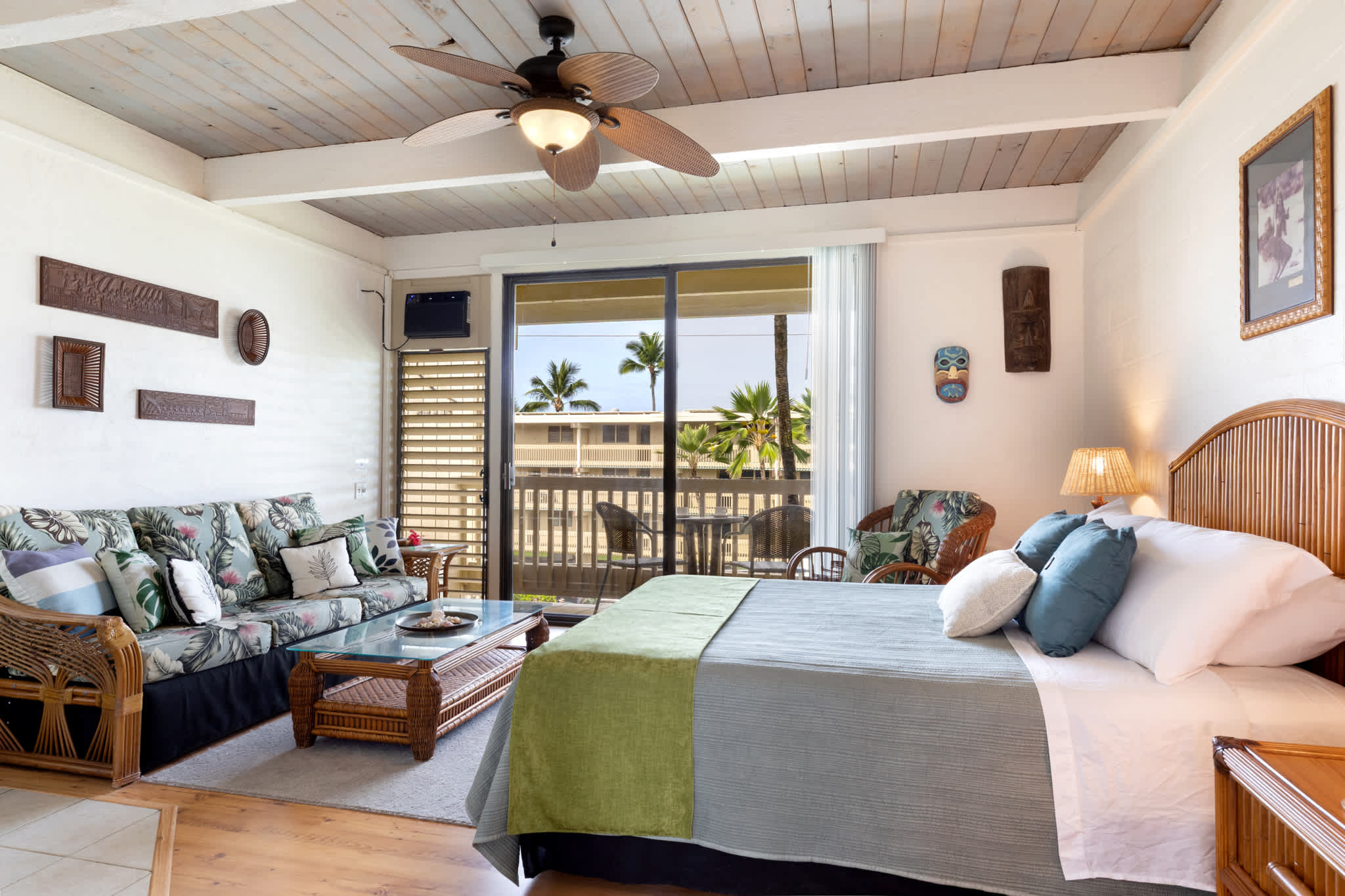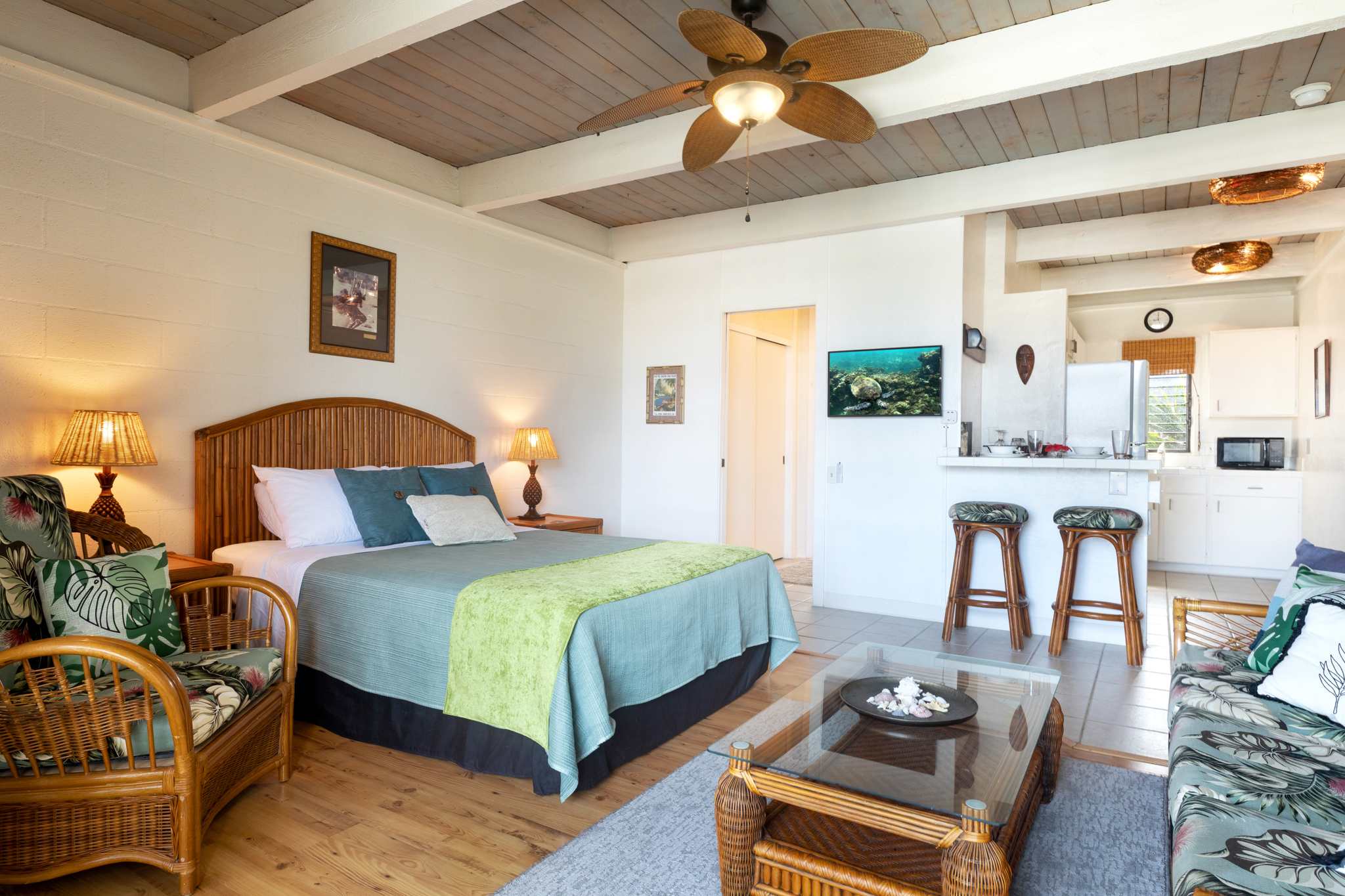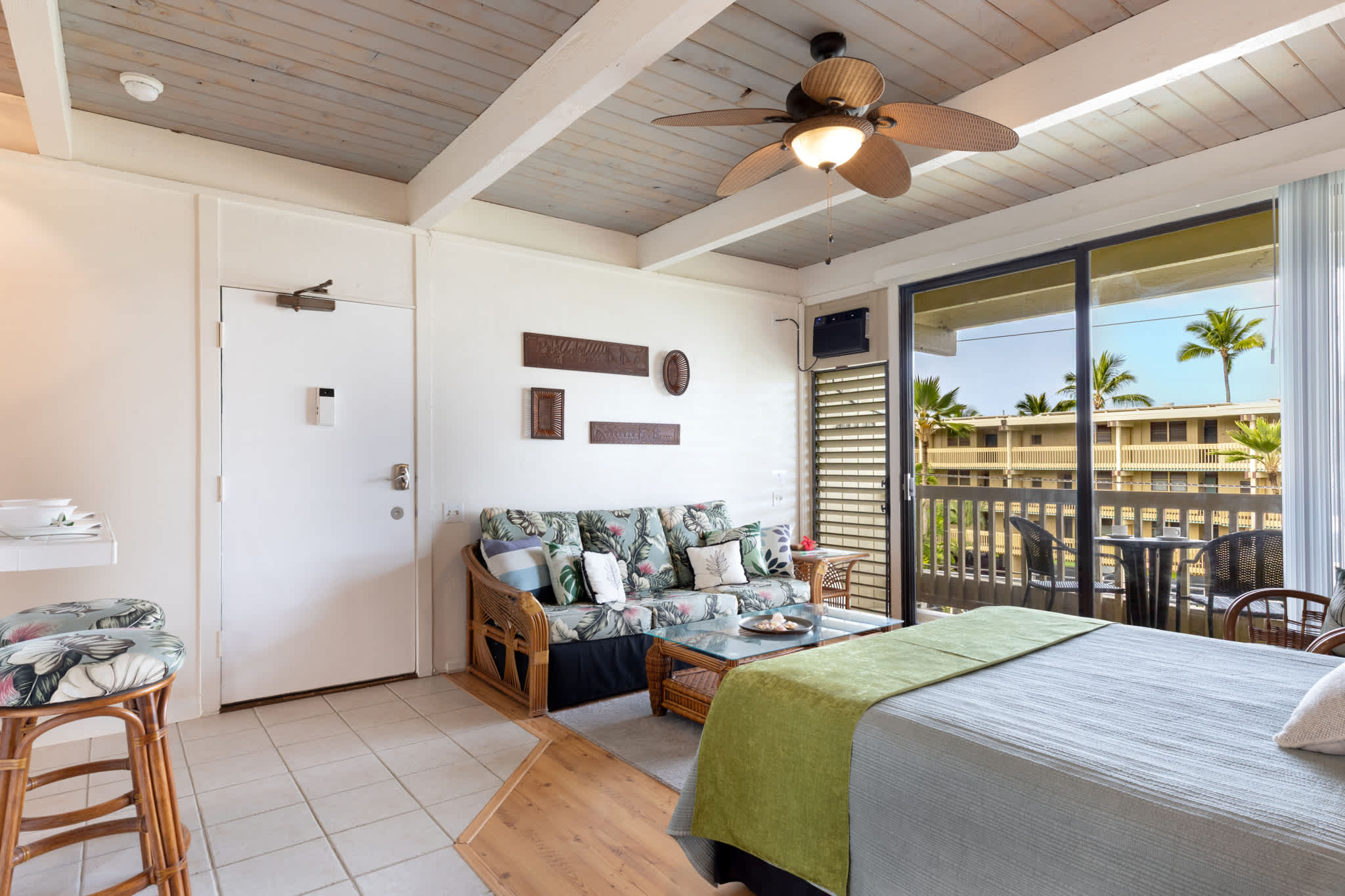 Step inside this breezy studio unit and feel instantly at ease. The cozy living area features a smart TV and plush couch, ideal for laid-back evenings after a day of exploring. The compact kitchen is thoughtfully stocked with essentials—drip coffee maker, stove, microwave, and more—perfect for prepping a beachside breakfast or simple island dinner. The counter seating for two doubles as your morning coffee spot or an evening snack bar. Or step out onto the private balcony, where a bistro table for two invites you to sip, snack, and savor the tropical breeze with indirect ocean views in the background.