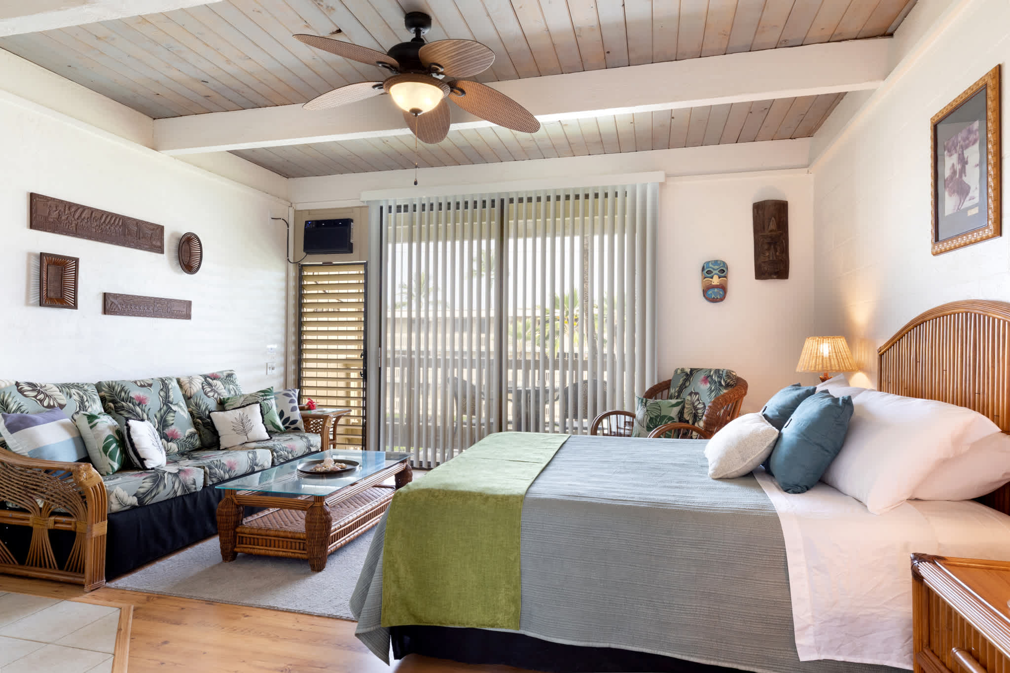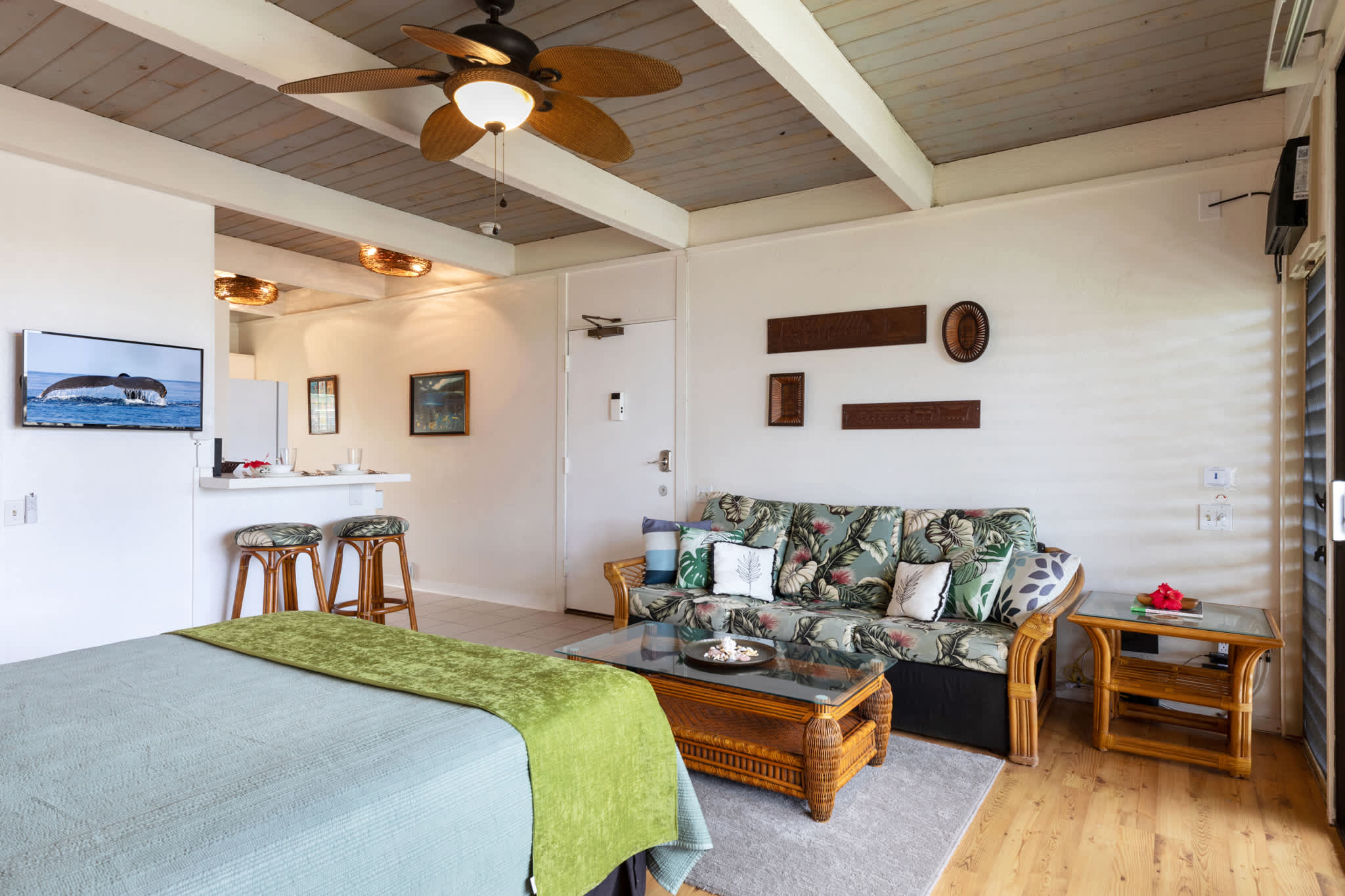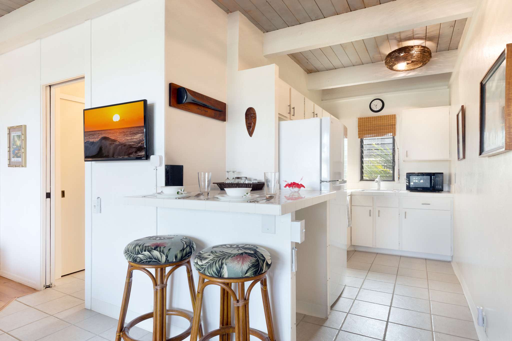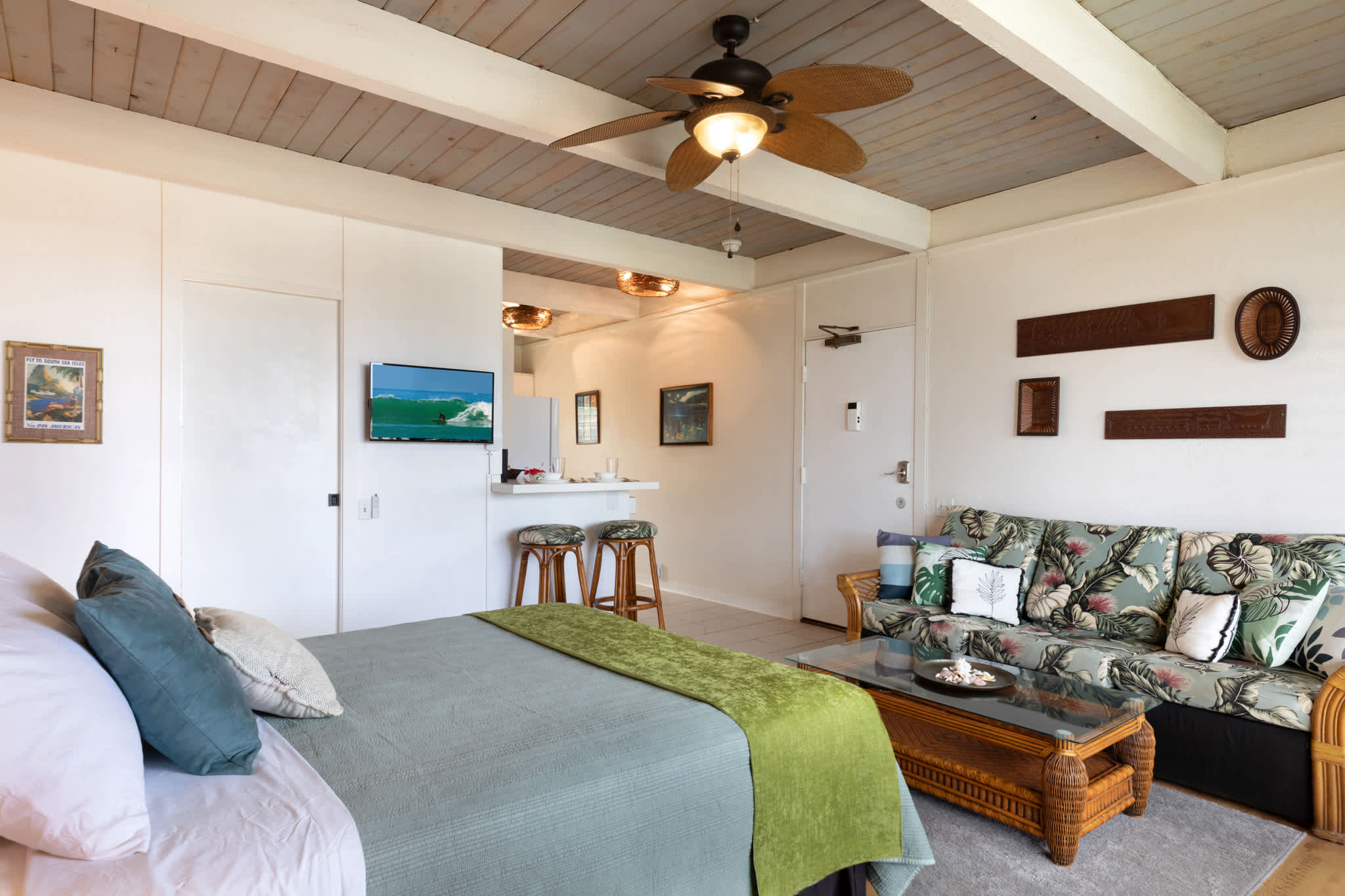 Step inside this breezy studio unit and feel instantly at ease. The cozy living area features a smart TV and plush couch, ideal for laid-back evenings after a day of exploring. The compact kitchen is thoughtfully stocked with essentials—drip coffee maker, stove, microwave, and more—perfect for prepping a beachside breakfast or simple island dinner. The counter seating for two doubles as your morning coffee spot or an evening snack bar. Or step out onto the private balcony, where a bistro table for two invites you to sip, snack, and savor the tropical breeze with indirect ocean views in the background.