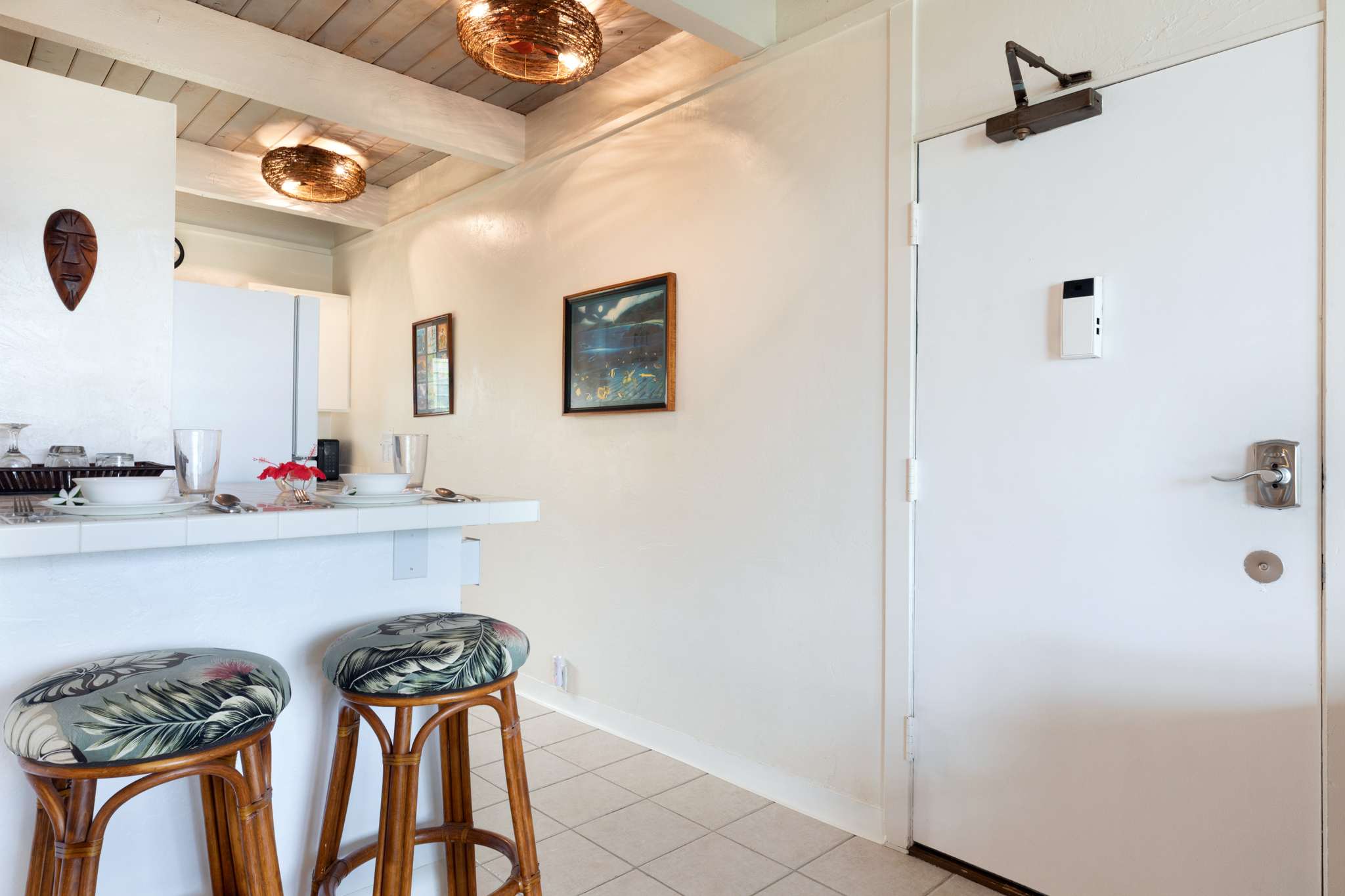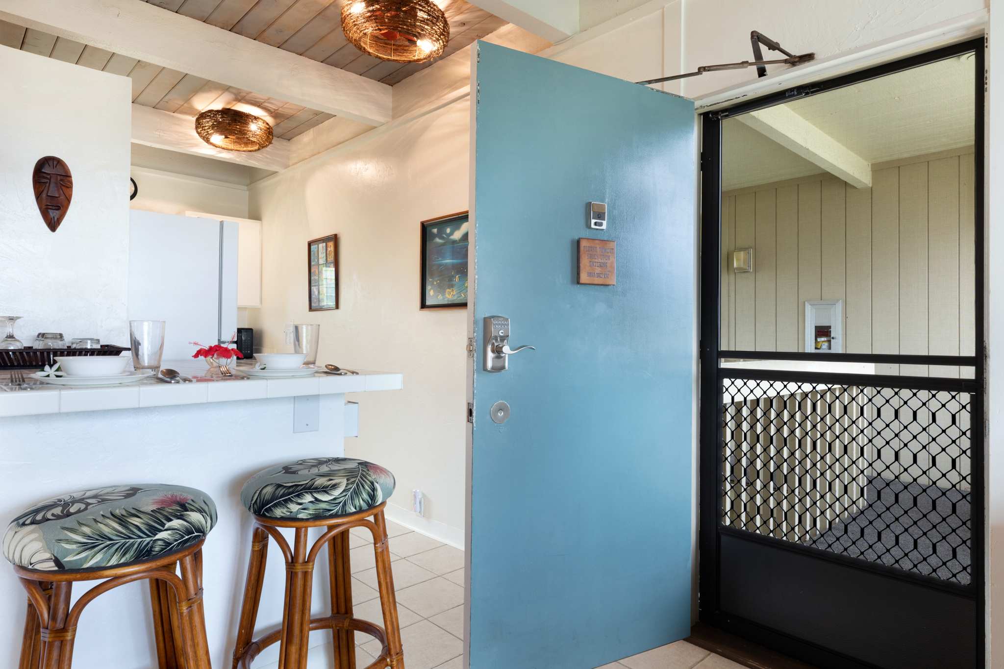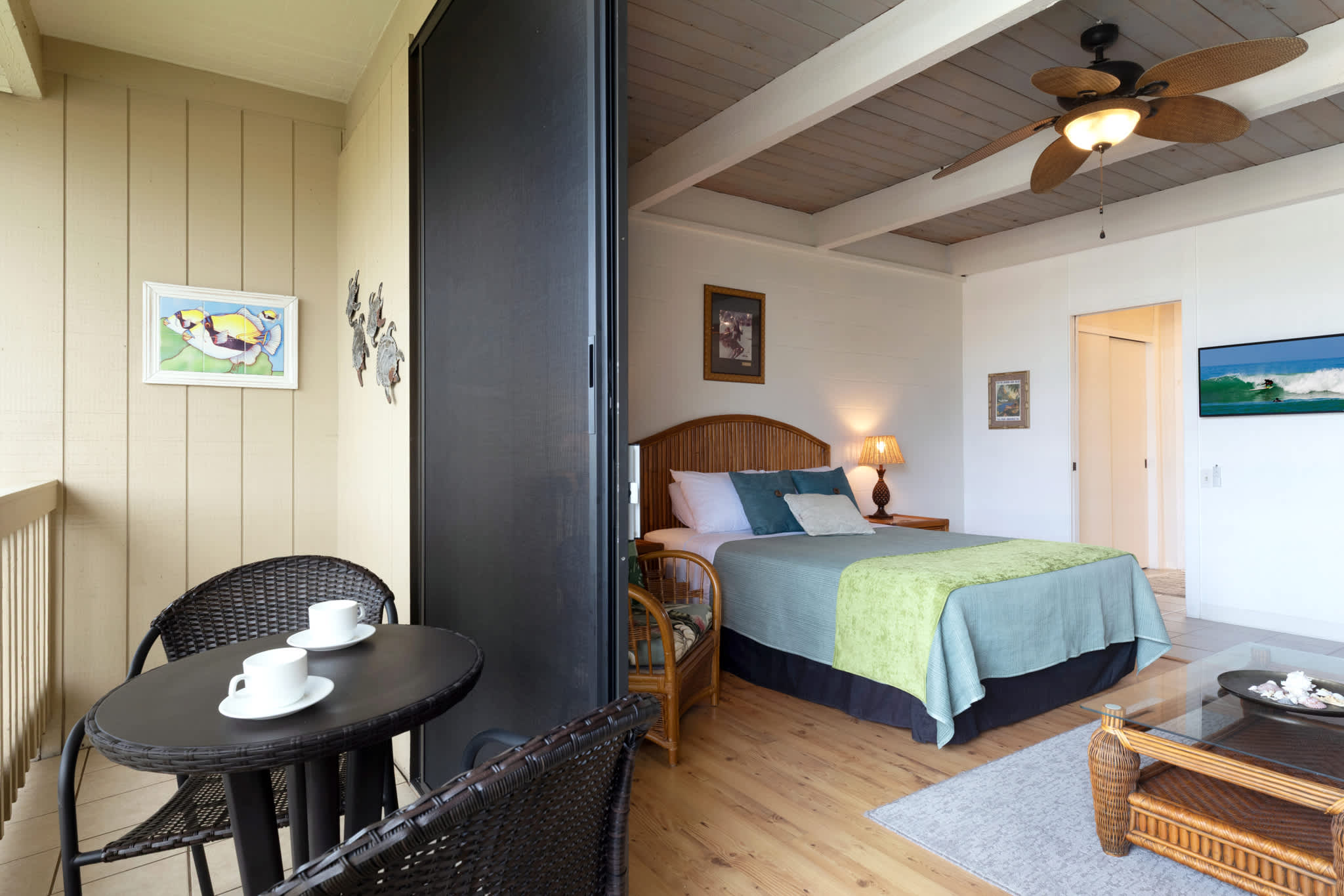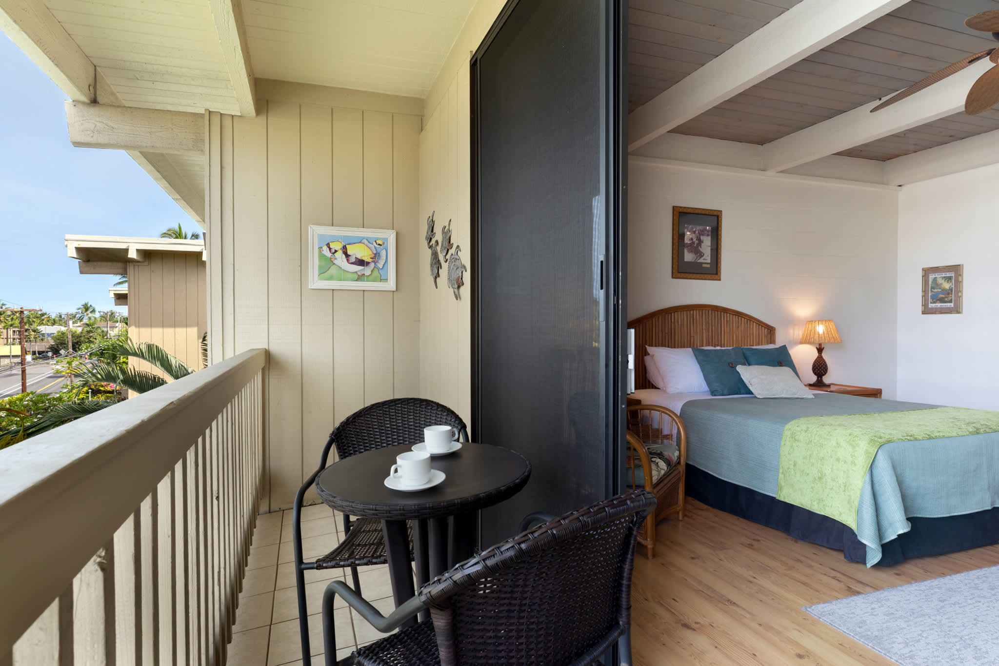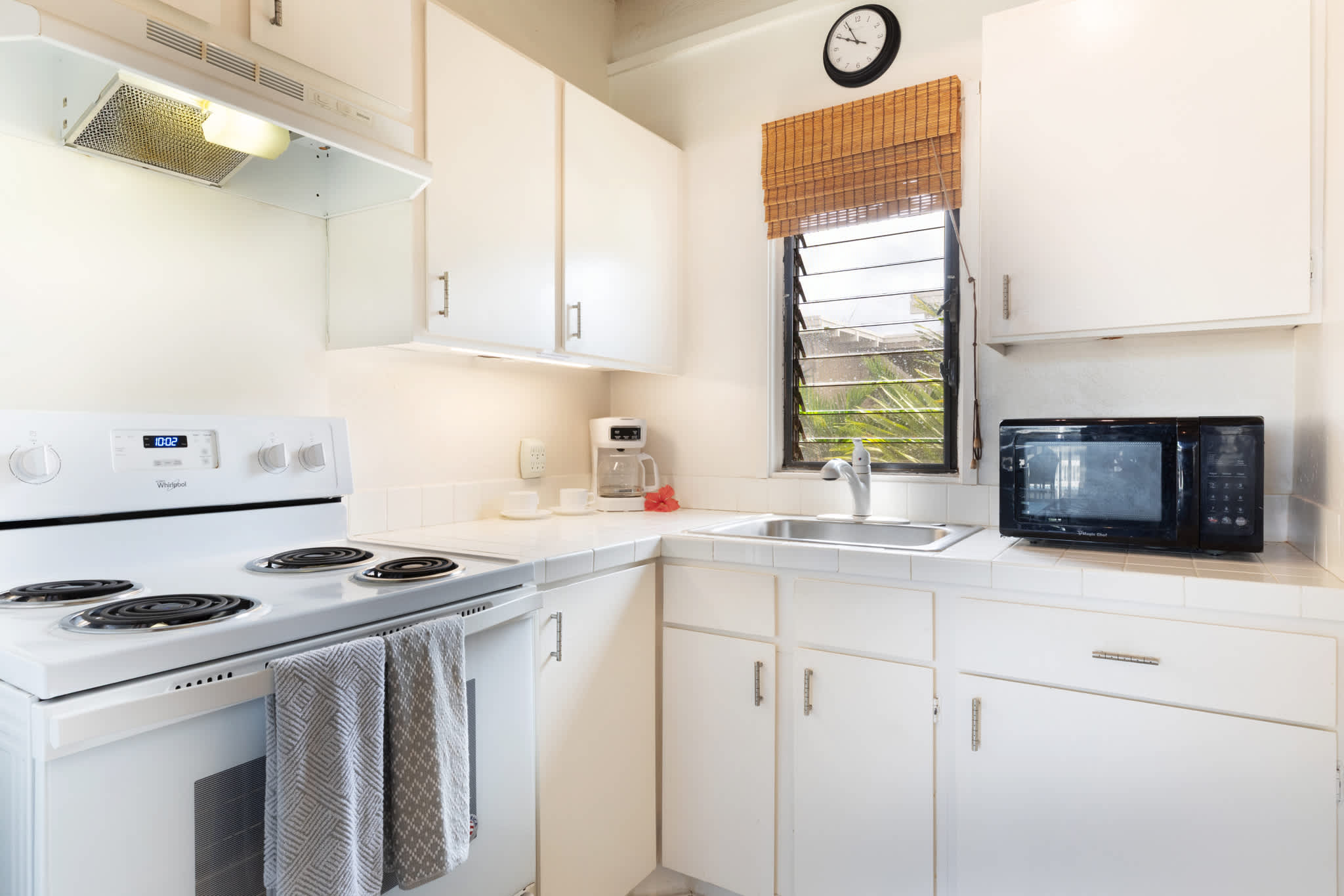 Step inside this breezy studio unit and feel instantly at ease. The cozy living area features a smart TV and plush couch, ideal for laid-back evenings after a day of exploring. The compact kitchen is thoughtfully stocked with essentials—drip coffee maker, stove, microwave, and more—perfect for prepping a beachside breakfast or simple island dinner. The counter seating for two doubles as your morning coffee spot or an evening snack bar. Or step out onto the private balcony, where a bistro table for two invites you to sip, snack, and savor the tropical breeze with indirect ocean views in the background.