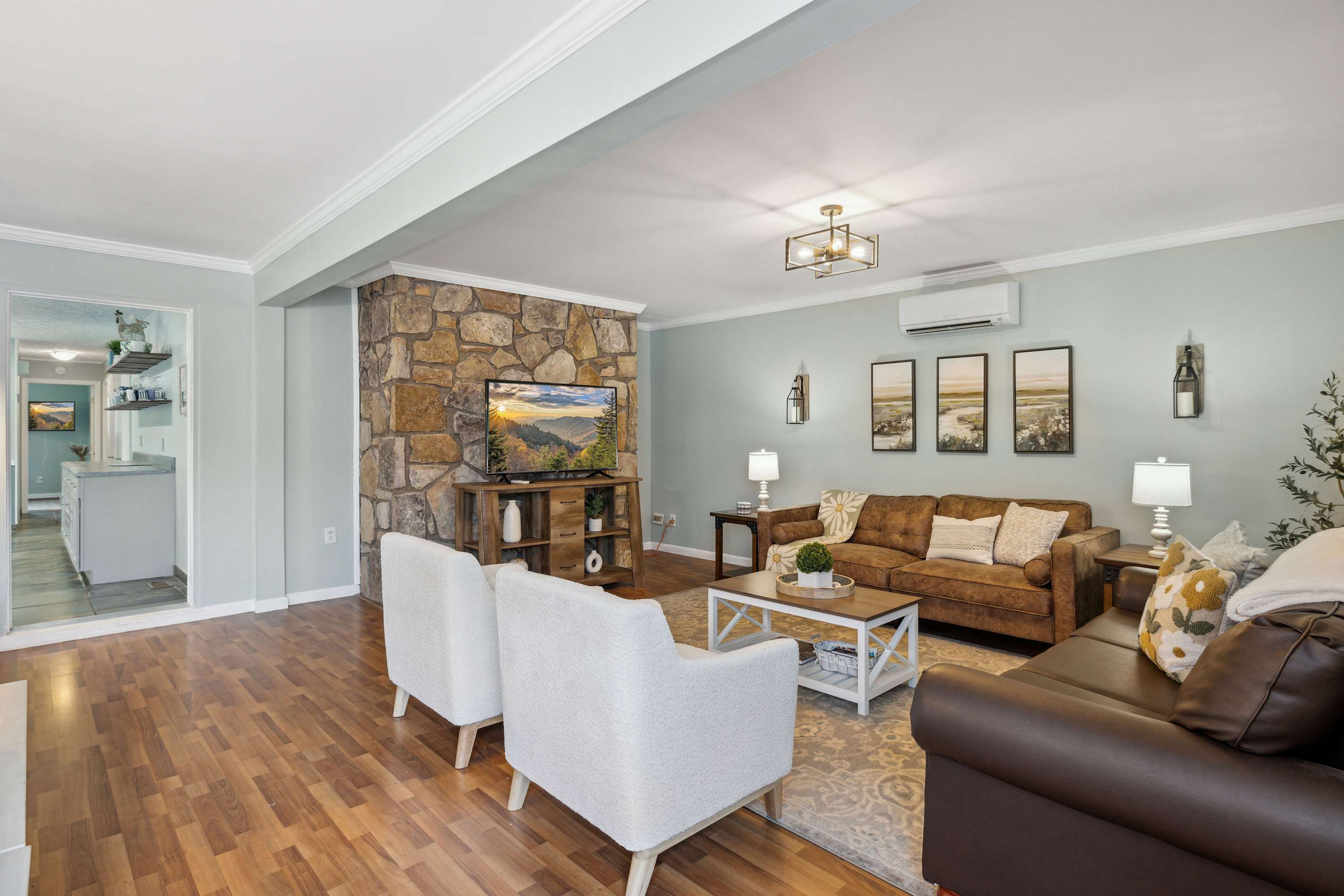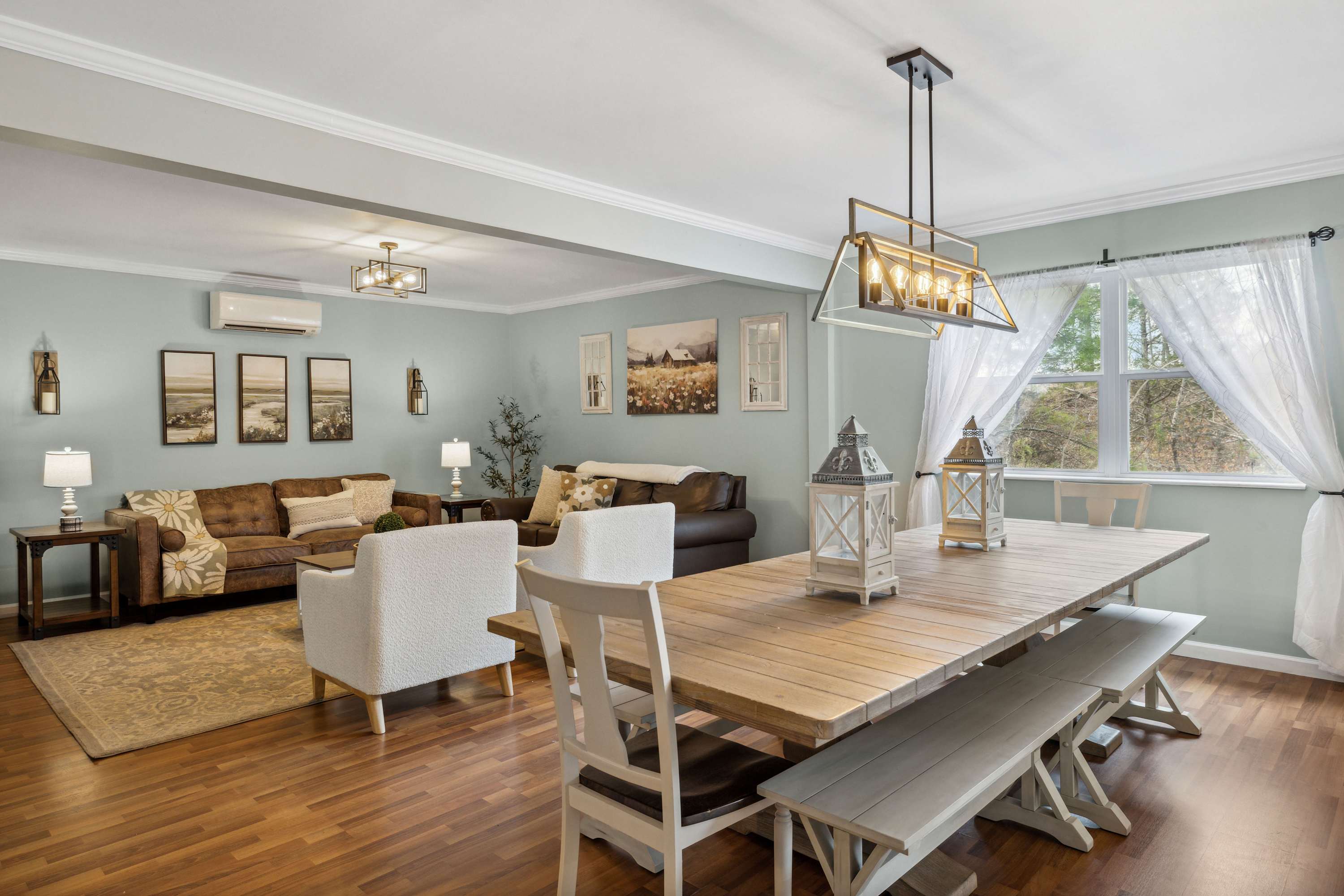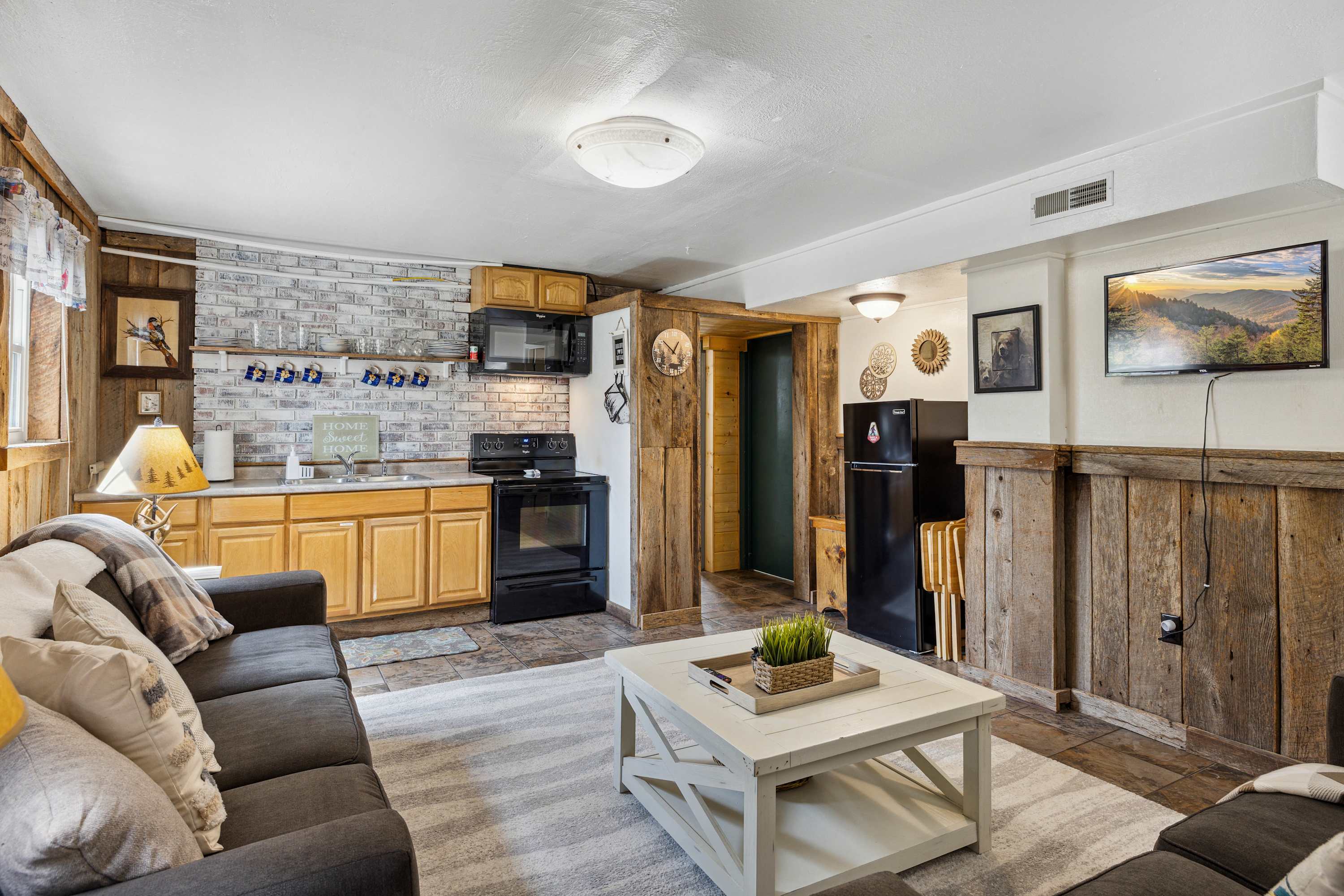 Inside, you'll find two spacious living rooms, each with plush seating, smart TVs, and full-size sofa beds—ideal for movie nights or winding down after a day of exploring. The main unit features an open-concept layout with a dedicated dining area that seats eight, perfect for group meals or game nights. Both kitchens are stocked with all the essentials, including Keurig machines, cookware, and full-size appliances. Whether you're prepping breakfast or a holiday feast, you'll have everything you need.