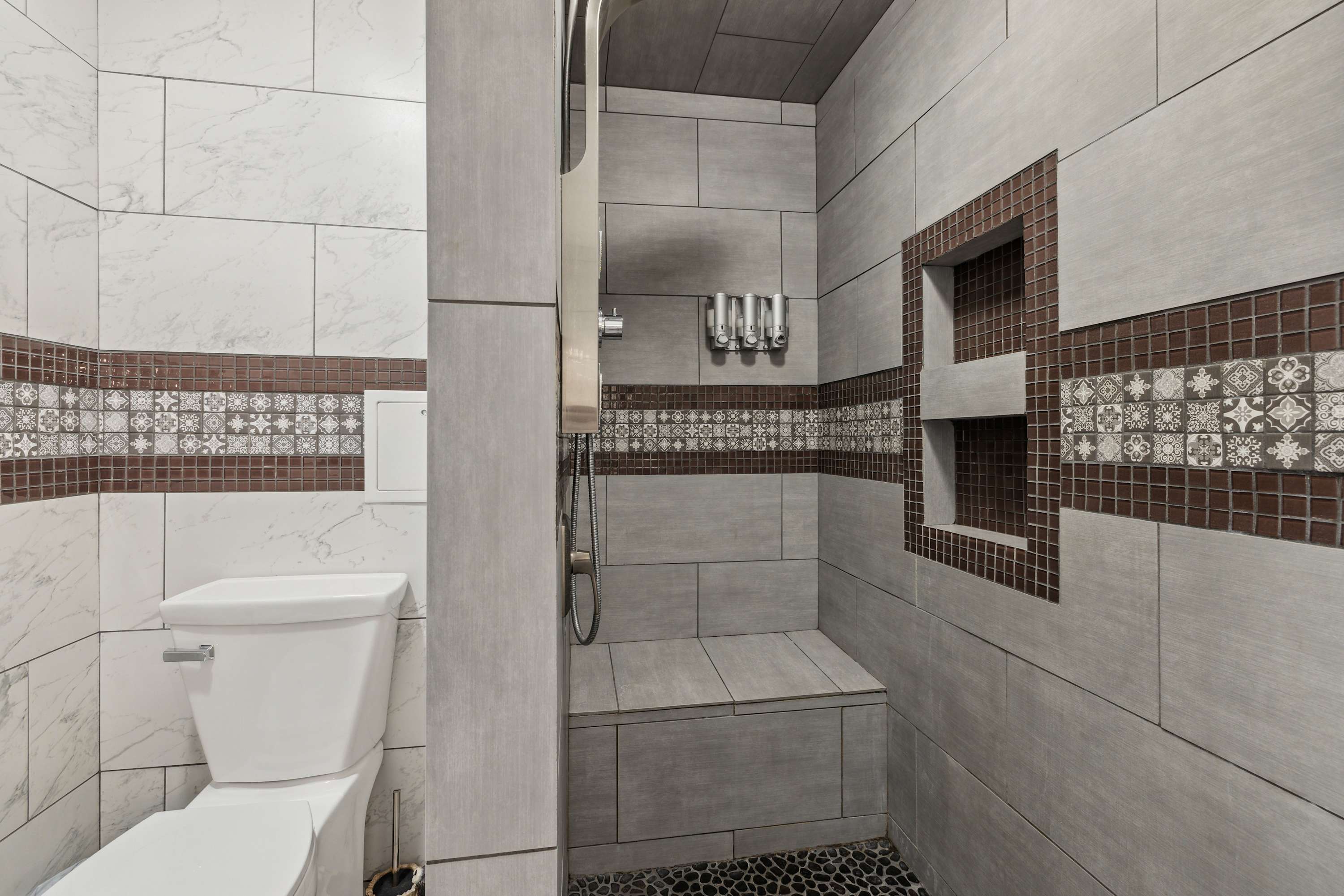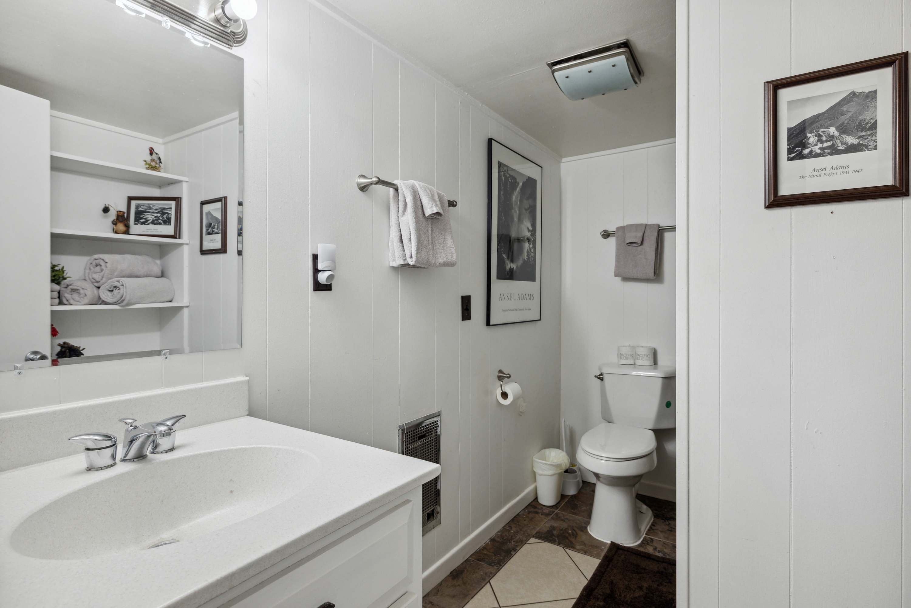 The home also includes an additional full guest bathroom with a single vanity and standing shower.