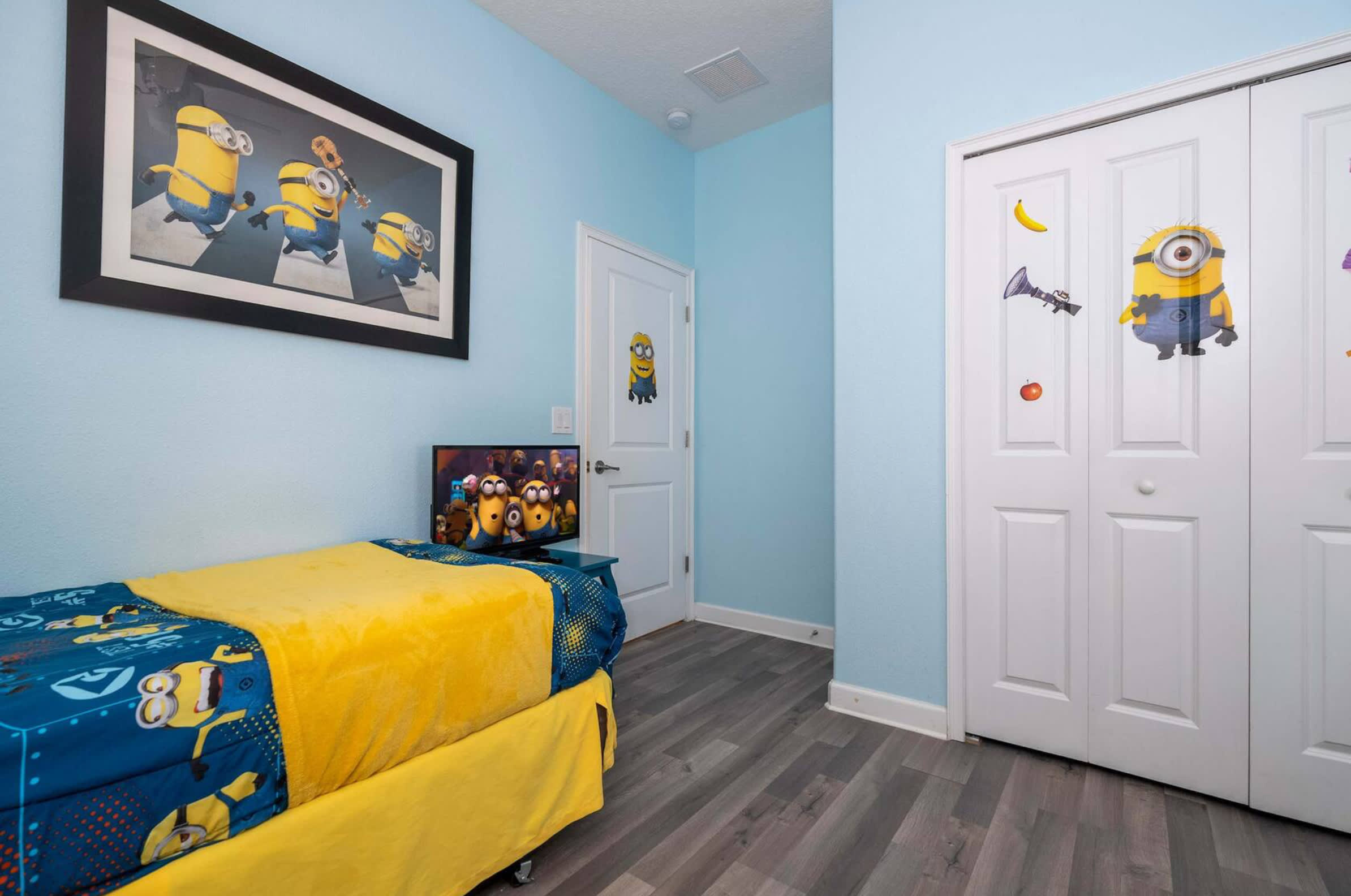 Bedroom #1 is Minions-themed and includes 2 twin size beds and a smart TV.