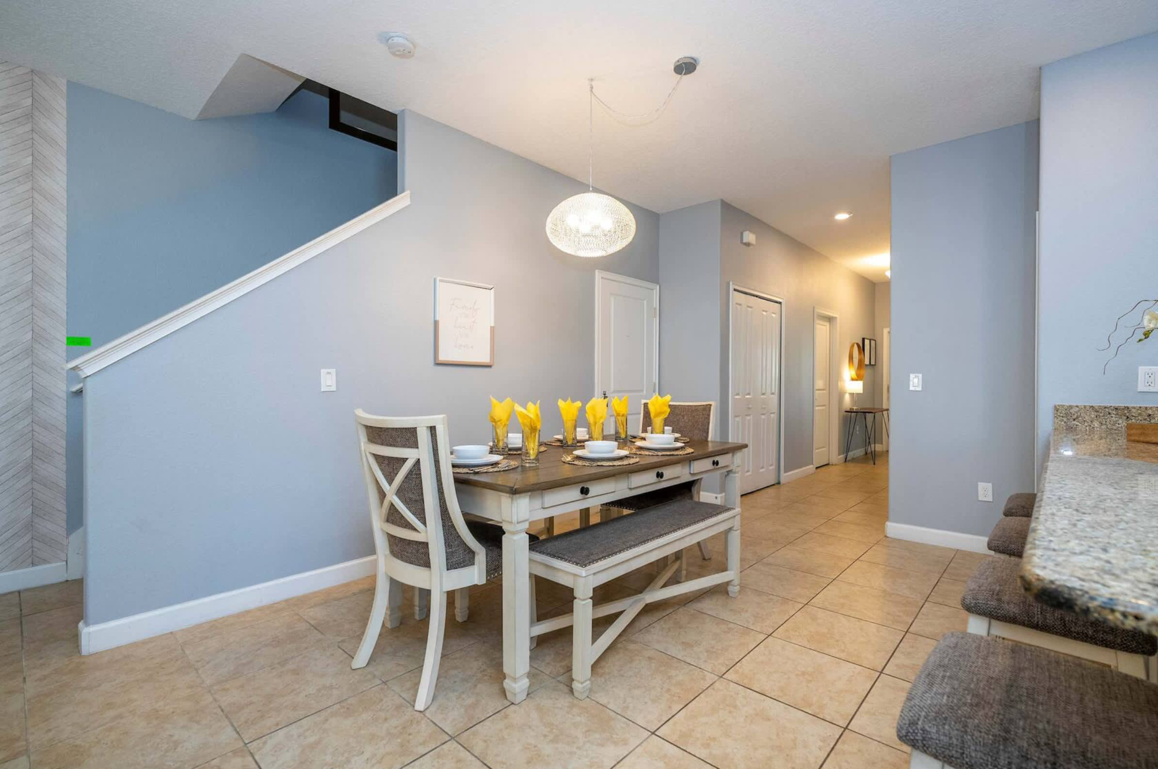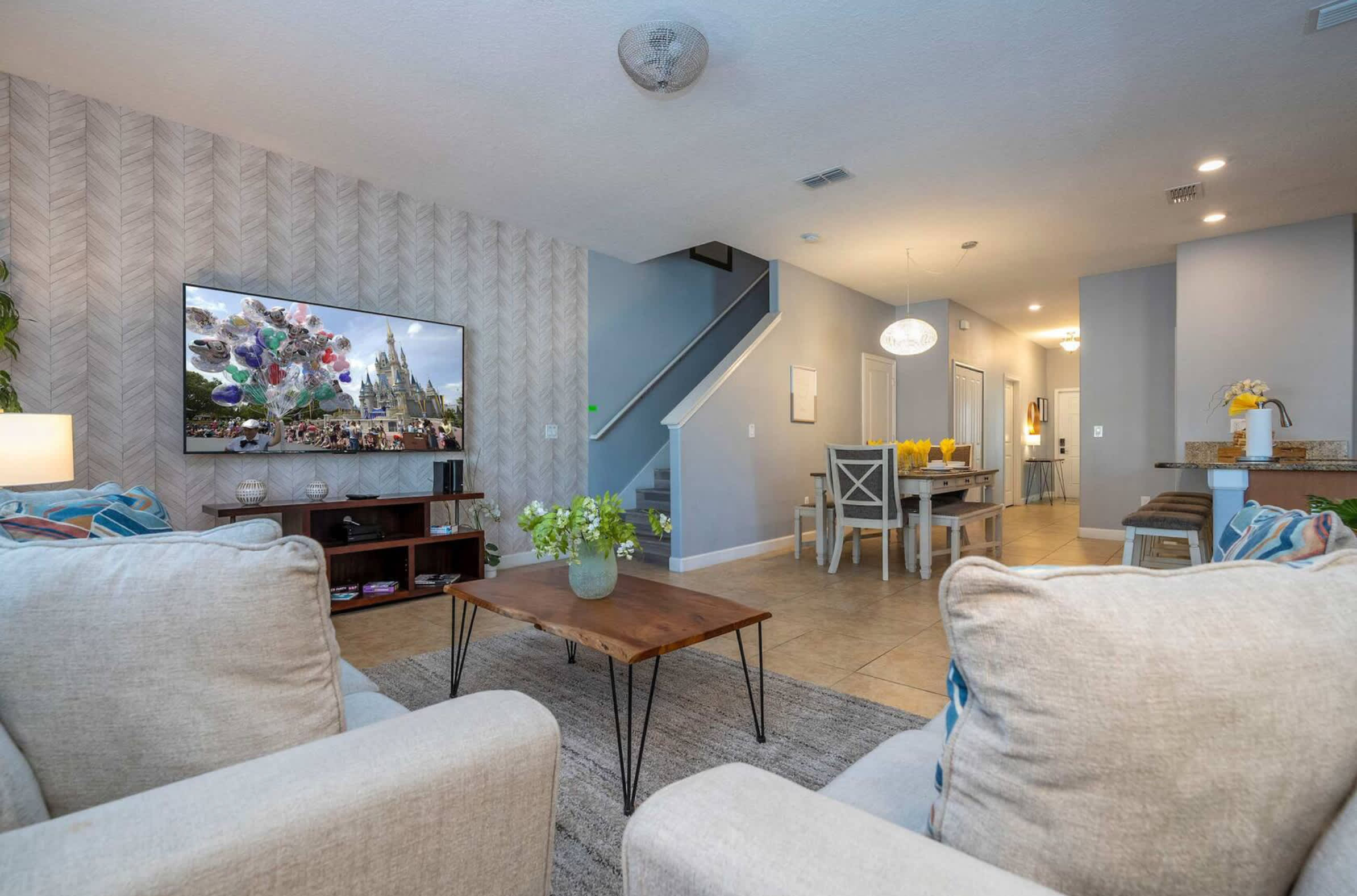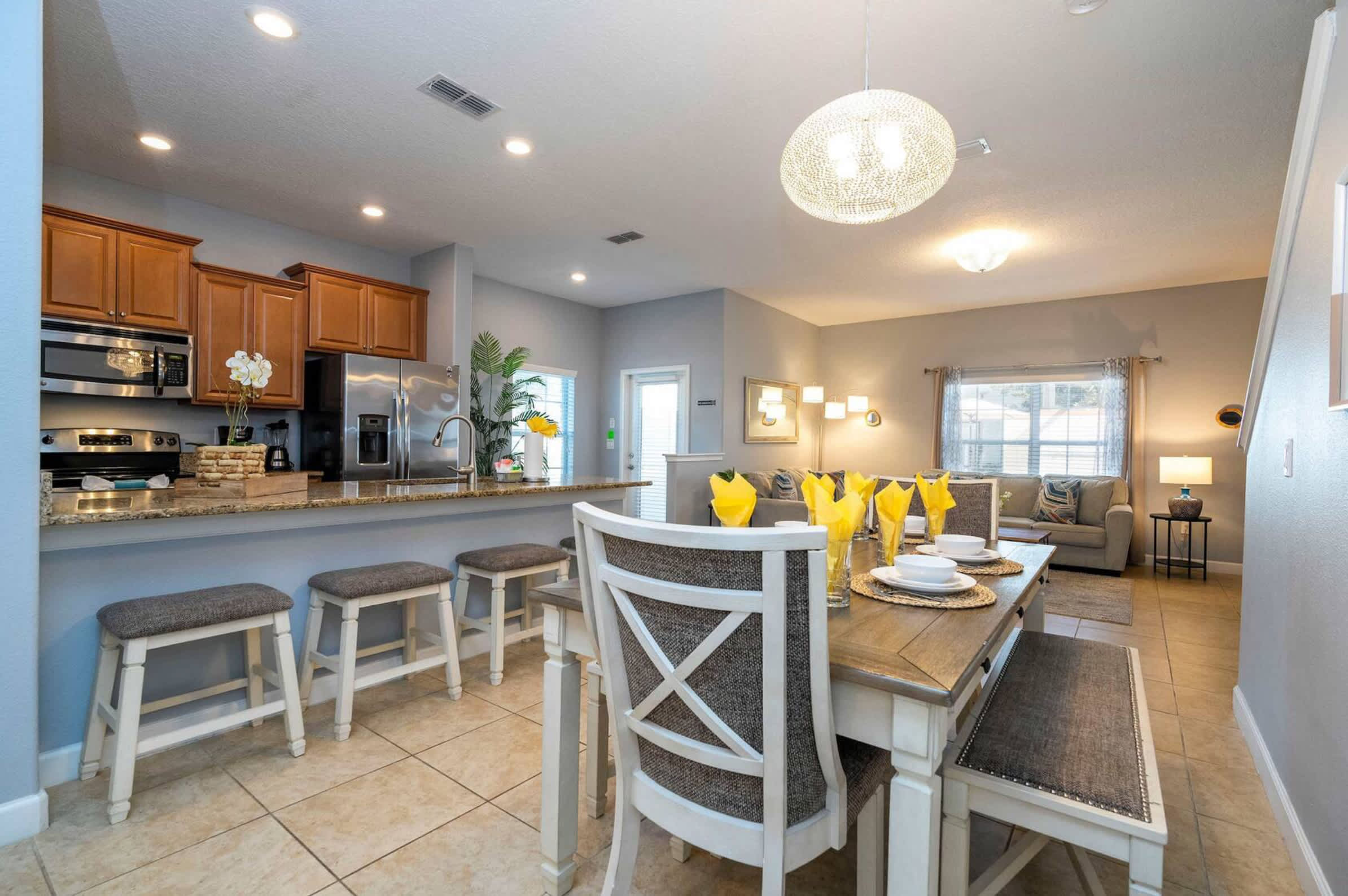Step inside Disney Days & Poolside Nights At Storey Lake and feel instantly at home. The living room welcomes you with a plush couch and loveseat, the perfect setup for movie nights with the cable and smart TV ready to stream your favorite shows. The kitchen and dining area share a bright, open space, where granite countertops, stainless steel appliances, and a large prep area make it easy to whip up family meals or poolside snacks. A side door leads directly from the kitchen to your private pool and lanai, blurring the lines between indoor and outdoor living.
