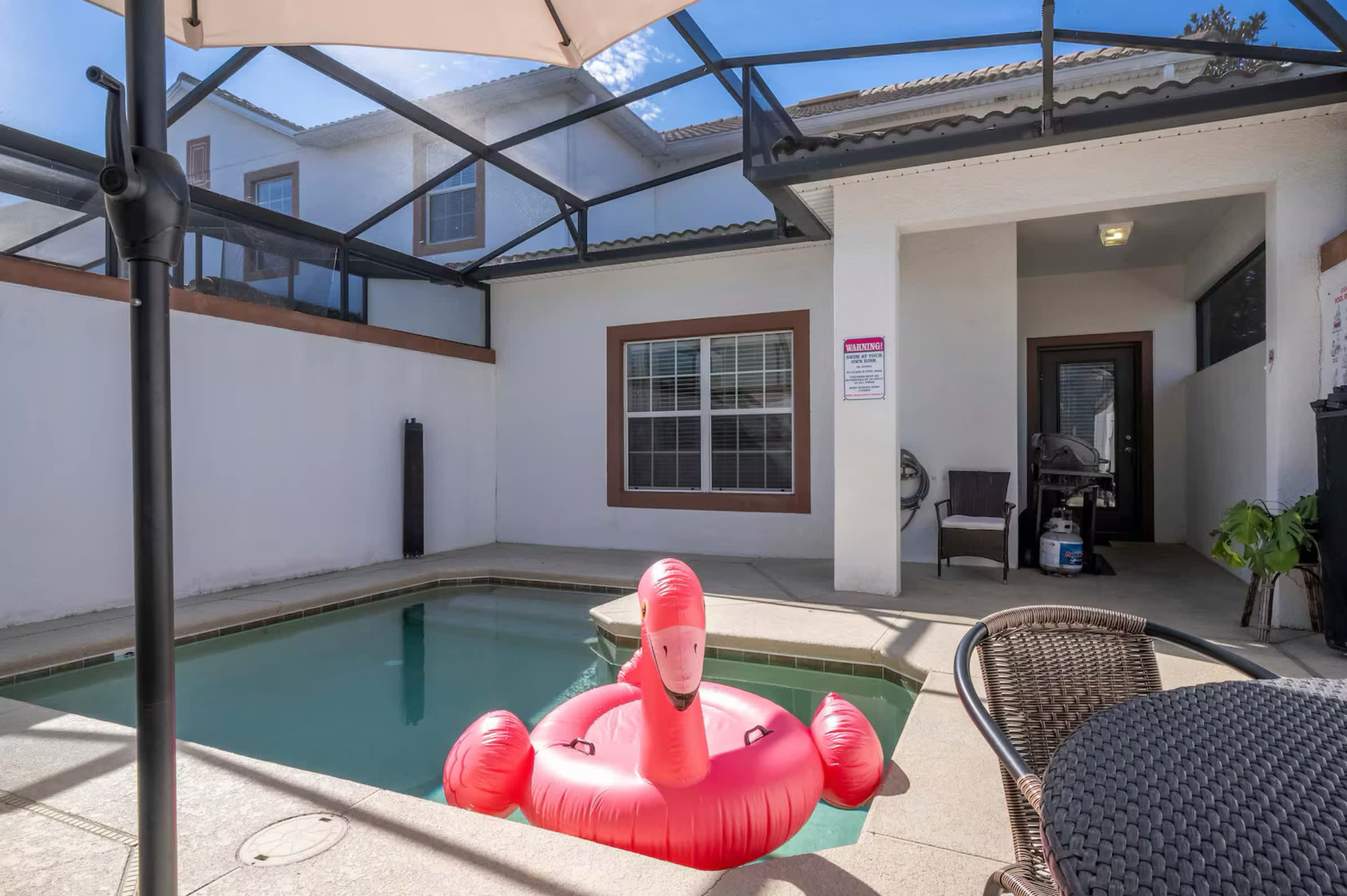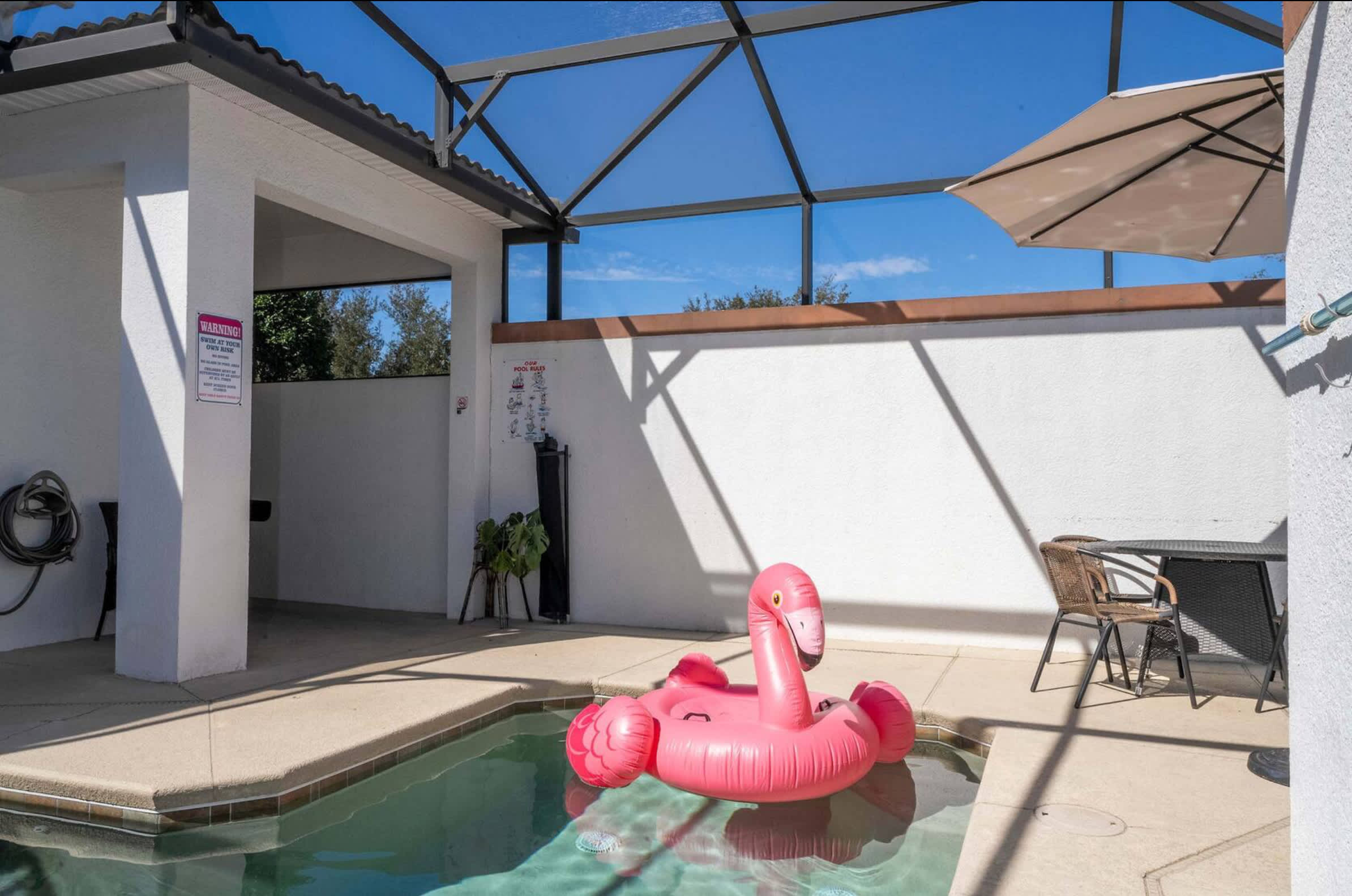 Slide open the door and step onto the shaded lanai, where a table for four sits beneath an overhang, perfect for morning coffee or evening drinks. Just beyond, your fully enclosed plunge pool offers total privacy thanks to surrounding walls—ideal for cooling off or unwinding after a day of fun. Two chaise loungers invite you to bask in the Florida sun, while the grassy area just behind the home gives little ones space to play. Whether you’re floating the lazy river, splashing in your private pool, or heading out to explore Walt Disney World, Universal Studios, or the nearby shopping outlets and restaurants, this home is more than a place to stay—it’s a vacation experience all its own.