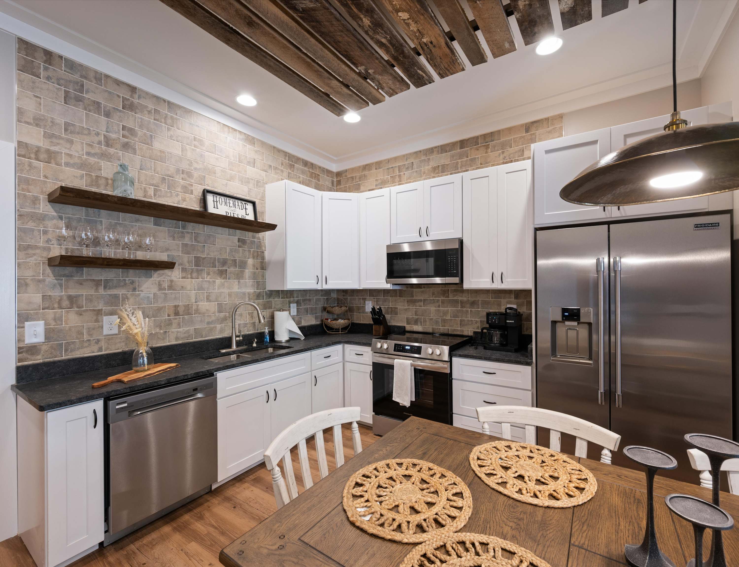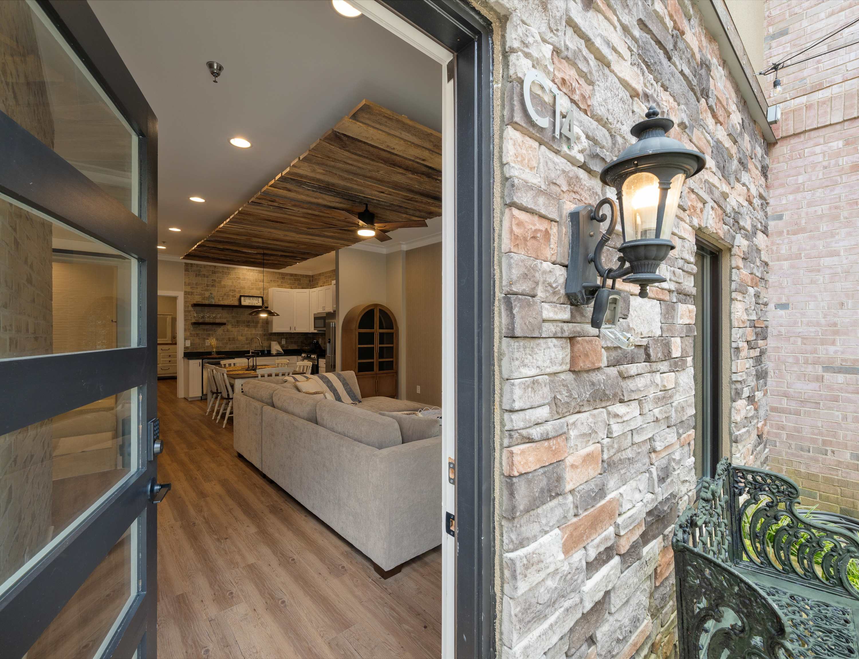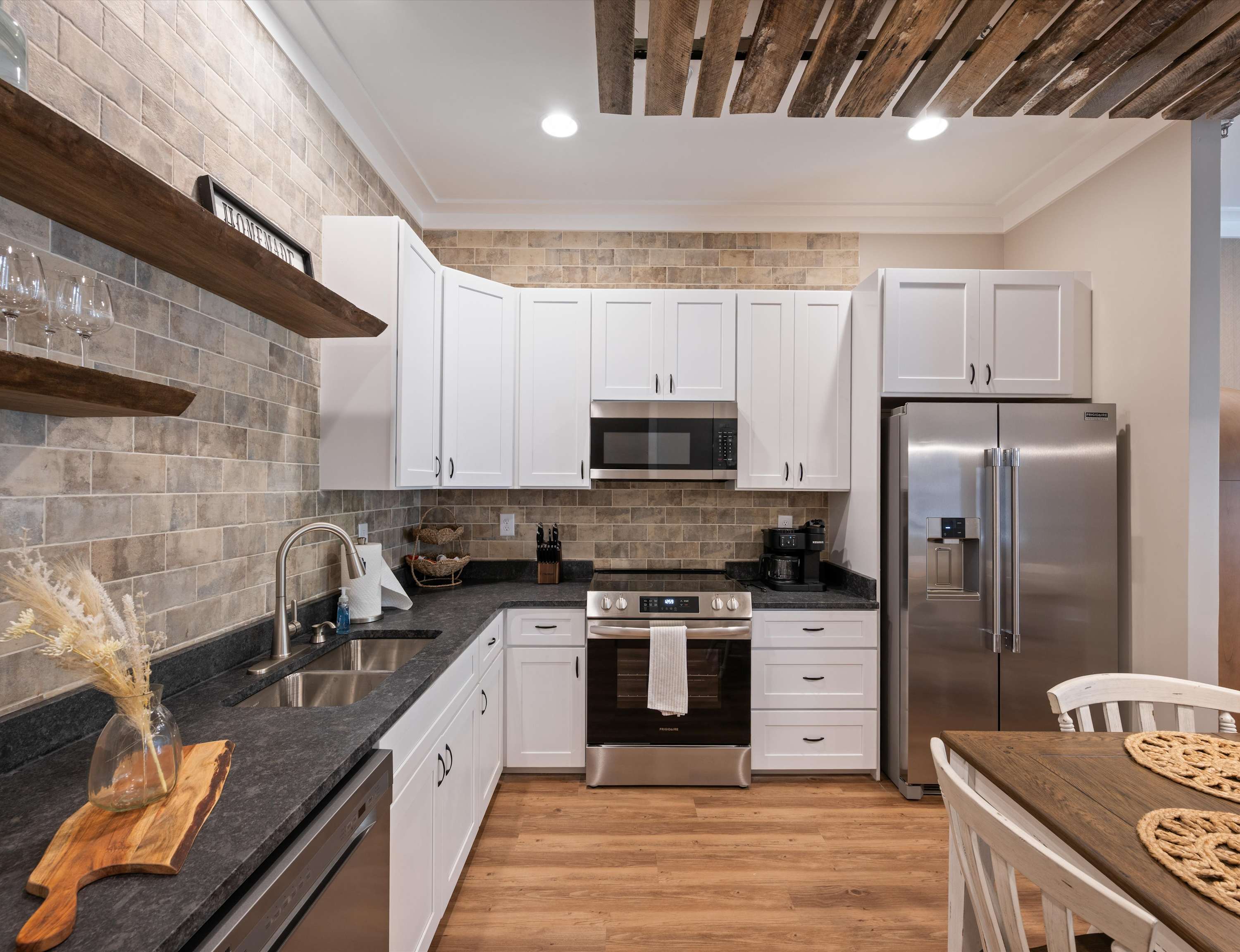 Step through the gate into a serene courtyard, where cozy seating invites you to sip morning coffee or unwind under the stars. Inside, the entire unit wraps you in warmth and comfort, offering a peaceful space to relax after a day of exploration. In the living room, a plush sofa and smart TV await cozy movie nights or quiet mornings with your favorite book. The eat-in kitchen is both stylish and functional, featuring dark countertops, warm white cabinetry, stainless steel appliances, and both single-serve and drip coffee makers to suit every preference. Gather around the dining table for six to enjoy home-cooked meals or takeout from Franklin’s fantastic eateries.