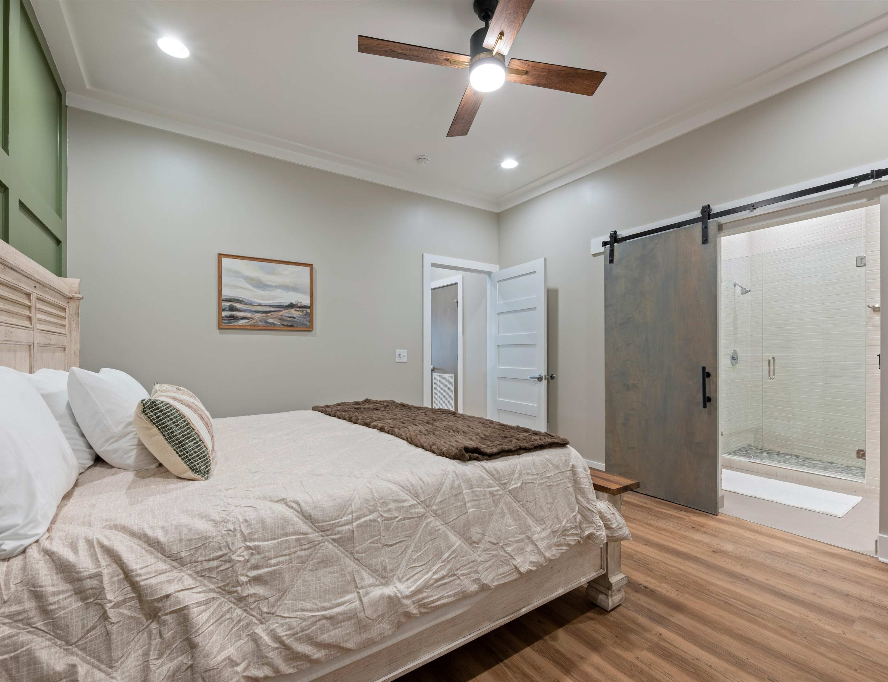 Bedroom #1 includes a king size bed and an ensuite bathroom with a single vanity and a walk-in shower.