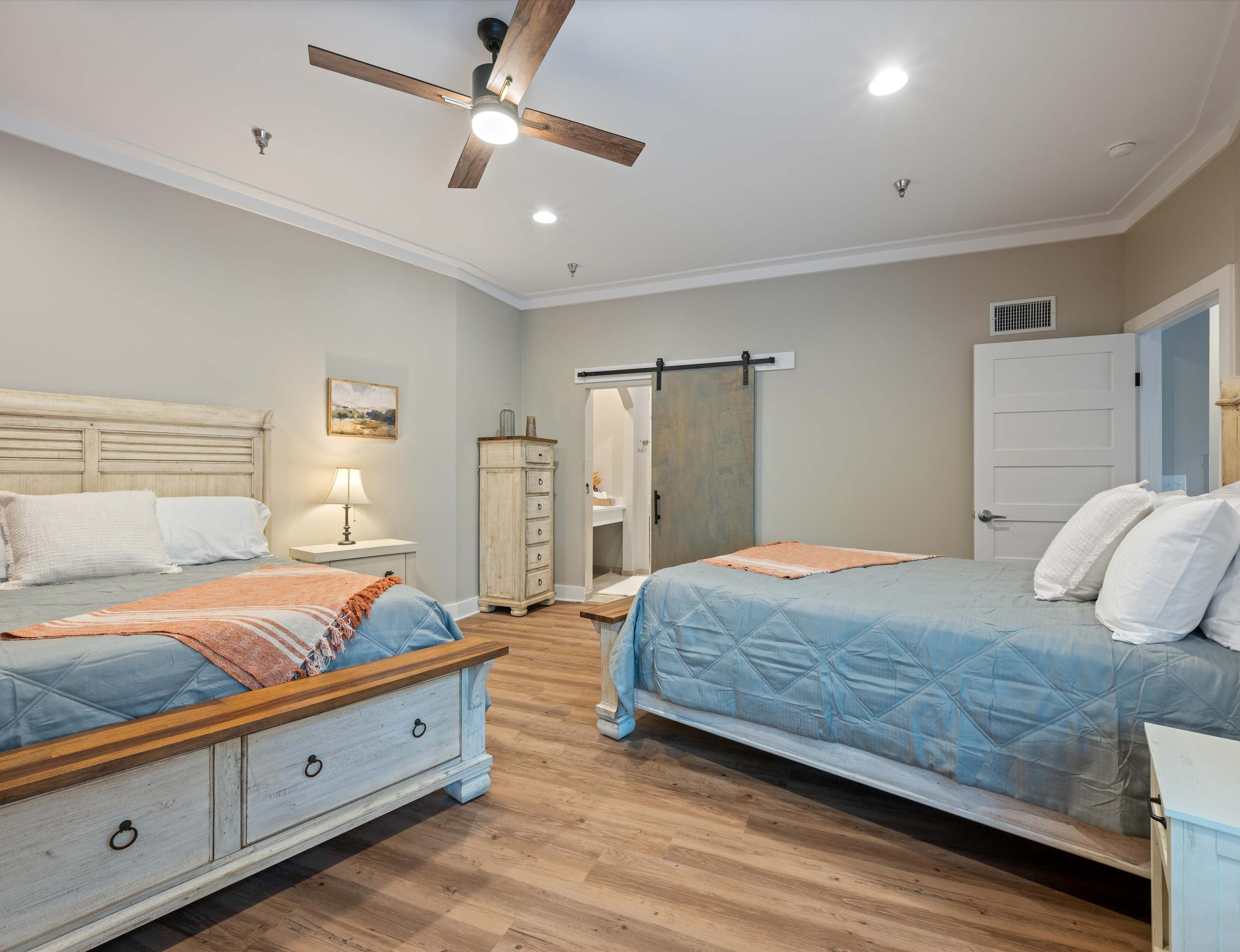 Bedroom #2 includes 2 queen size beds and an ensuite bathroom with a single vanity and a walk-in shower.