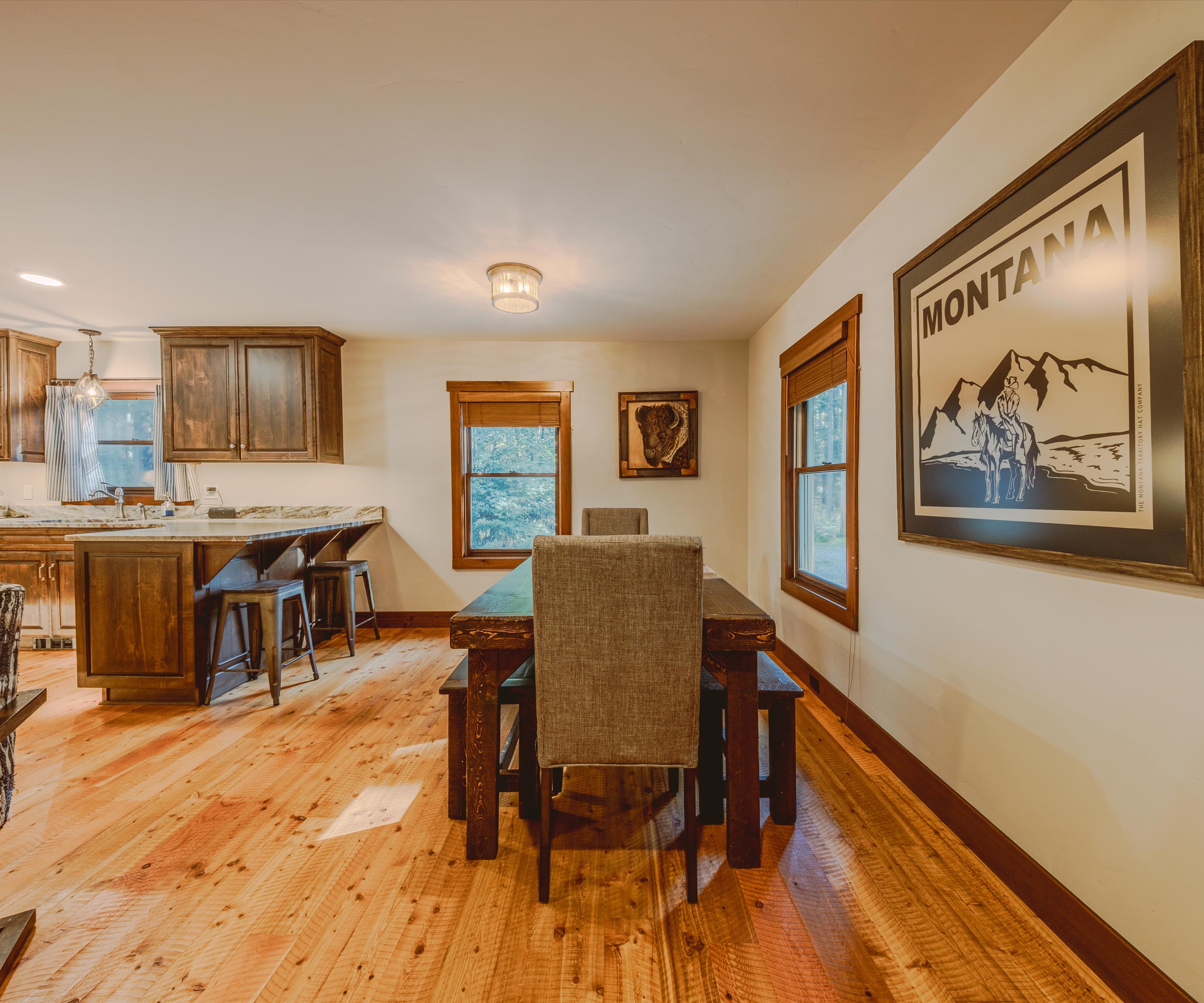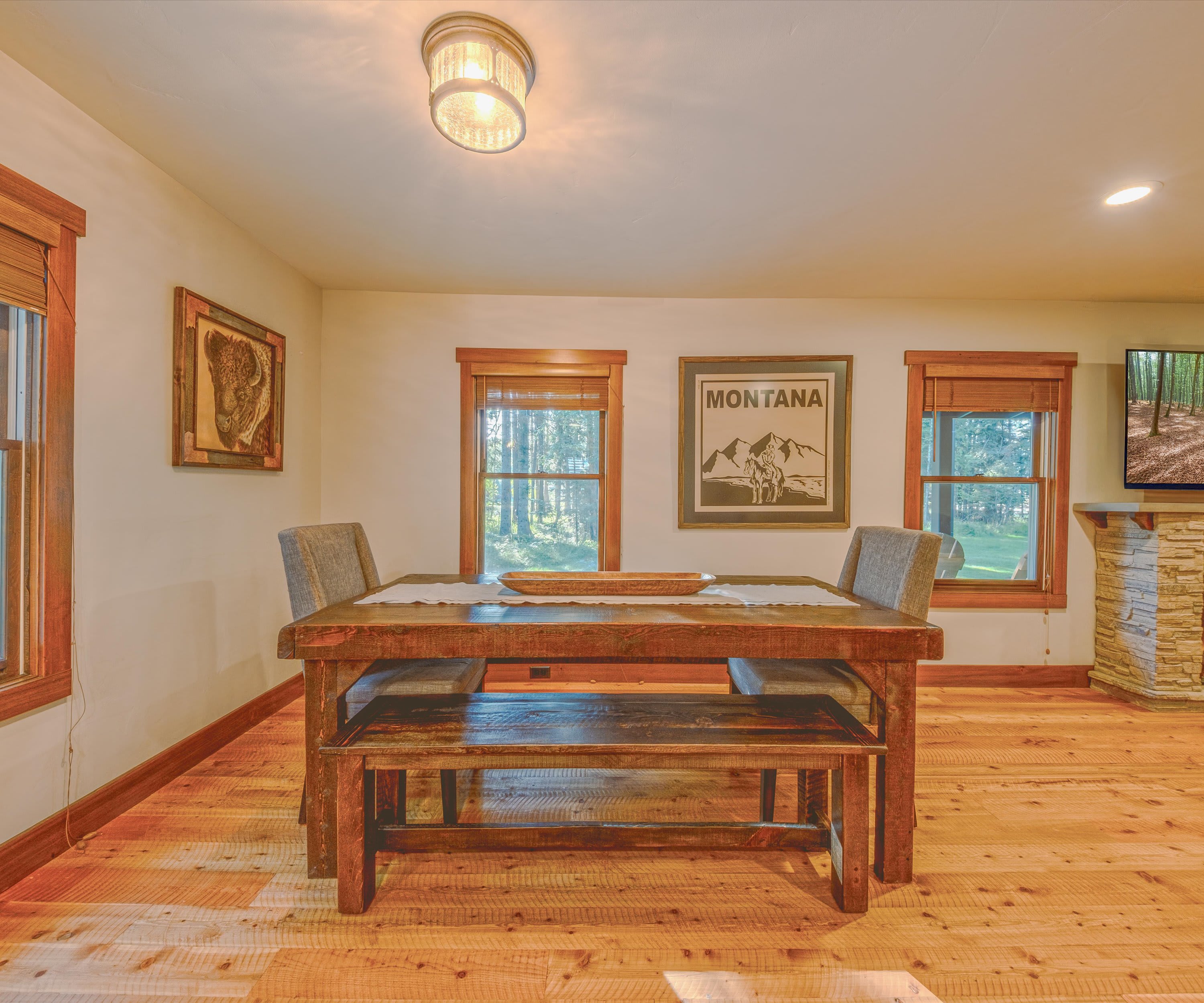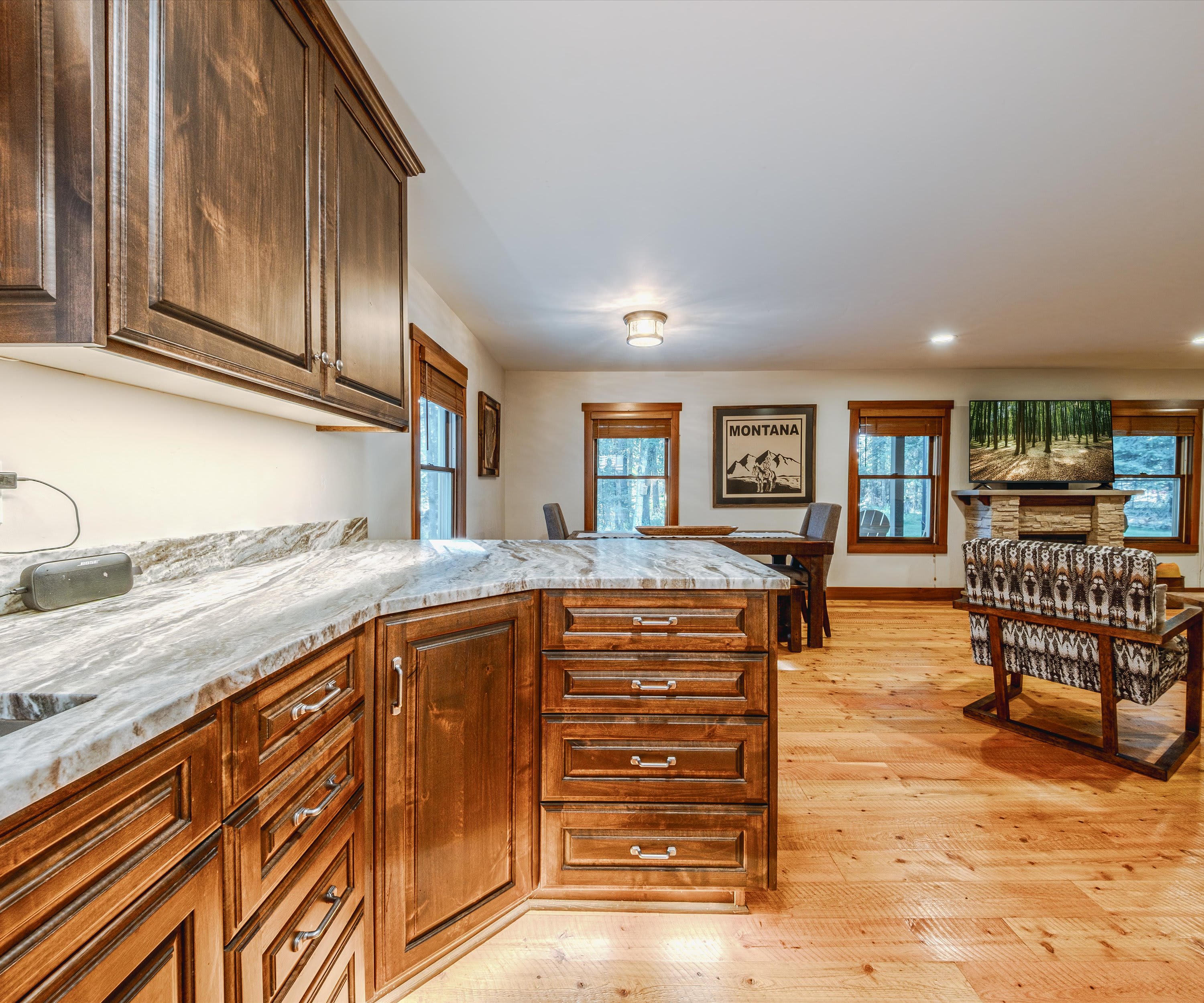 Step onto the covered front porch and settle into one of the cozy seats or gather around the picnic table for a casual meal in the fresh mountain air. Inside, the living room welcomes you with warmth and comfort—featuring a plush couch, two armchairs, an electric fireplace, and a smart TV perfect for movie nights or catching up on your favorite shows. A stack of board games is ready for family fun or cozy evenings in. The kitchen is a true highlight, with stainless steel appliances, rich cabinetry, drip coffee for your morning ritual, and counter seating for two. Share meals at the dining table for six, which includes two chairs and two benches for a relaxed, family feel. Outside, the back deck offers a grill for evening cookouts, while the spacious yard invites you to gather around the firepit under Montana’s star-filled sky.