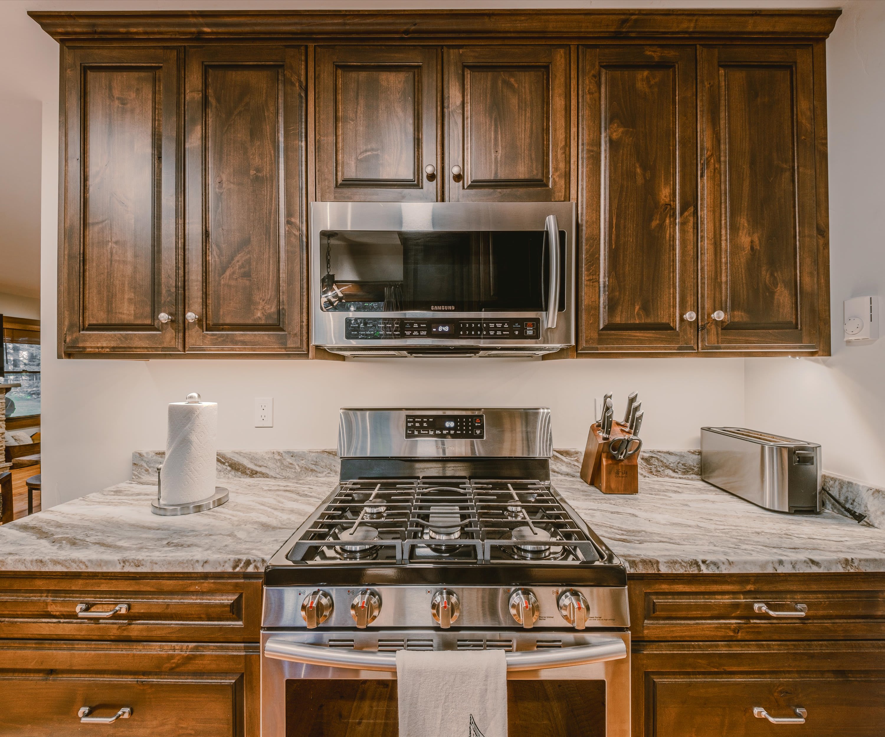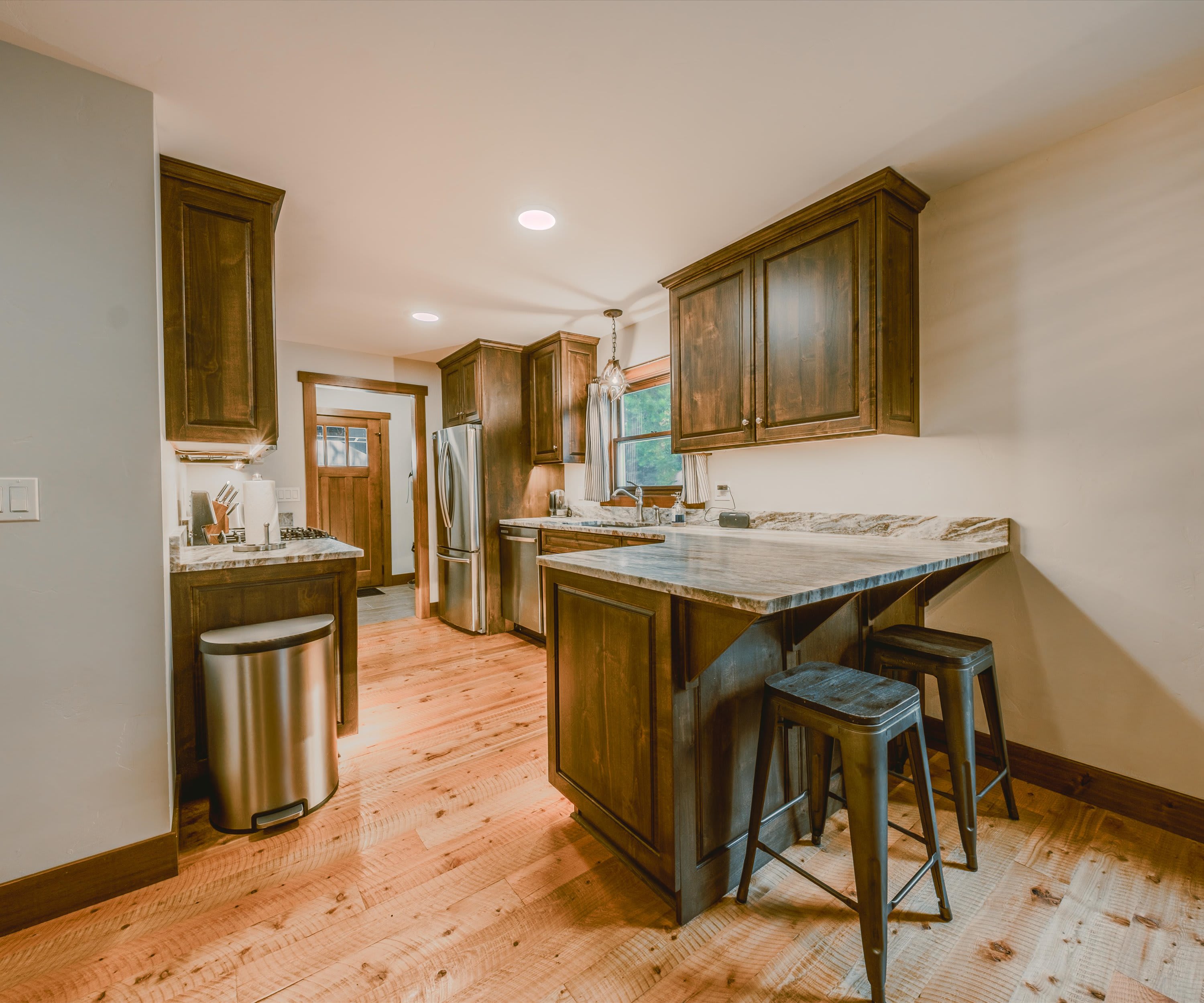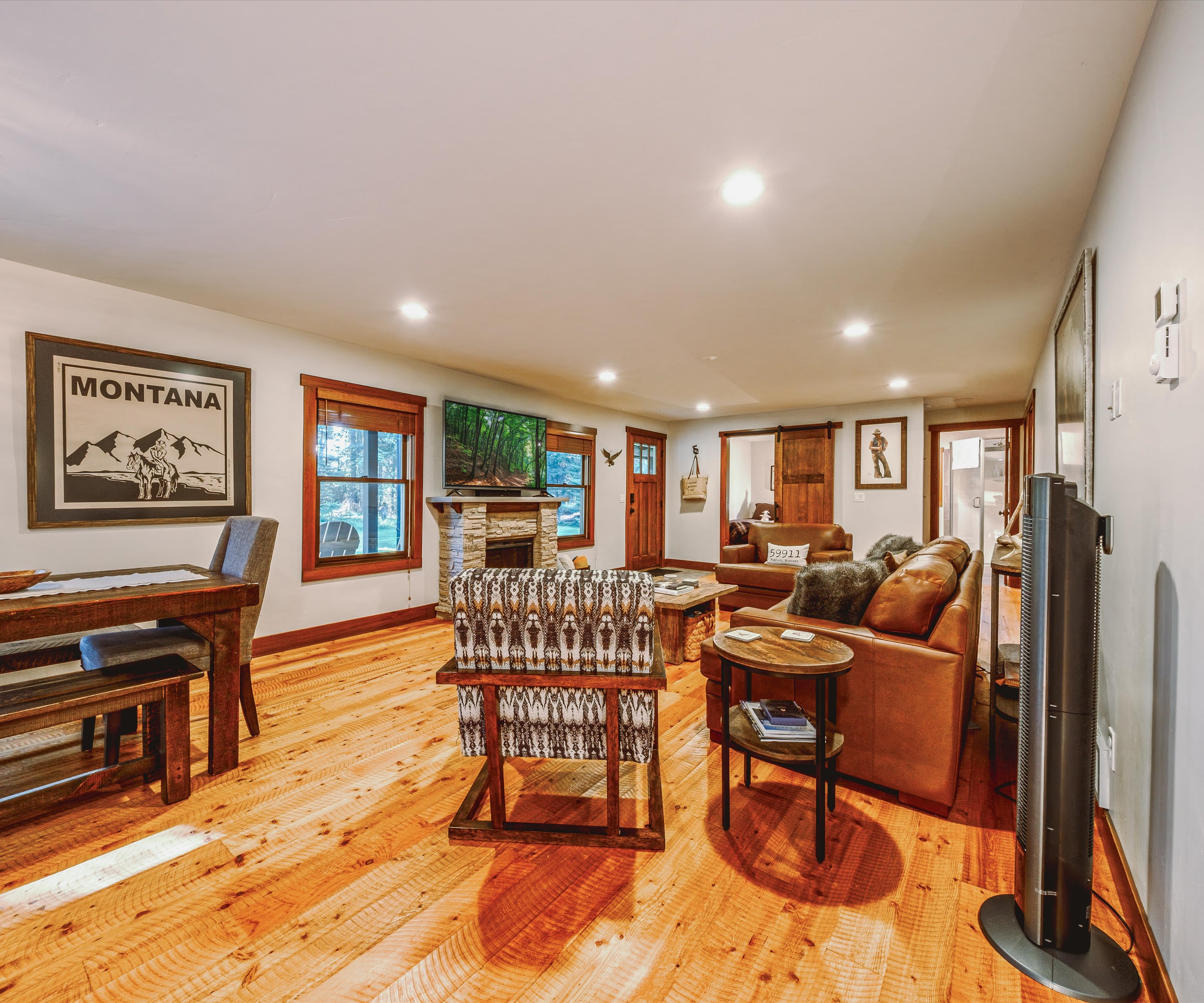 Step onto the covered front porch and settle into one of the cozy seats or gather around the picnic table for a casual meal in the fresh mountain air. Inside, the living room welcomes you with warmth and comfort—featuring a plush couch, two armchairs, an electric fireplace, and a smart TV perfect for movie nights or catching up on your favorite shows. A stack of board games is ready for family fun or cozy evenings in. The kitchen is a true highlight, with stainless steel appliances, rich cabinetry, drip coffee for your morning ritual, and counter seating for two. Share meals at the dining table for six, which includes two chairs and two benches for a relaxed, family feel. Outside, the back deck offers a grill for evening cookouts, while the spacious yard invites you to gather around the firepit under Montana’s star-filled sky.