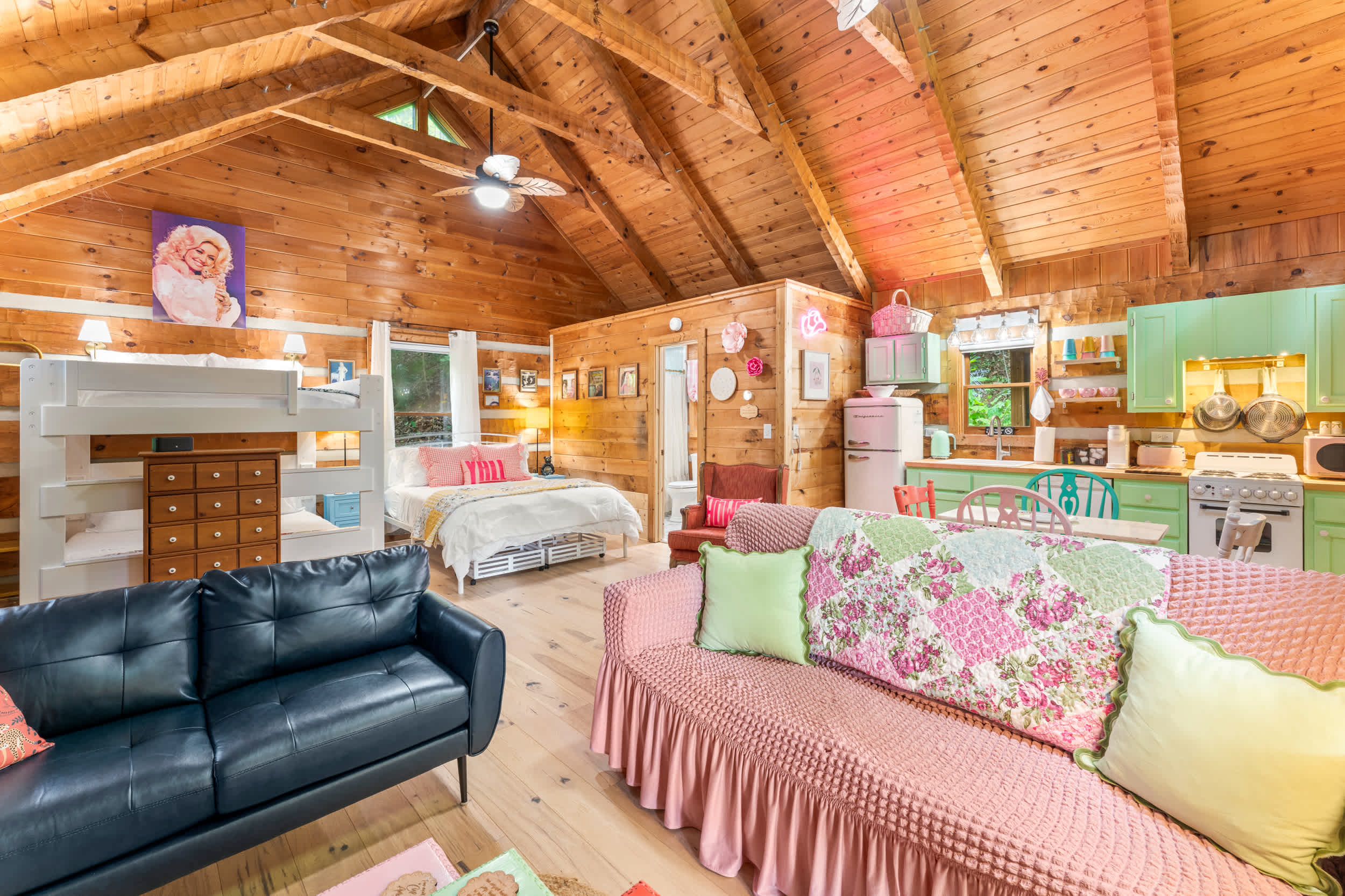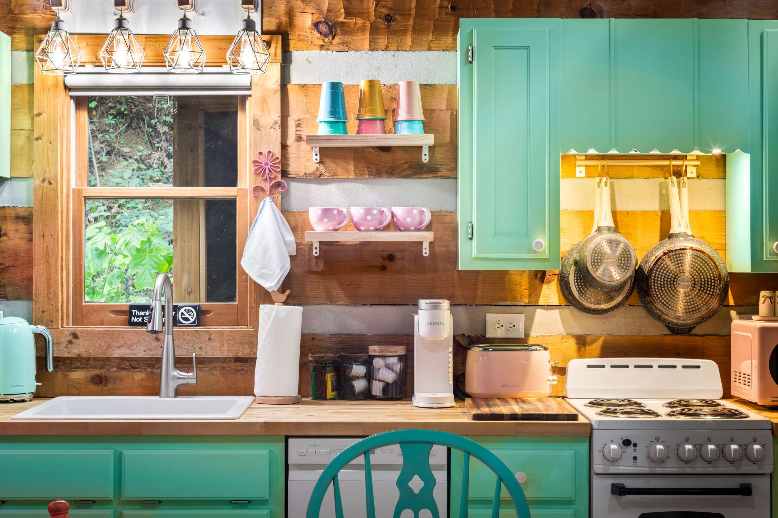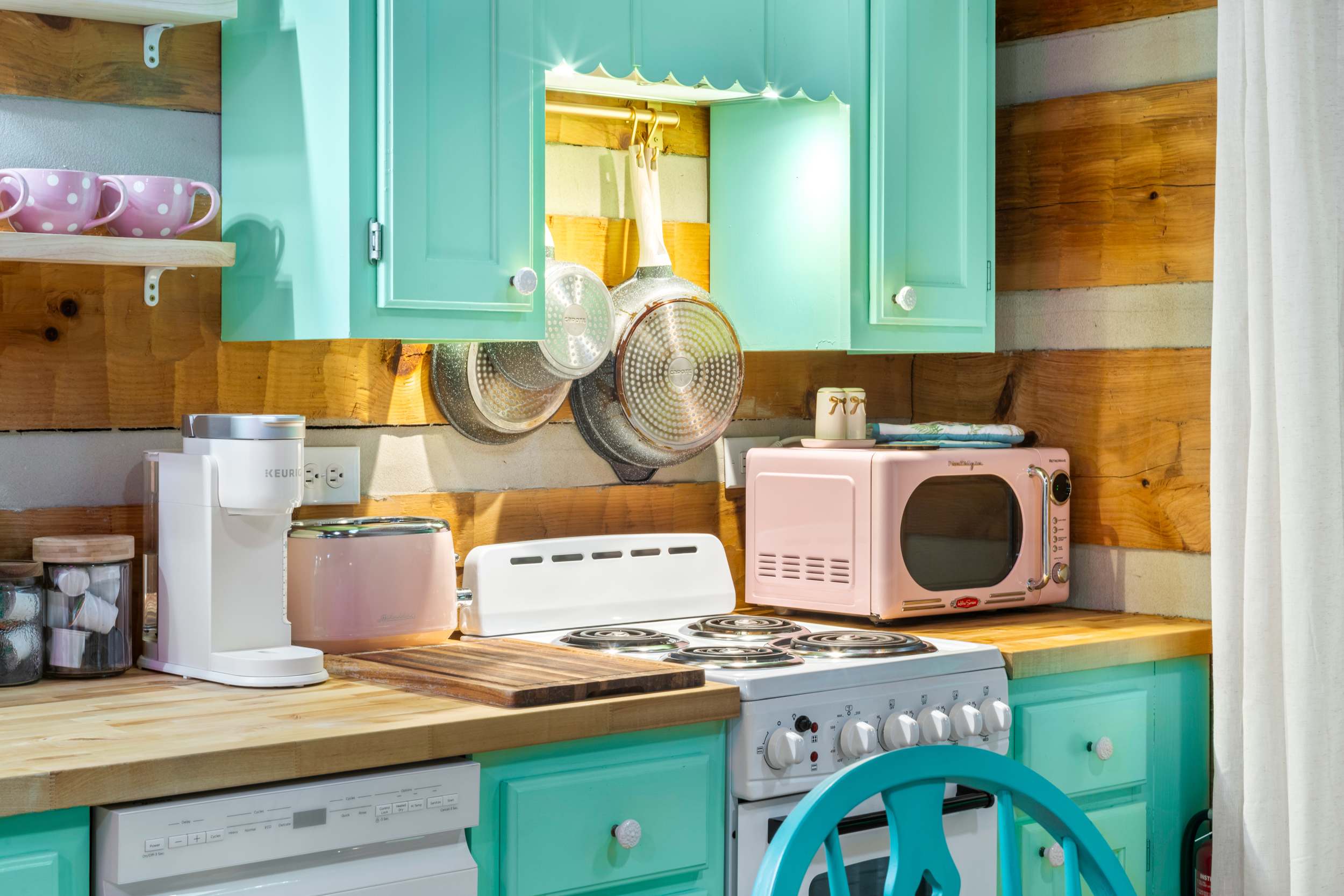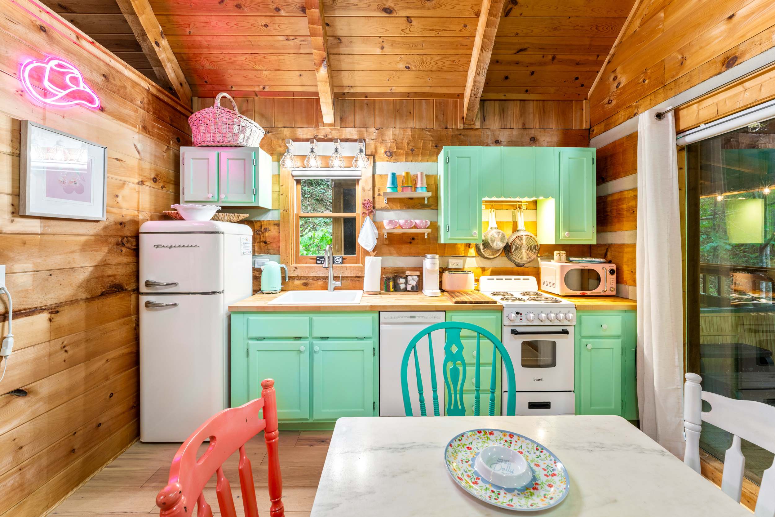 Step inside and you’ll find yourself wrapped in the warm, playful spirit of Dolly herself—bright accents, cheerful décor, and thoughtful touches that make every corner feel special. The open-concept living area offers plenty of seating for relaxing after exploring the Smokies, with big windows bringing in natural light and treetop views. The retro-style kitchen is stocked with smaller-scale appliances—perfect for making morning coffee, preparing snacks, or whipping up a home-cooked dinner without the fuss. Enjoy your meal indoors at the dining table for four, or head outside to dine al fresco on the spacious wraparound deck.