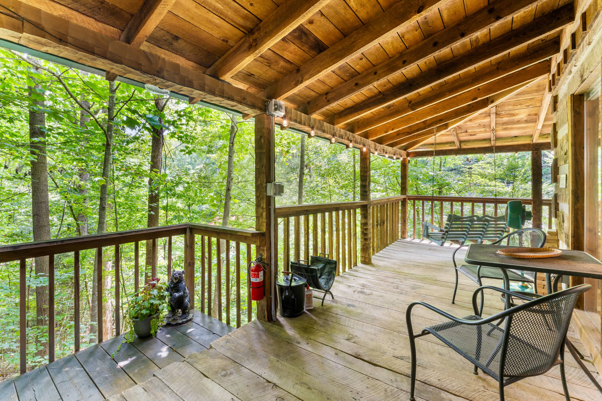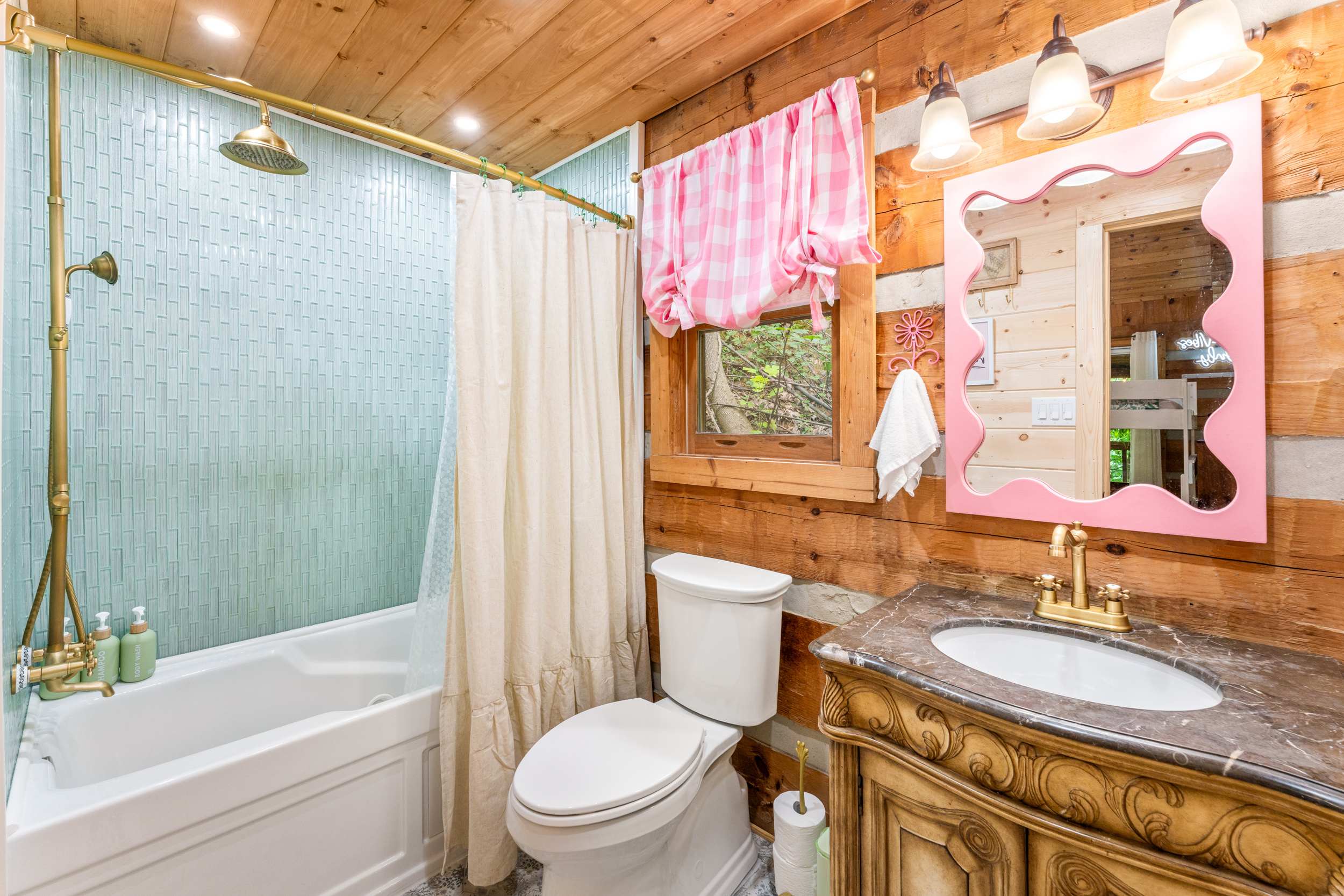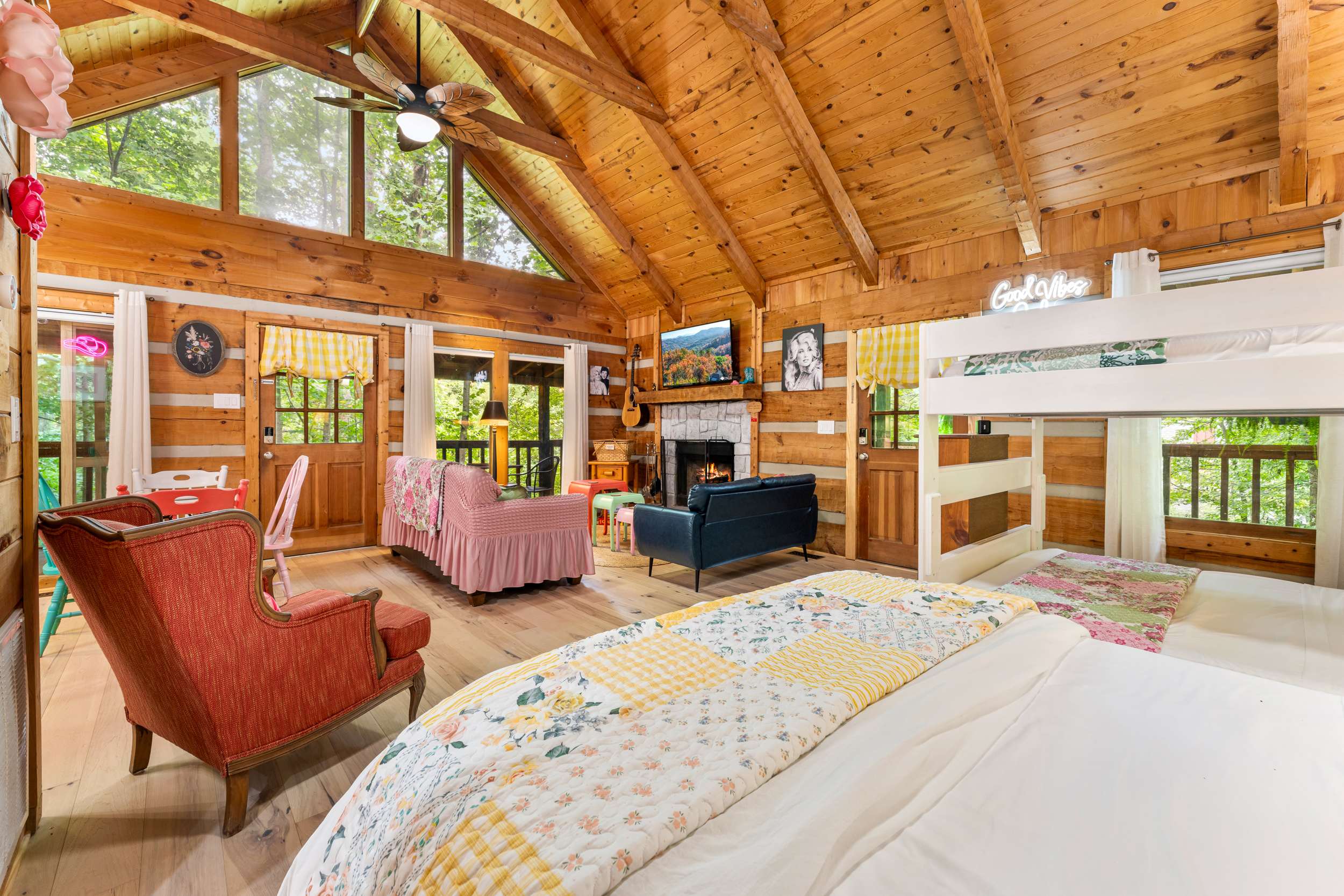 Step inside and you’ll find yourself wrapped in the warm, playful spirit of Dolly herself—bright accents, cheerful décor, and thoughtful touches that make every corner feel special. The open-concept living area offers plenty of seating for relaxing after exploring the Smokies, with big windows bringing in natural light and treetop views. The retro-style kitchen is stocked with smaller-scale appliances—perfect for making morning coffee, preparing snacks, or whipping up a home-cooked dinner without the fuss. Enjoy your meal indoors at the dining table for four, or head outside to dine al fresco on the spacious wraparound deck.