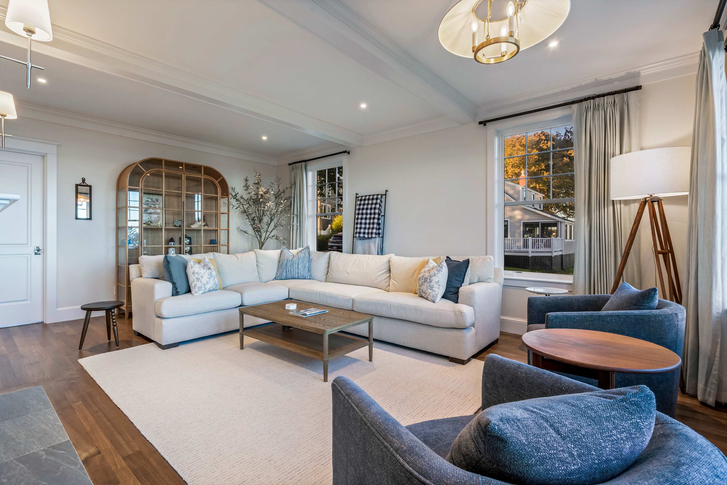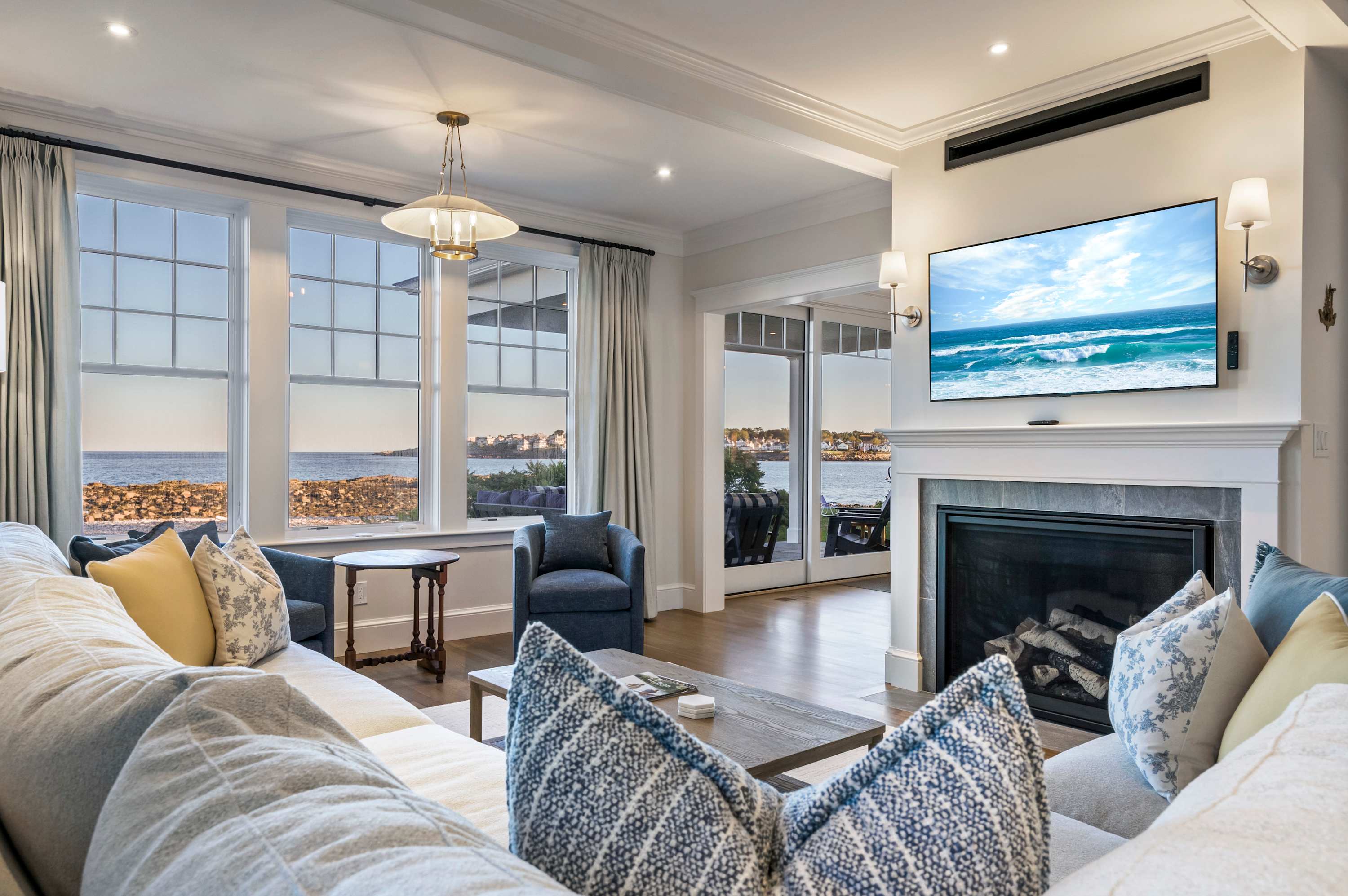 • Main living area with custom sectional, cozy chairs, smart TV, and gas fireplace