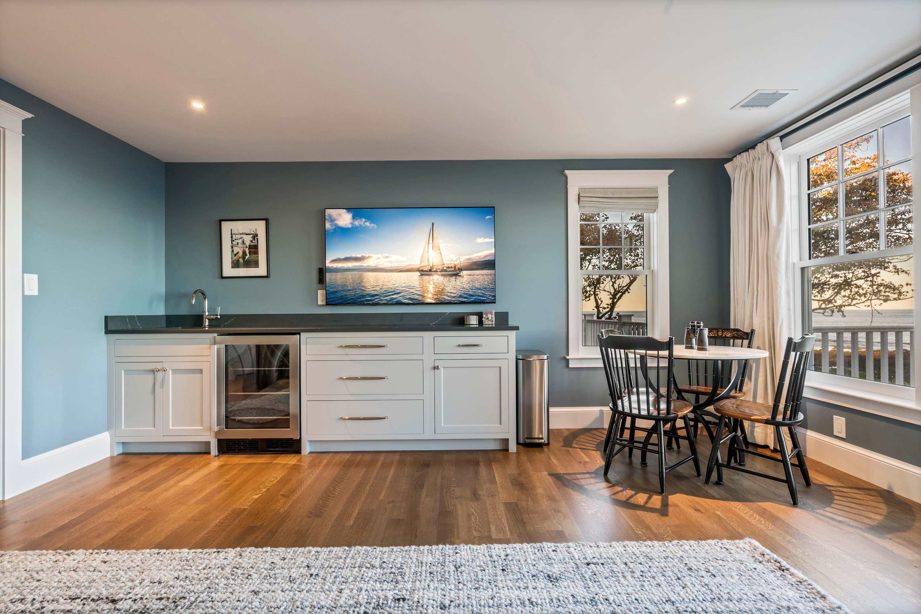 • Upstairs lounge with 65” smart TV, wet bar, beverage fridge, and game table