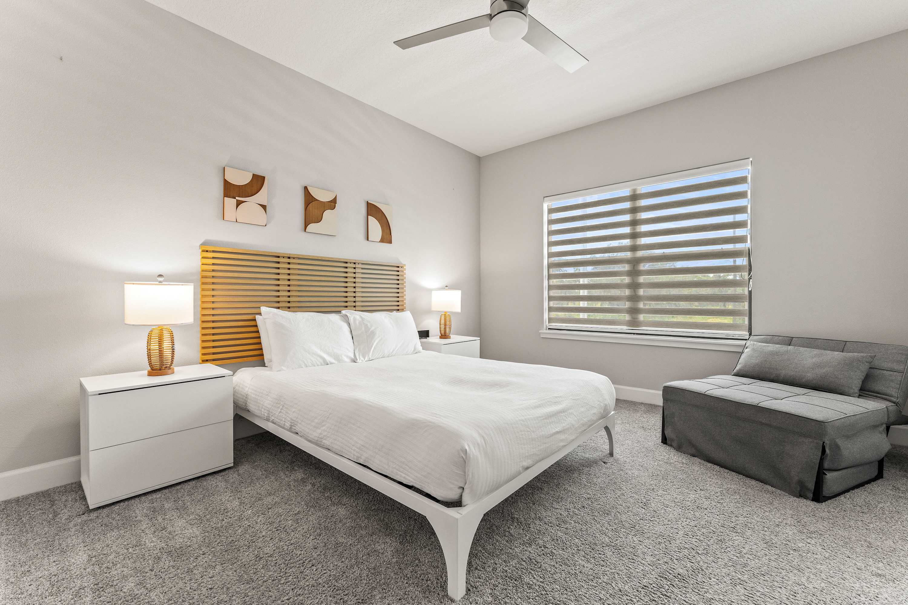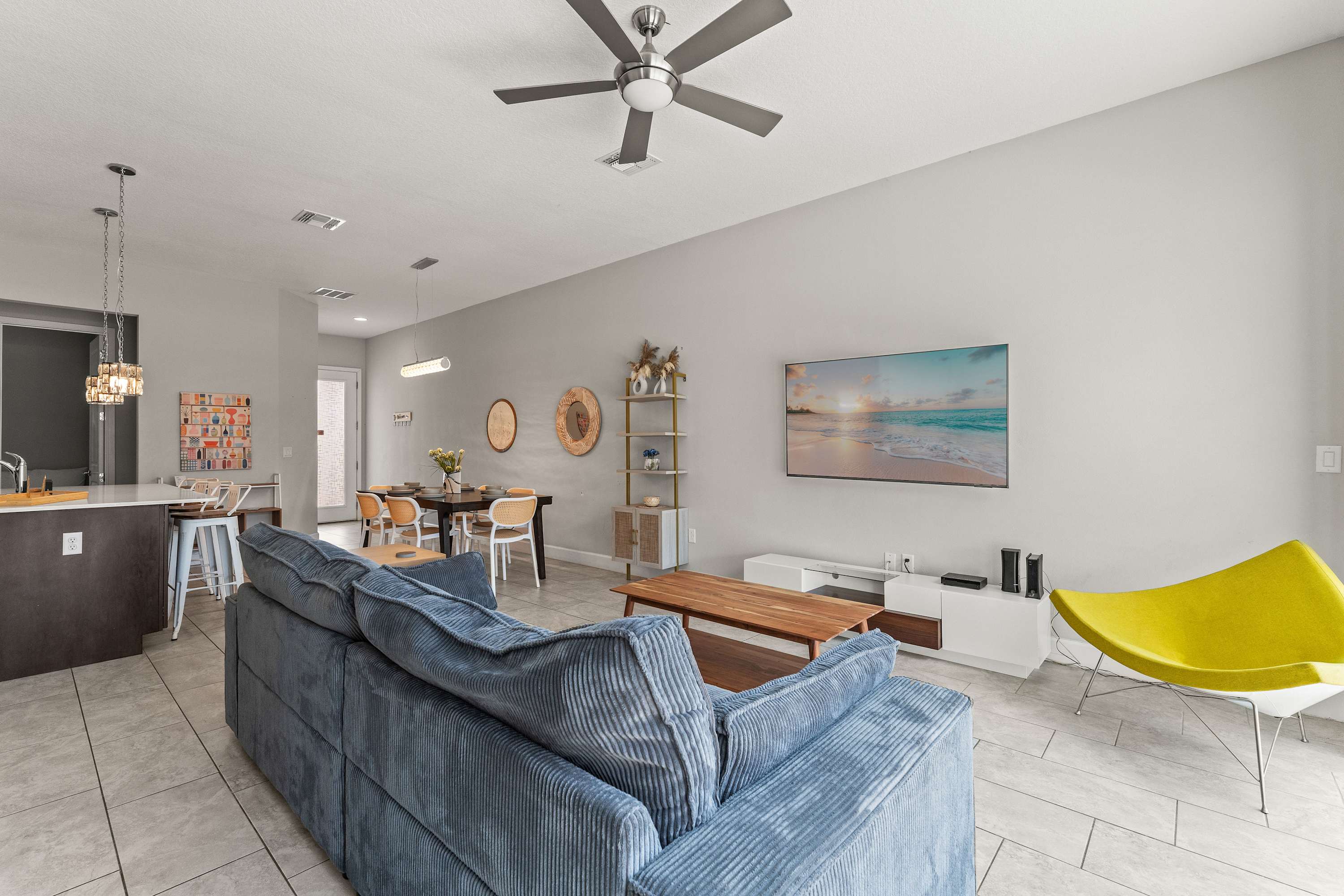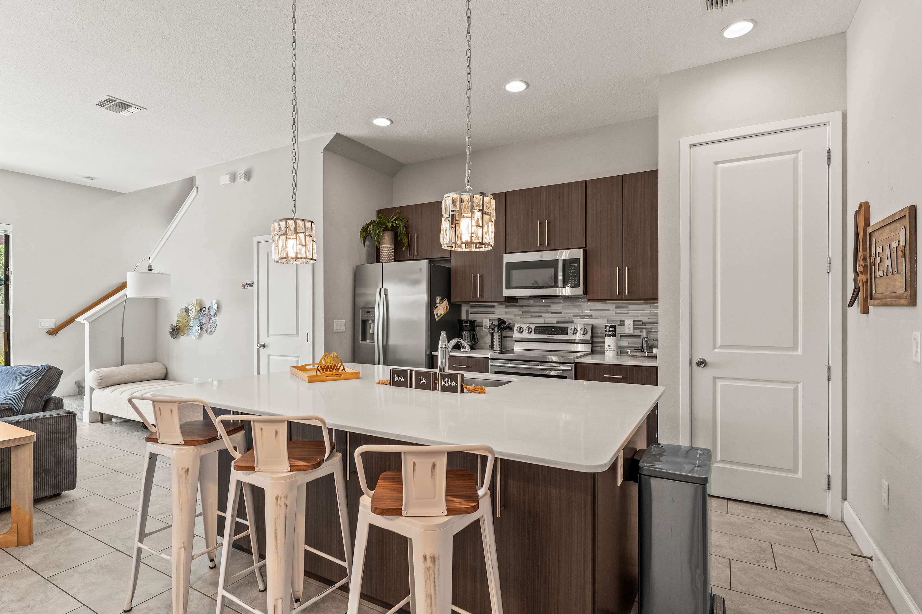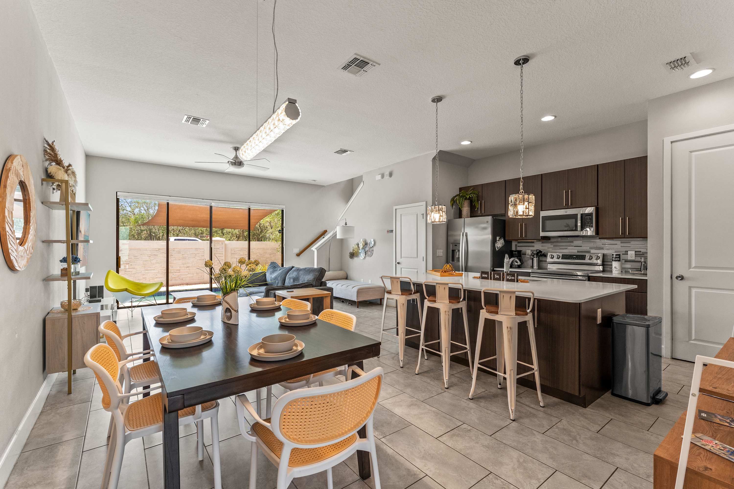 Step inside your contemporary retreat and discover an open living, kitchen, and dining space perfect for spending time together. In the living room, an oversized couch, modern chair, daybed, and smart TV invite you to unwind after a day of adventure. The sleek kitchen features dark grey and brown wood cabinetry topped with white stone counters, a custom backsplash, stainless steel appliances, and an oversized island with a sink and counter seating for three. Enjoy meals at the dining table for six, or head upstairs to the loft where a sofa and smart TV offer an extra spot to relax. Outside, your private patio awaits with a sparkling pool, lounge chairs, and a grill—ideal for sunny afternoons and evening cookouts.